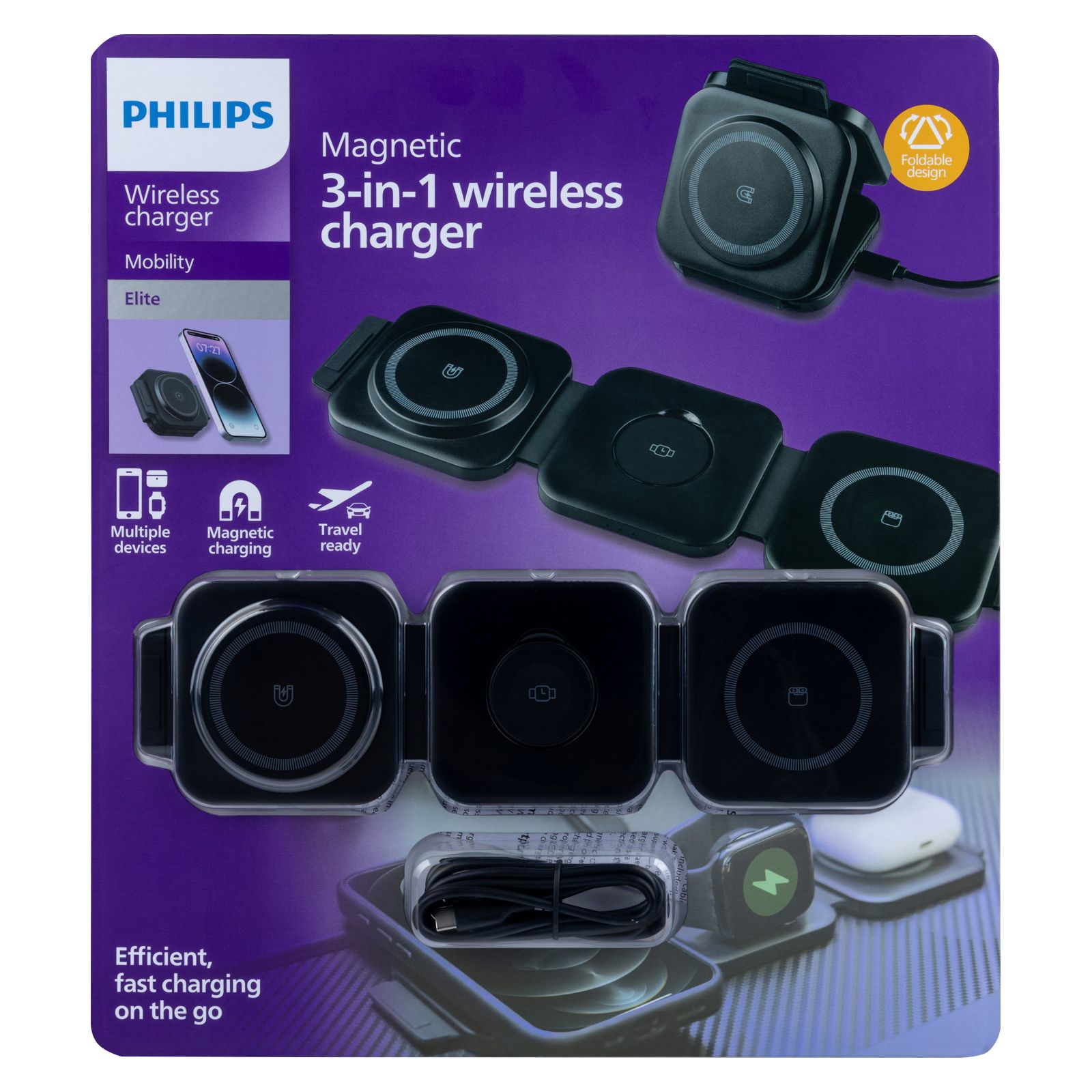 Triple the convenience of your favorite devices with the Philips 3-in-1 Foldable Wireless Charger. It’s perfect for simultaneous on-the-go charging of your must-have electronics. The wireless charger provides magnetic output of up to 15 W for smartphones, 5 W for earbuds, and 2.5 W for smartwatches. Whether you have the latest iPhone models, a wide variety of Android phones from Google, Samsung, Motorola, and more, you have the power to stay connected without being attached. Keep the beat going with your wireless-enabled headphones, like AirPods, JBL, Bose, Galaxy Buds, and more. Smartwatch brands with compatible options include Samsung, Apple, and Huawei, to name a few. When folded, it is compact enough to fit in backpacks, carry-on luggage, handbags, laptop bags, and more. You’re no longer burdened by multiple cords, plugs, and adapters. Simply plug in a USB cable to the multipurpose charger, connect to a 5 V/2 A minimum USB-A adapter (not included), and place your devices in the designated areas to quickly revive your devices. To optimize charging, connect the charger with a USB-C-to-USB-C cable and USB-PD 30 W power supply — both sold separately. Take charge of any space with the Philips 3-in-1 Foldable Wireless Charger.