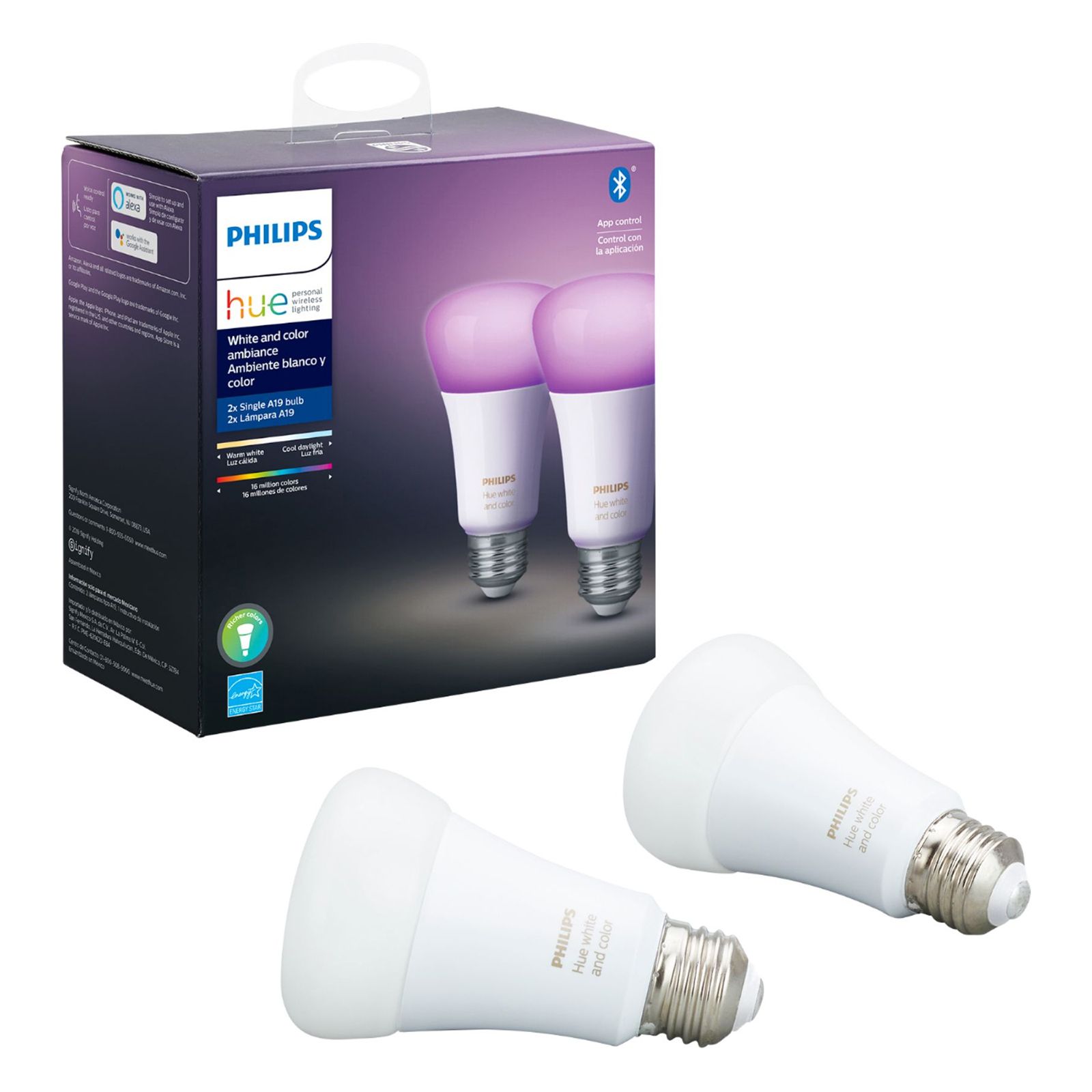 Philips Hue White and Color Ambiance A19 Smart Bulbs, 2 pk.