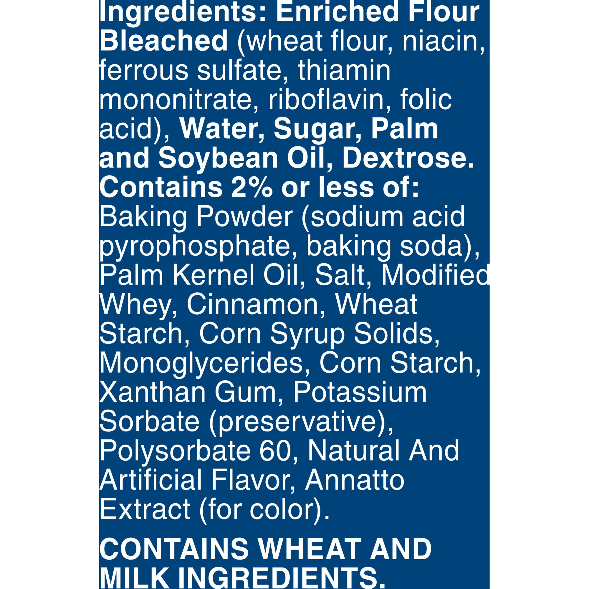 Ingredients: Enriched Flour Bleached (wheat flour, niacin, ferrous sulfate, thiamin mononitrate, riboflavin, folic acid), Water, Sugar, Palm and Soybean Oil, Dextrose, Wheat Starch. Contains 2% or less of: Baking Powder (sodium acid pyrophosphate, baking soda), Palm Kernel Oil, Salt, Modified Whey, Corn Syrup Solids, Cinnamon, Monoglycerides, Xanthan Gum, Potassium Sorbate (preservative), Polysorbate 60, Corn Starch, Natural and Artificial Flavor, Annatto Extract (for color).