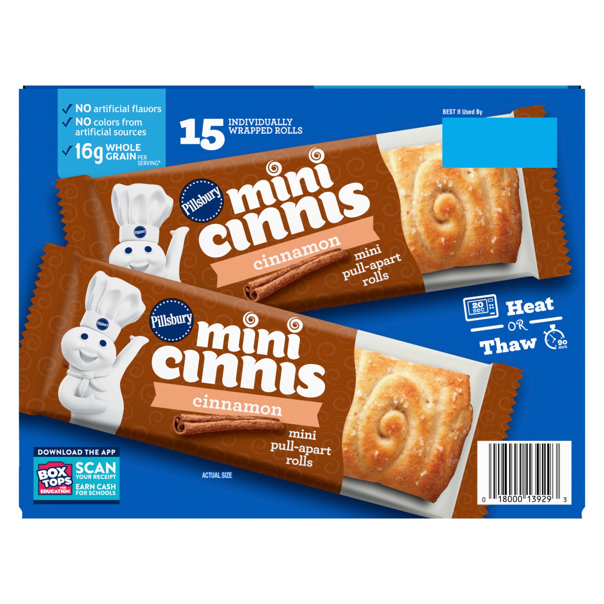 Cinnamon Mini Cinnis: Mini pull-apart cinnamon rolls serve up big smiles every time; They're the same ones enjoyed in schools, with Pillsbury dough outside and yummy cinnamon filling inside; Store in the freezer until you're ready
