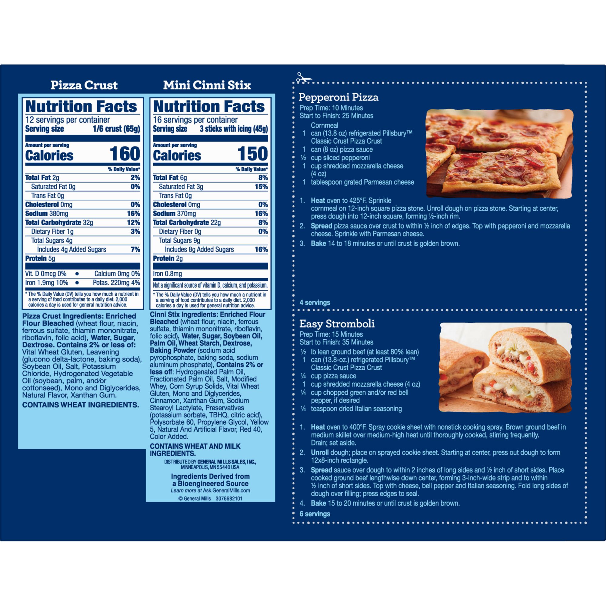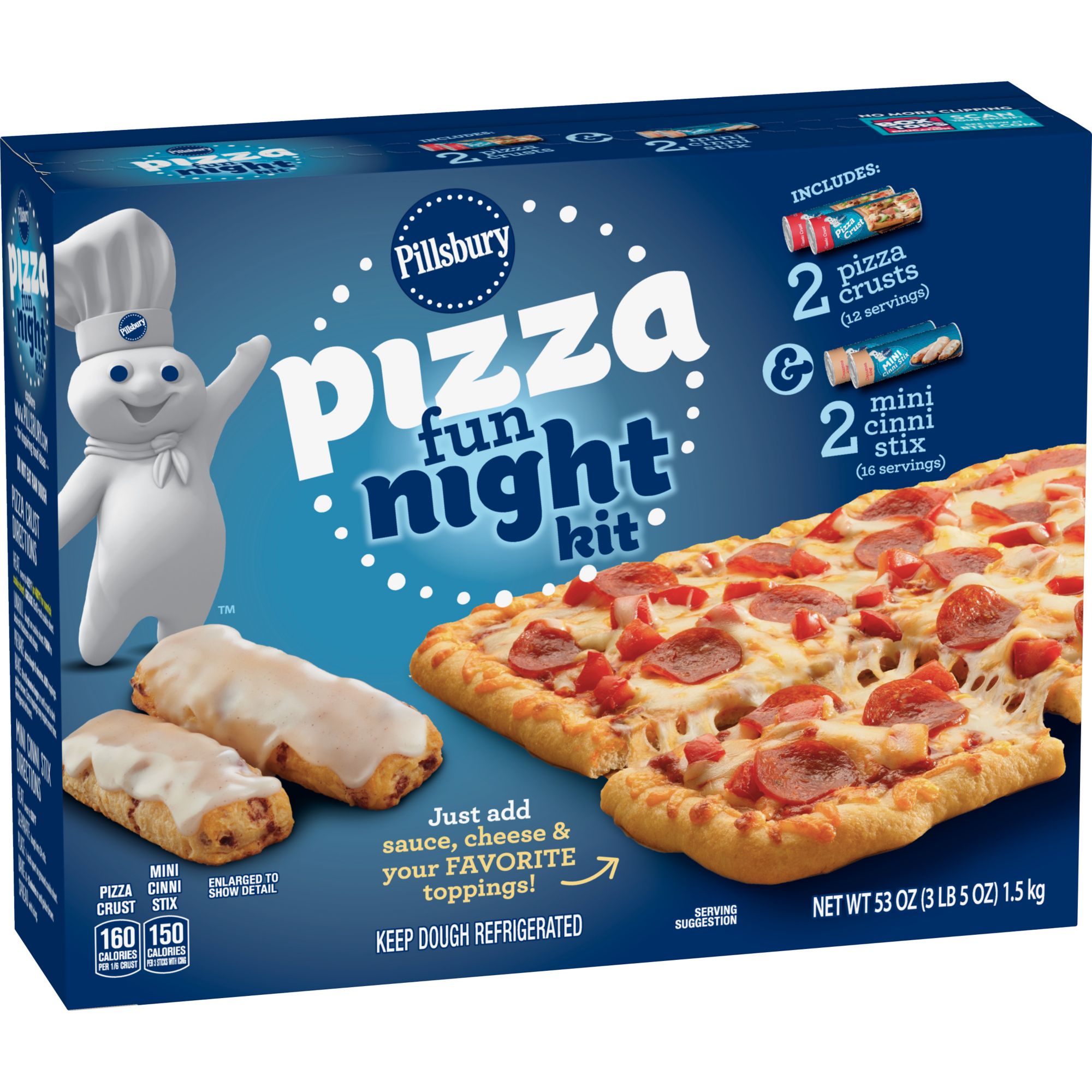 Pillsbury Pizza Night Kit contains two pizza crusts (12 servings) and two mini cinni stix (16 servings).