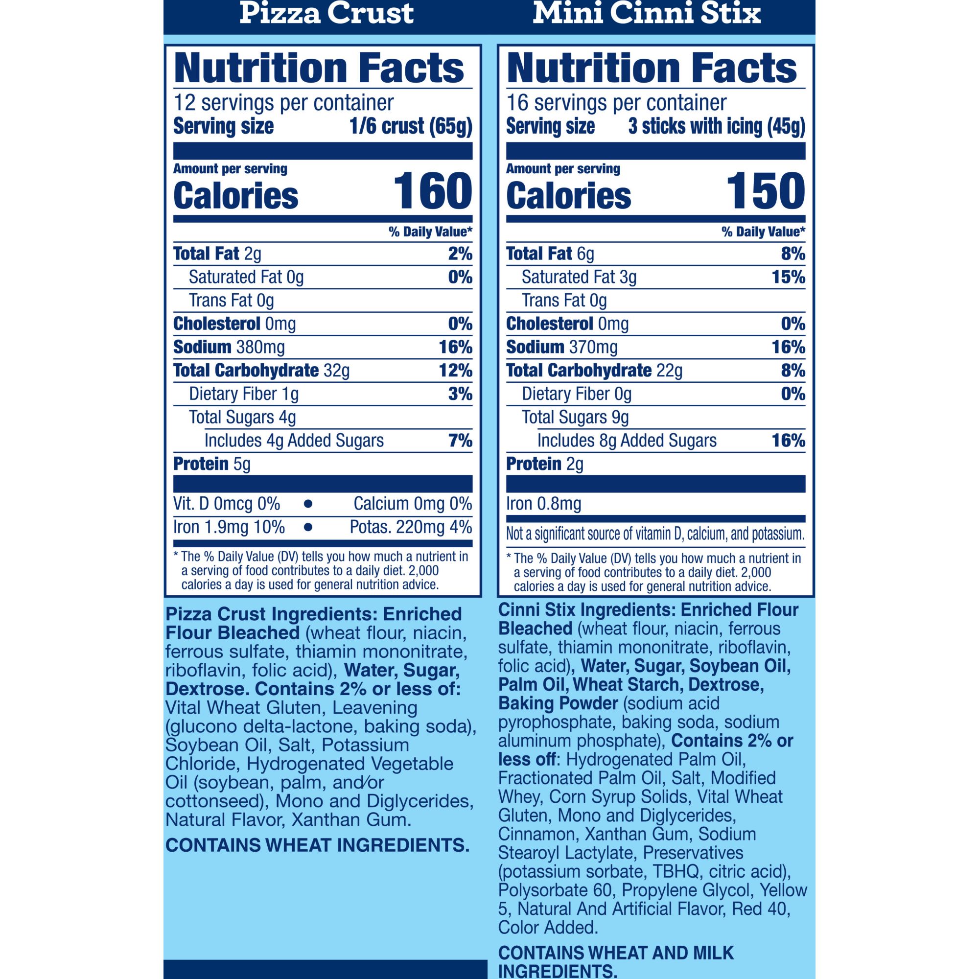Pizza Crust Ingredients: Enriched Flour Bleached (Wheat Flour, Niacin, Ferrous Sulfate, Thiamin Mononitrate, Riboflavin, Folic Acid), Water, Sugar, Dextrose. Contains 2% or Less of Vital Wheat Gluten, Leavening (Glucono Delta-lactone, Baking Soda), Soybean Oil, Salt, Potassium Chloride, Hydrogenated Vegetable Oil (Soybean, Palm, and/or Cottonseed), Mono and Diglycerides, Natural Flavor, Xanthan Gum. Cinna Stix Ingredients: Enriched Flour Bleached (Wheat Flour, Niacin, Ferrous Sulfate, Thiamin Mononitrate, Riboflavin, Folic Acid), Water, Sugar, Soybean Oil, Palm Oil, Wheat Starch, Dextrose, Baking Powder (Sodium Acid Pyrophosphate, Baking Soda, Sodium Aluminum Phosphate), Contains 2% or Less Off Hydrogenated Palm Oil, Fractionated Palm Oil, Salt, Modified Whey, Corn Syrup Solids, Vital Wheat Gluten, Mono and Diglycerides, Cinnamon, Xanthan Gum, Sodium Stearoyl Lactylate, Preservatives (Potassium Sorbate, TBHQ, Citric Acid), Polysorbate 60, Propylene Glycol, Yellow 5, Natural and Artificial Flavor, Red 40, Color Added