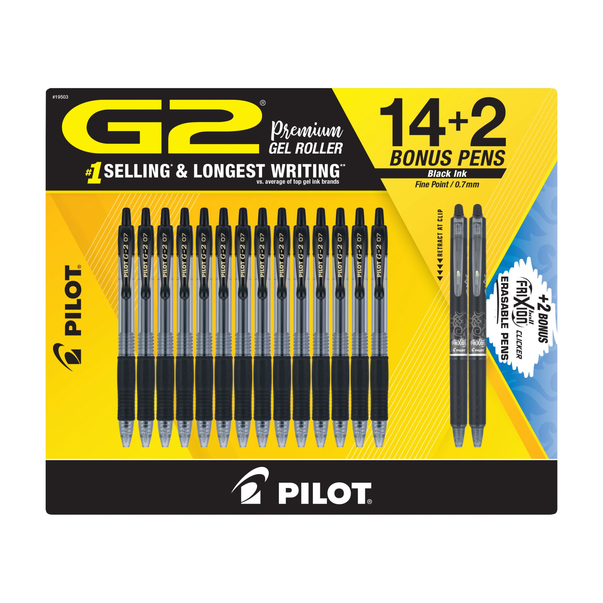 Includes 14 black G2 gel ink pens, and two bonus black FriXion erasable gel ink pens