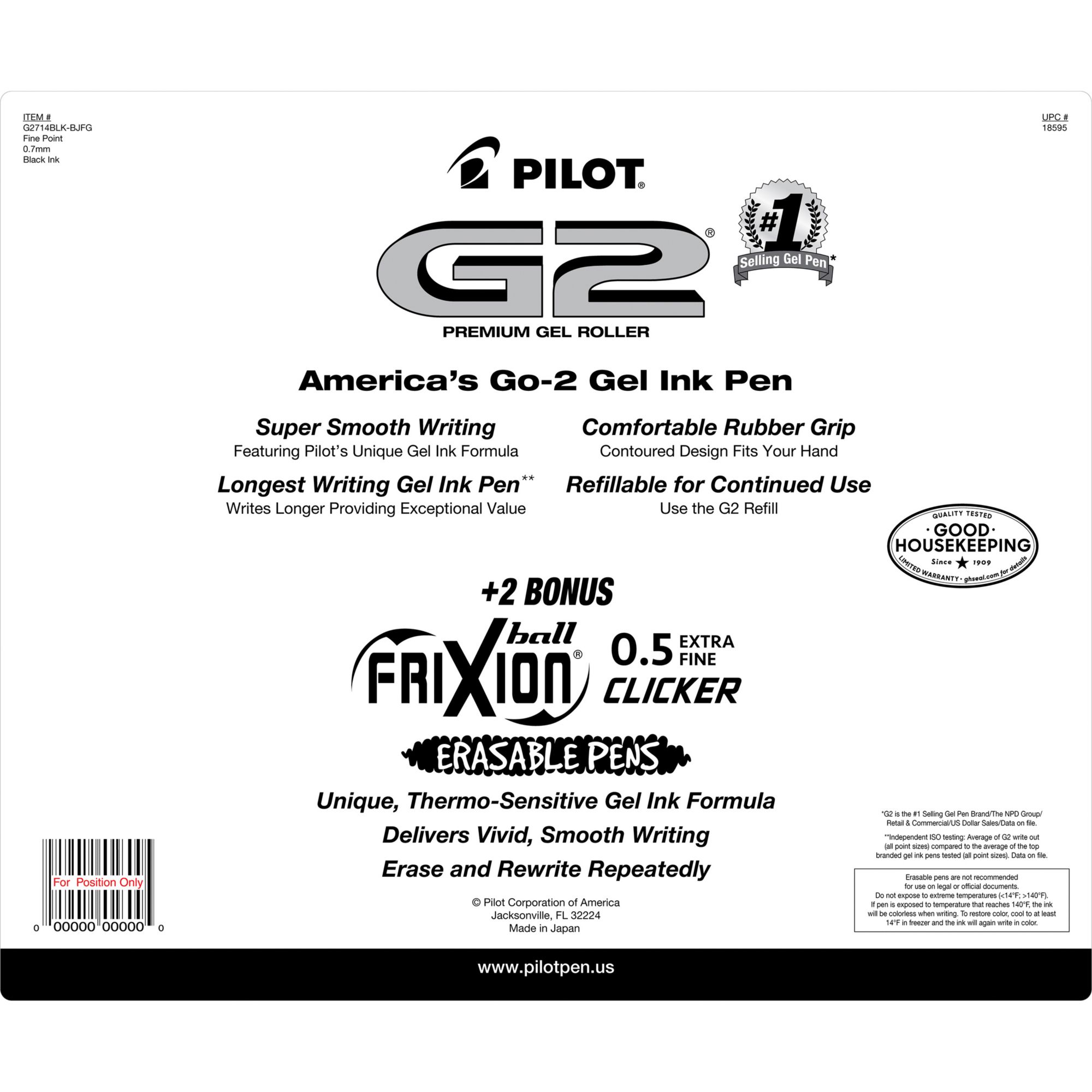 The G2 premium gel ink pen from Pilot is the ultimate pen for the everyday overachiever. Pilot's G2 is the #1 selling gel ink brand in America, proven to last longer than the average of competitive gel ink brands (NPD, 2021). Whether you're taking notes at school, staying organized at home, or jotting down ideas at work, you can rely on G2 for a smooth, long-lasting and comfortable writing experience. And, with 2 bonus FriXion erasable pens, your writing can also be stress-free and mistake-free. FriXion's premium gel ink writes smooth and erases clean with thermo-sensitive technology, so you can write, erase, and re-write without damaging documents.