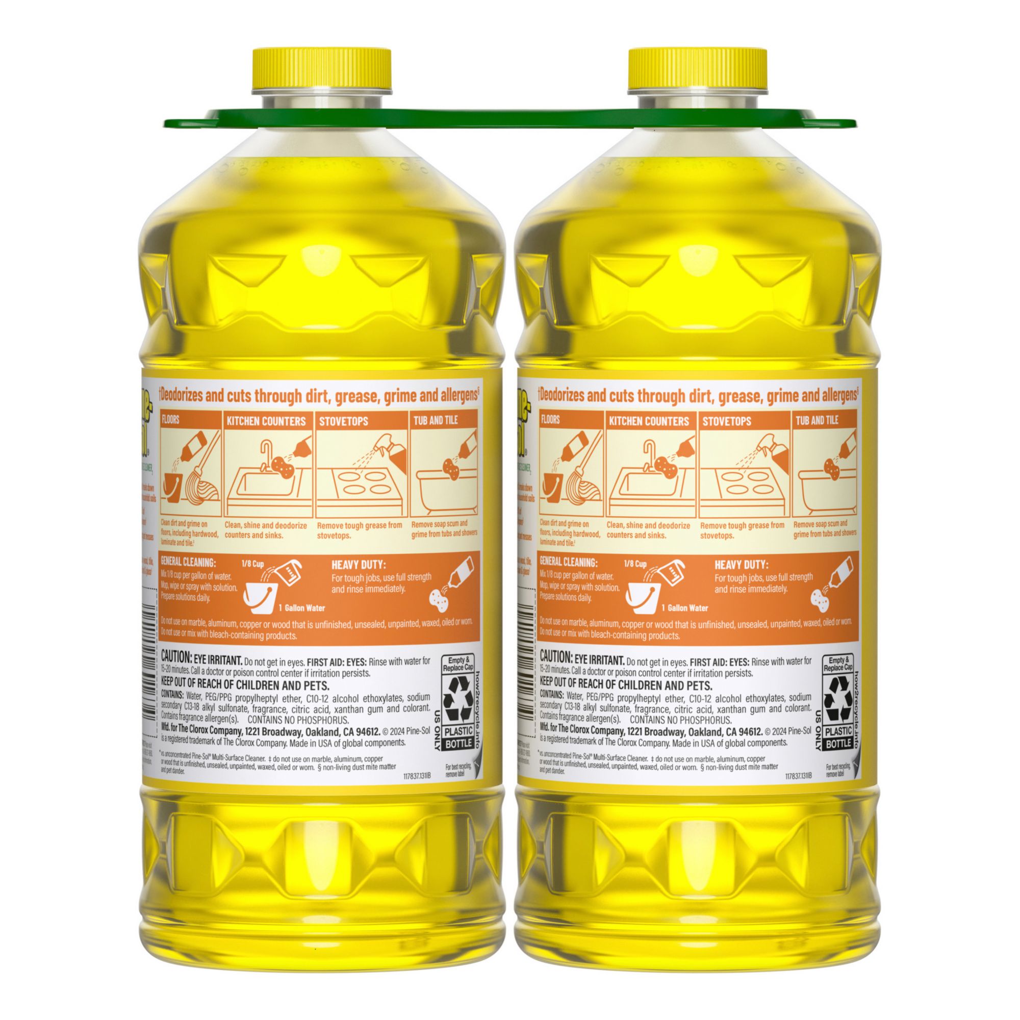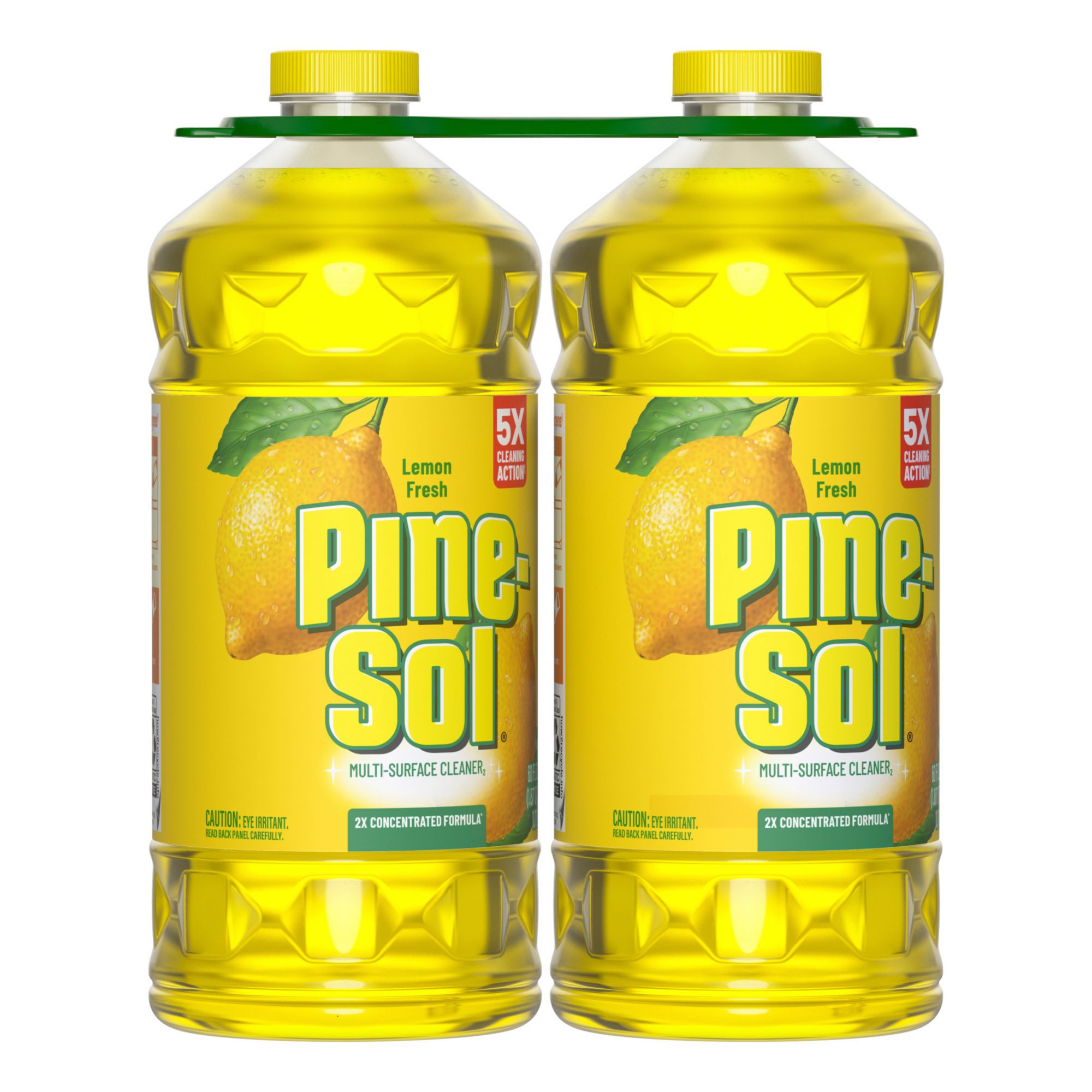 5X CLEANING ACTION: Pine-Sol Multi-Surface Cleaner works hard so you don’t have to; it deodorizes, cuts through grease, removes grime, tackles tough dirt and removes 99% of allergens (1) LEMON FRESH SCENT: Revitalize your home with a fresh squeezed citrus fragrance; This Lemon Fresh scent is a delightful sensory experience that transports you to sundrenched lemon grove MULTI-SURFACE CLEANER: Suitable for use on a variety of surfaces like finished wood, tile, stone, porcelain and more; use on countertops, sinks, garbage disposals, floors, furniture, walls and tubs VALUE: One 60 fl. oz. bottle of Pine-Sol Multi-Surface Cleaner makes up to 60 gallons of cleaning solution, helping you tackle even the biggest cleaning jobs 2X CONCENTRATED FORMULA (2): Power through tough dirt, grease and grime with this 2X concentrated formula compared to unconcentrated Pine-Sol Multi-Surface Cleaner Includes 2 bottles with 60 fl. oz. each