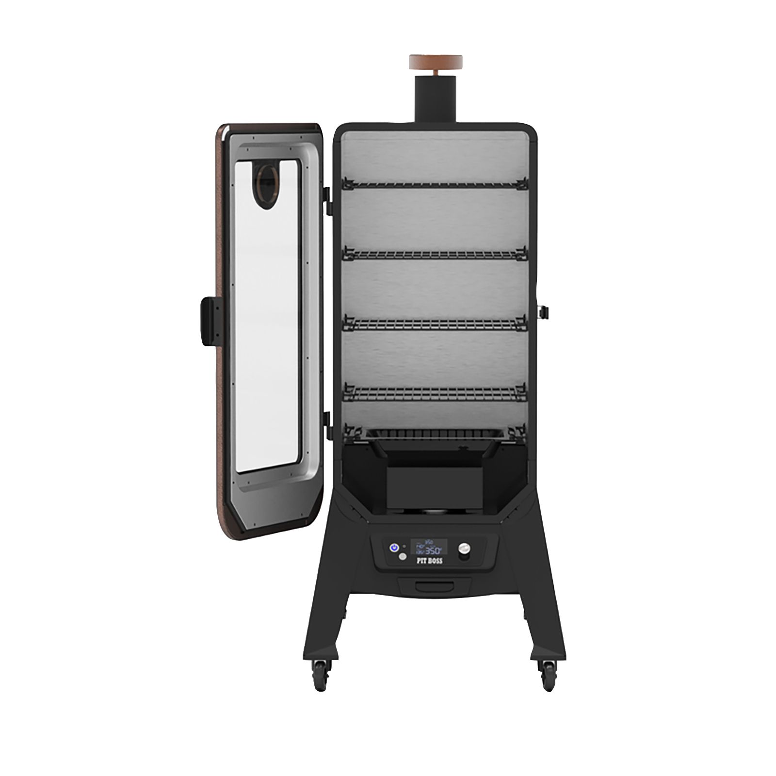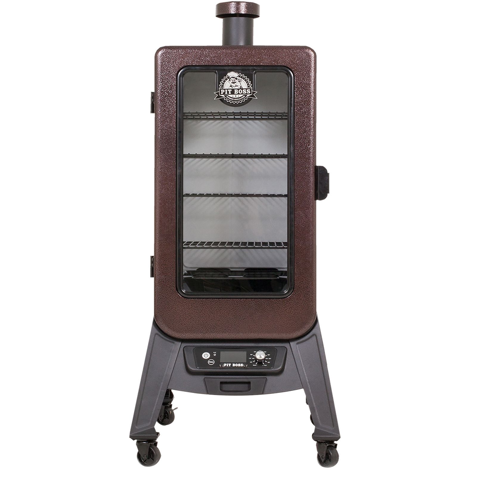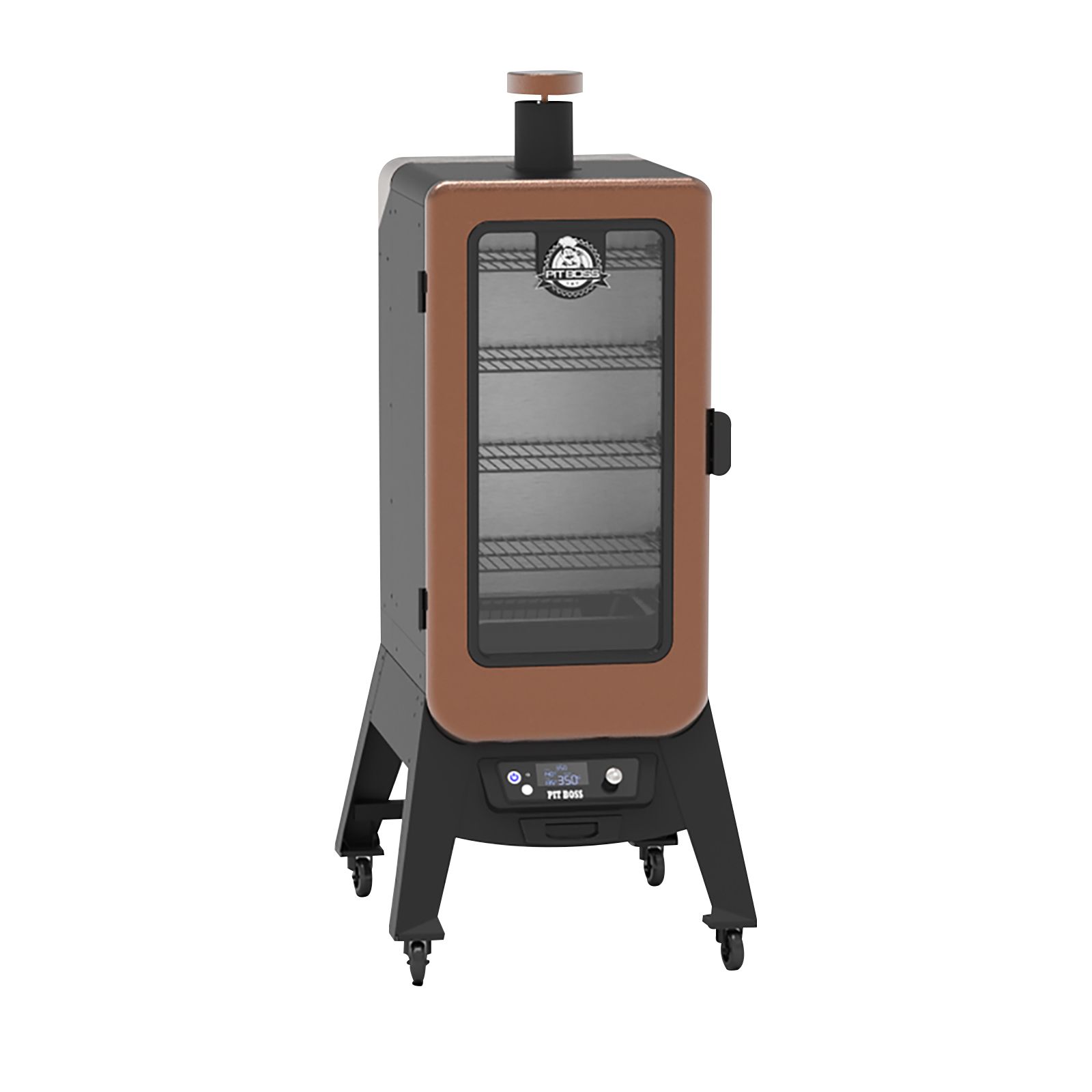 Innovation meets the outdoors with the Pit Boss 3 Series Wood Pellet Vertical Smoker. Never before has smoking been this versatile. The double walled insulation lets you smoke from 150°F to temperatures reaching 421°F, unlike any other smoker on the market today. The large front window eliminates the need for peek-a-boo cooking and its elevated frame makes transferring your meal from the smoker to the table a breeze. With the PB 3 Series pellet smoker, there is no need to fret about cooking lengths. Its large hopper allows you to cook for up to 18 hours and its sleek design is not only unique, it is also functional. The Pit Boss 3 Series Wood Pellet Vertical Smoker features 721-sq.-in. of porcelain coated cooking racks, locking caster wheels, an easy to read digital controller and a stunning hammer tone copper finish. The multiple position racking system ensures you’ll have enough room to smoke anything.
