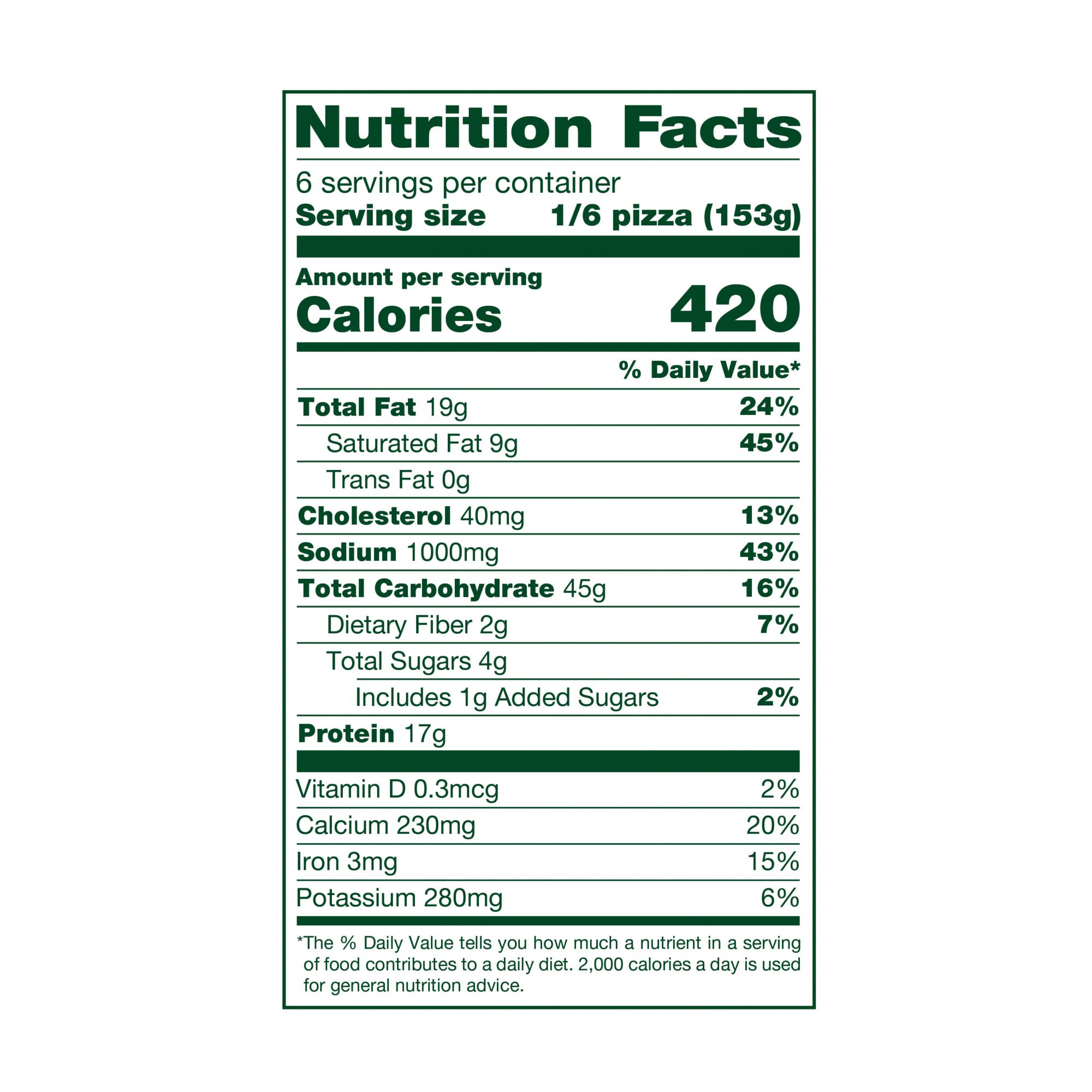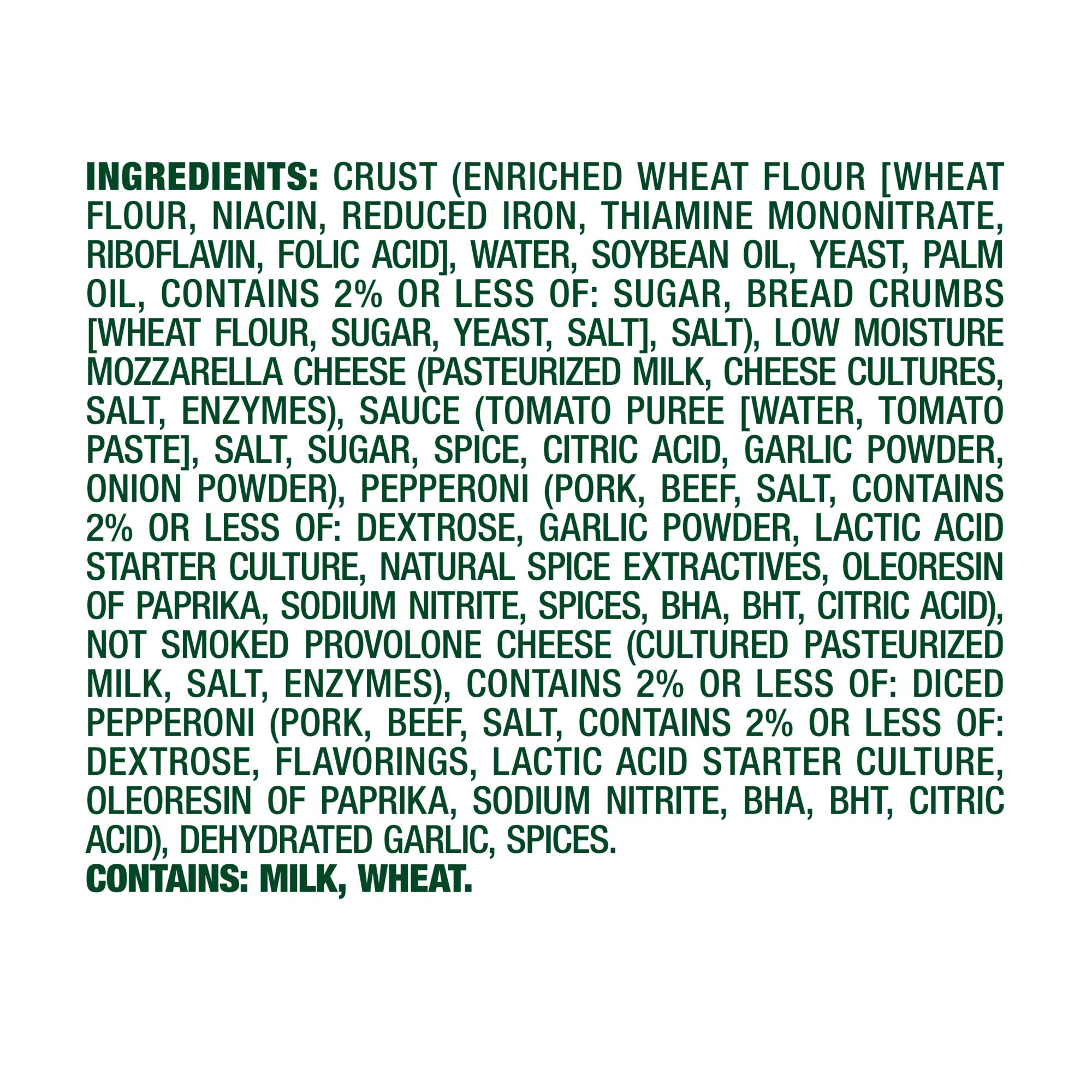 Ingredients: Crust (Enriched Wheat Flour [Wheat Flour, Niacin, Reduced Iron, Thiamine Mononitrate, Riboflavin, Folic Acid], Water, Soybean Oil, Yeast, Palm Oil, Contains 2% Or Less Of: Sugar, Bread Crumbs [Wheat Flour, Sugar, Yeast, Salt], Salt), Low Moisture Mozzarella Cheese (Pasteurized Milk, Cheese Cultures, Salt, Enzymes), Sauce (Tomato Puree [Water, Tomato Paste], Salt, Sugar, Spice, Citric Acid, Garlic Powder, Onion Powder), Pepperoni (Pork, Beef, Salt, Contains 2% Or Less Of: Dextrose, Garlic Powder, Lactic Acid Starter Culture, Natural Spice Extractives, Oleoresin Of Paprika, Sodium Nitrite, Spices, Bha, Bht, Citric Acid), Not Smoked Provolone Cheese (Cultured Pasteurized Milk, Salt, Enzymes), Contains 2% Or Less Of: Diced Pepperoni (Pork, Beef, Salt, Contains 2% Or Less Of: Dextrose, Flavorings, Lactic Acid Starter Culture, Oleoresin Of Paprika, Sodium Nitrite, Bha, Bht, Citric Acid), Dehydrated Garlic, Spices. Contains: Milk And Wheat.