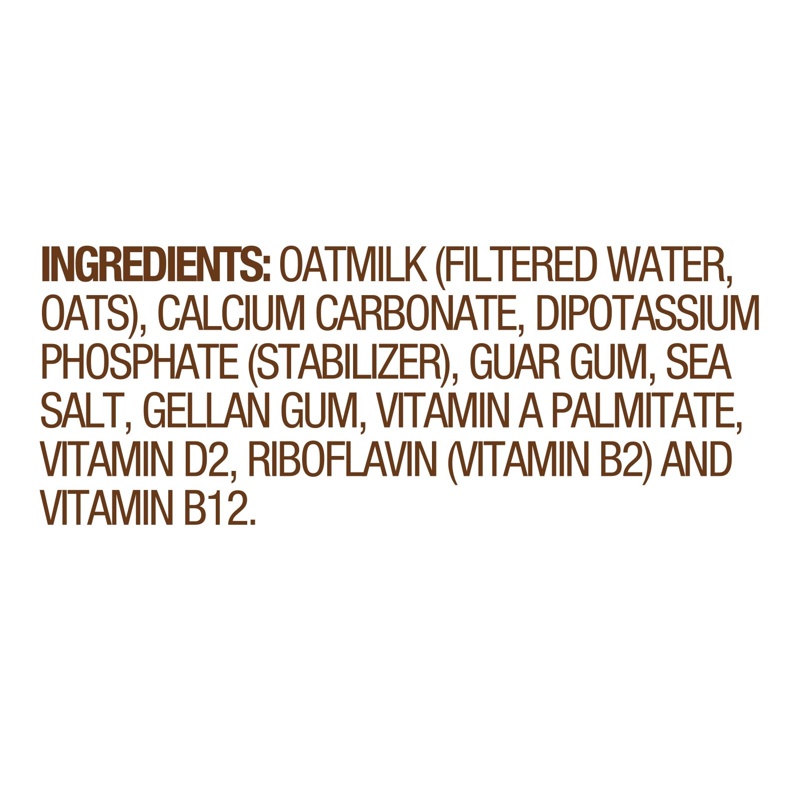 Ingredients: Oat Milk, Calcium Carbonate, Dipotassium Phosphate, Sea Salt, Gellan Gum, Vitamum A, D2, B2, B12.