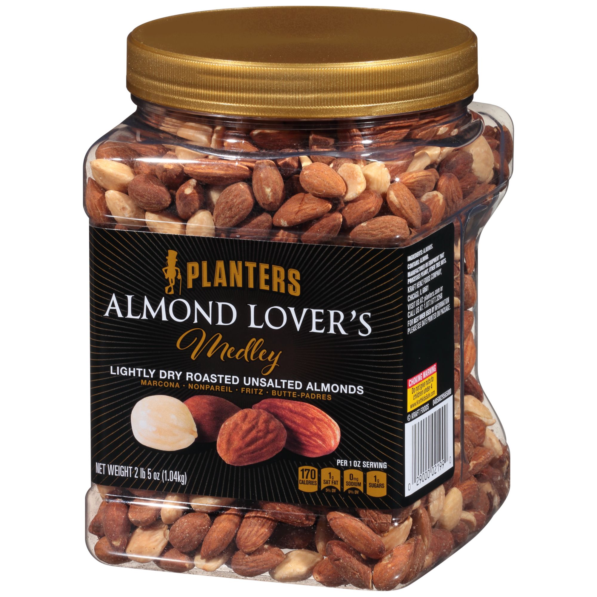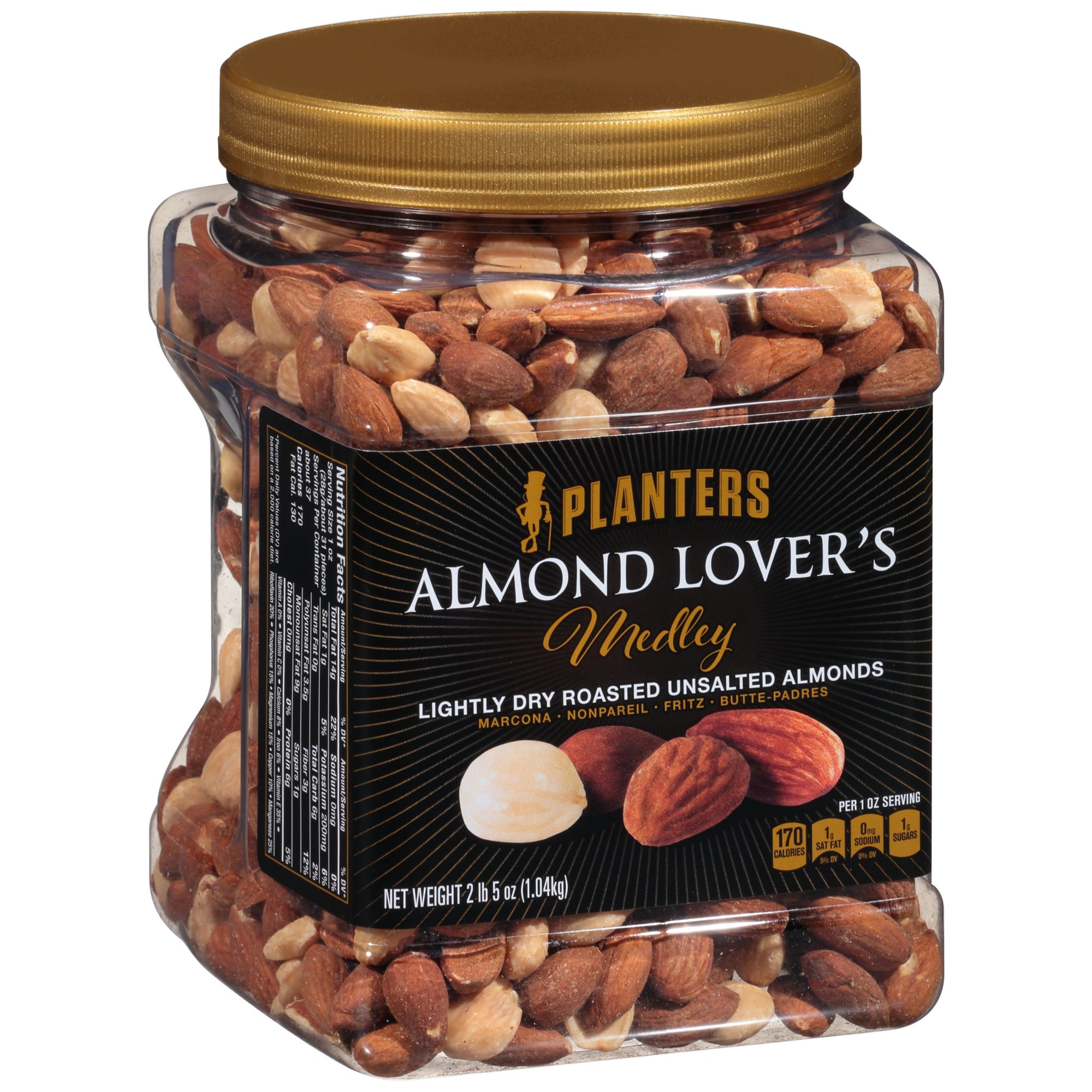 Planters Almond Lover's Medley, Dry Roasted Unsalted Almonds deliver a mix of four distinct almond varieties for a gourmet flavor experience. Marcona, Fritz, Nonpareil and Butte-padres almonds are lightly dry roasted to let the nuts' natural flavor shine. Cultivated in California, each of these whole almonds are carefully selected to create this top-quality snack. A classy choice for parties and get-togethers, these plain almonds are fresh and ready to eat with no added salt. Plus, with 170 calories per serving, these nuts are a smart pick for nutritious snacking. This resealable 37 oz. jar of almonds makes the perfect gift while maintaining that fresh crunch until the last handful.