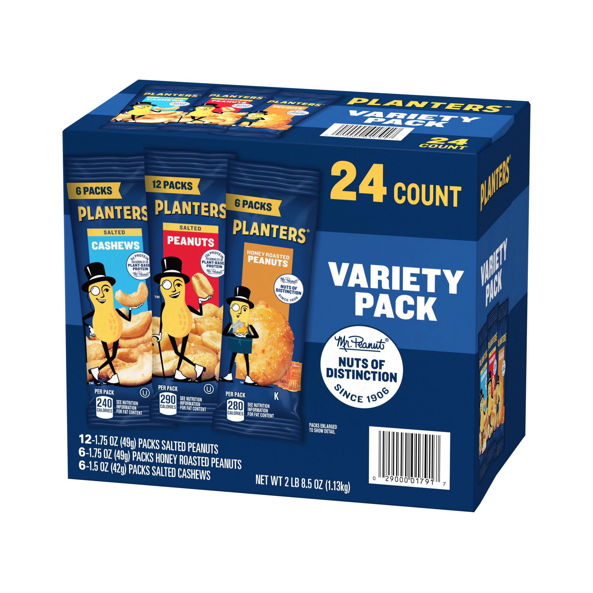 One box of 24 bags of Planters Nuts Cashews and Peanuts Variety Pack Snack Nuts Planters Nuts Variet Packs are made with premium Kosher nuts for a satisfying snack Choose from salted cashews, salted peanuts or honey-roasted peanuts for variety Individual snack pack bags are convenient and portable No cholesterol or trans fat for guilt-free indulgence Variety pack makes this snack easy to share Great for those keeping Kosher