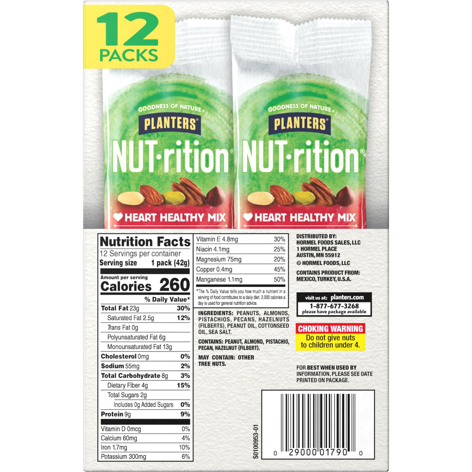 Planters NUT-rition Heart Healthy Mix is a deliciously crunchy mix of peanuts, almonds, pistachios, pecans and hazelnuts, available in a 12-pack of convenient on-the-go bags that make packing a healthy lunch easy. Low sodium, cholesterol-free, trans fat-free and good source of fiber. This pack includes (12) 1.5 oz. pouches of Planters NUT-rition Heart Healthy mix.