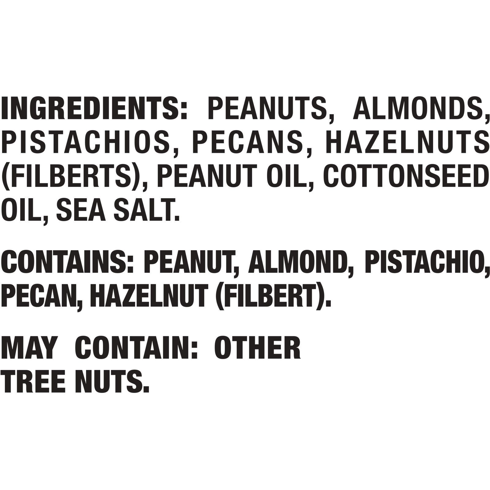 Contains PEANUT, ALMOND, PISTACHIO, PECAN, HAZELNUT (FILBERT). Product of USA