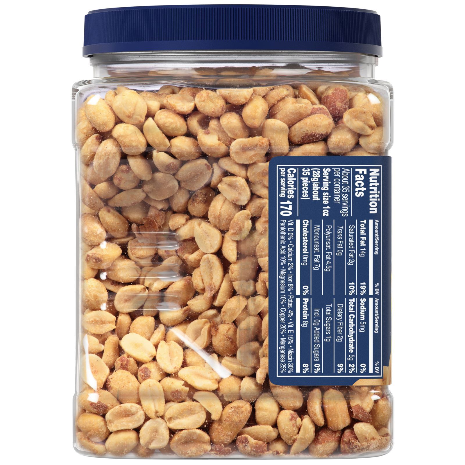 Roasted without oil, these Planters peanuts are unsalted and naturally crunchy. Enjoy a refreshing snack of peanuts without the use of oil and salt. These peanuts are ready to use in your favorite recipes or eaten by the handful for a tasty snack. Available in a large 35 oz. resealable jar, these dry roasted peanuts stay fresh.