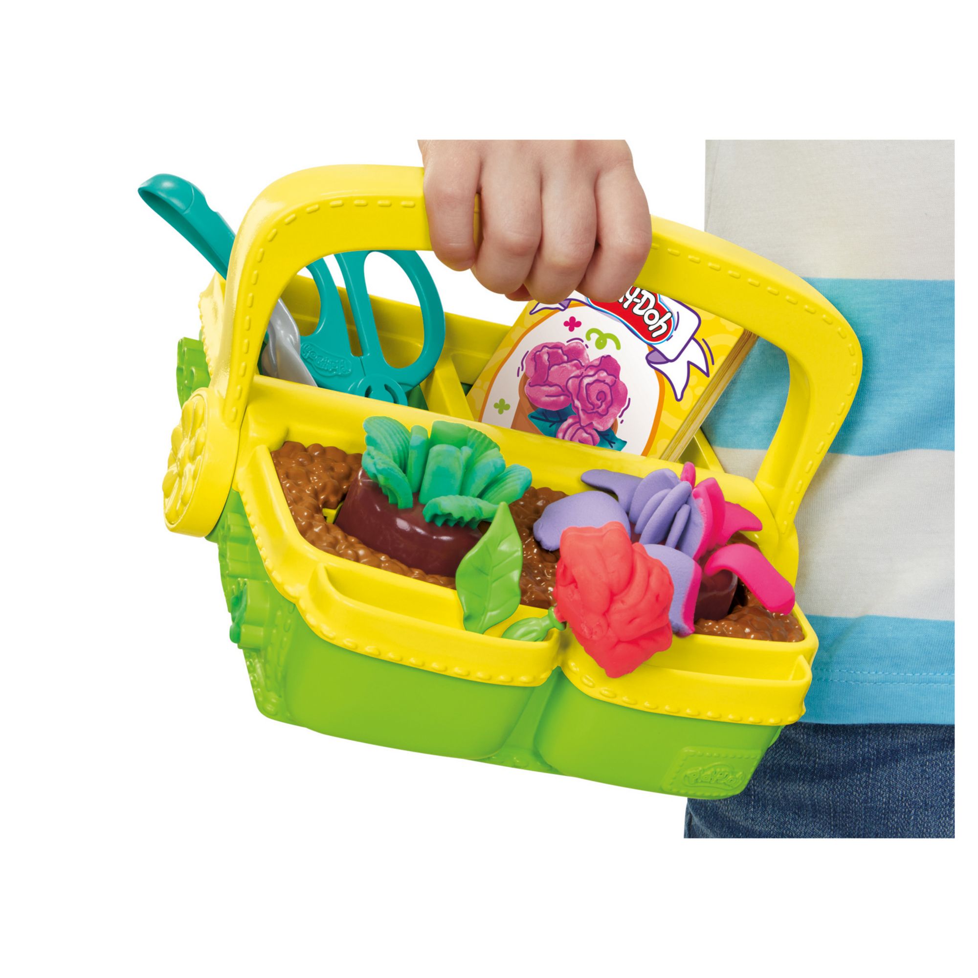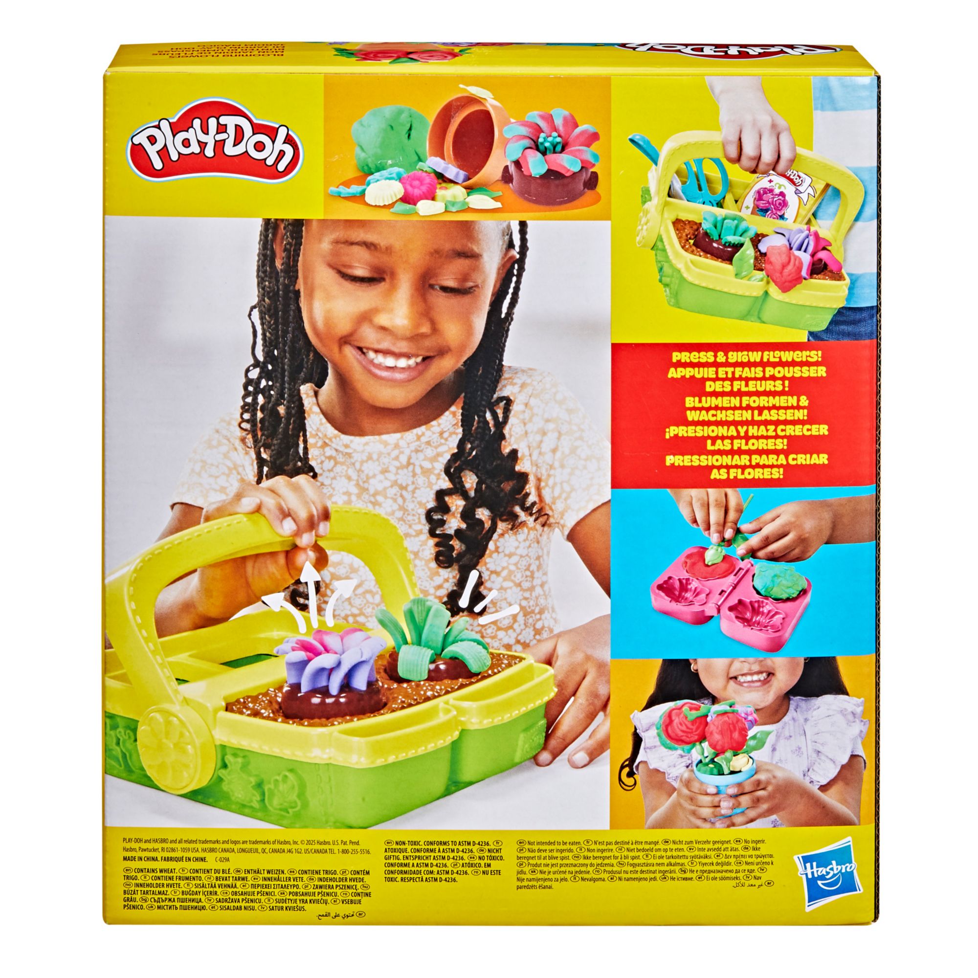 Includes garden box, four flower pucks, three stems, flower book-mold, vase, flowerpot, trowel, shears, knife, three creation cards, and five cans of Play-Doh brand modeling compound (total 10 oz./284 grams