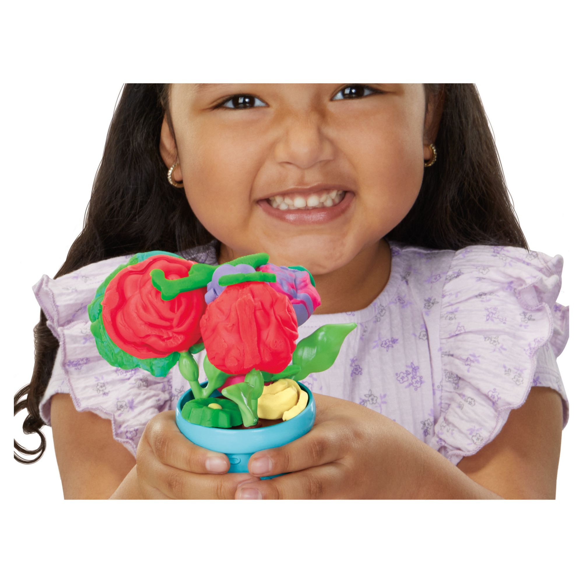 Let imaginations blossom with the Play-Doh Blooming Flowers kid's playset. This indoor garden toy is ready for any season with fun ways to play pretend florist year-round. The garden box and flower pucks can make four different Play-Doh flower shapes and the book mold creates two more varieties. Display and hold the blossoms and stems in place with the flower pot and vase. Five Play-Doh cans and three how-to cards help spark their imaginations with this sensory toy. Give a gift to kids 3 and up that helps their creativity bloom. Play-Doh and Hasbro and all related trademarks and logos are trademarks of Hasbro, Inc. 2024 Hasbro.