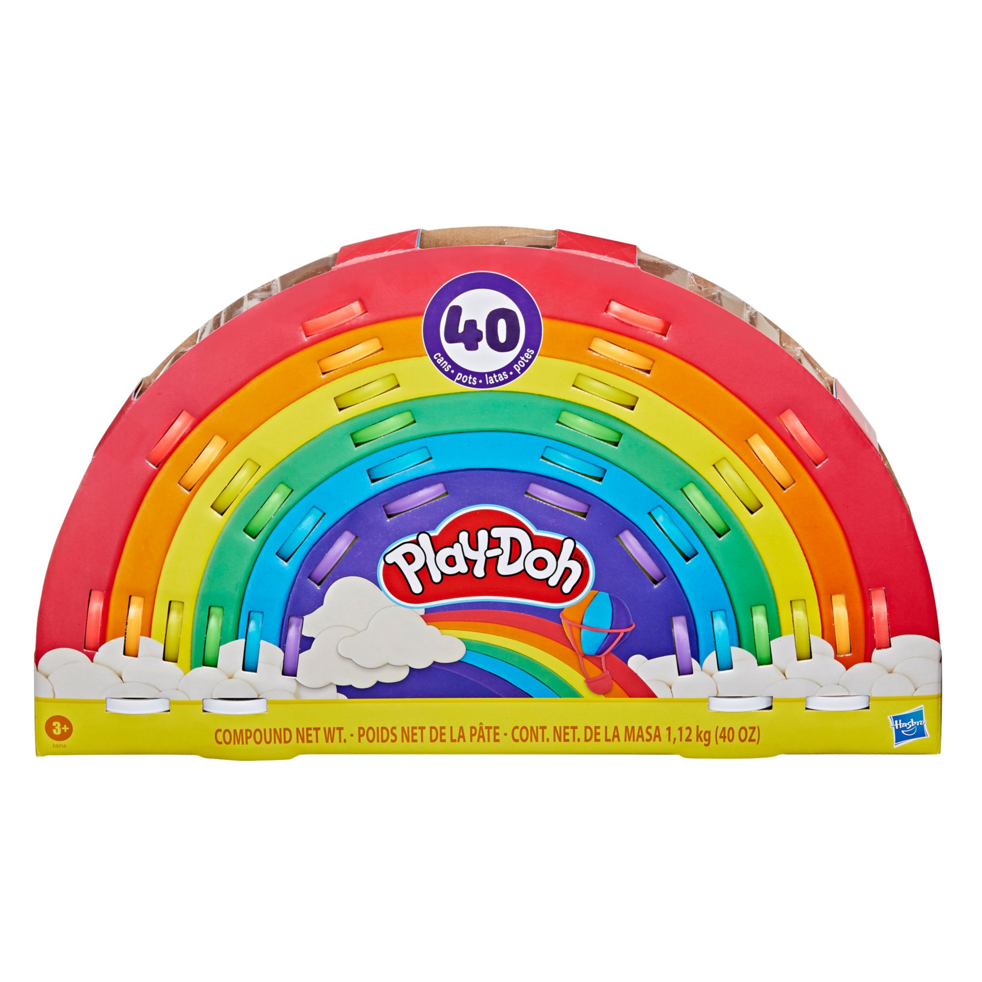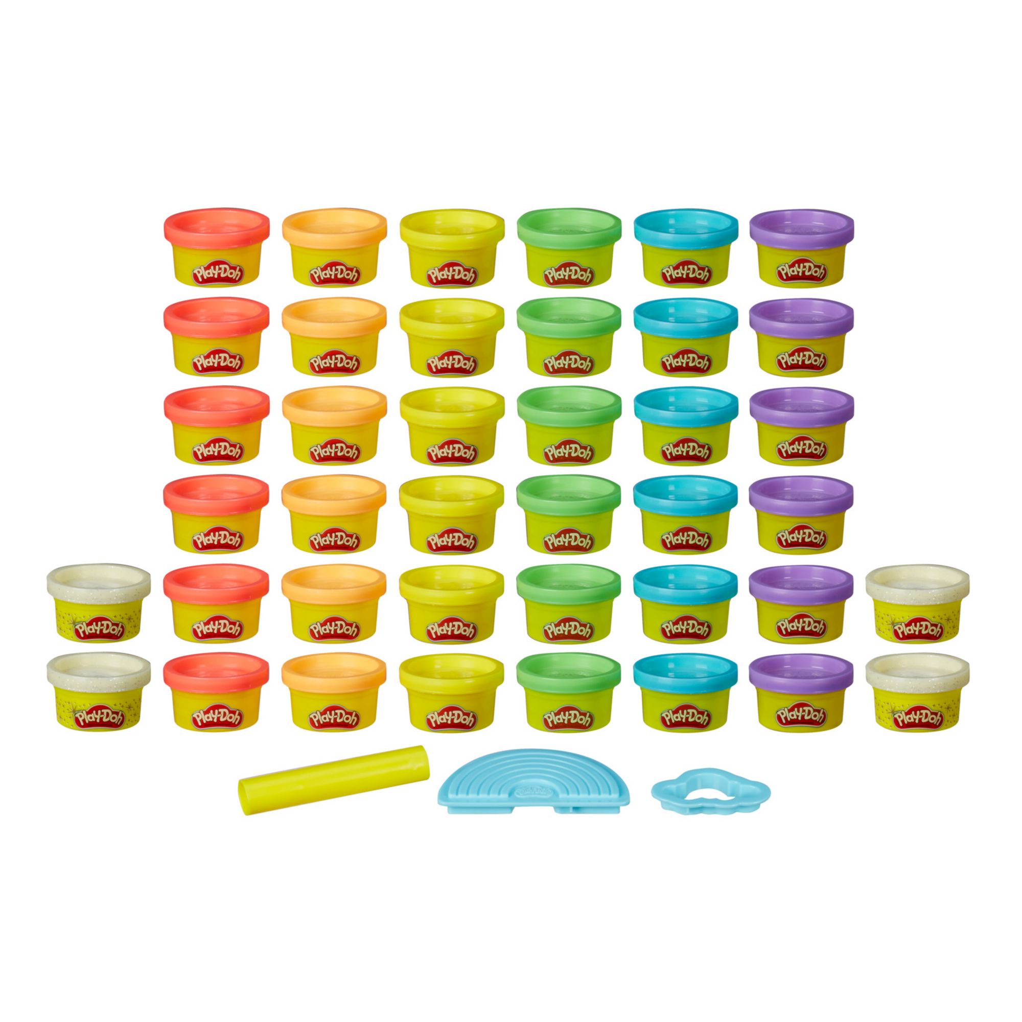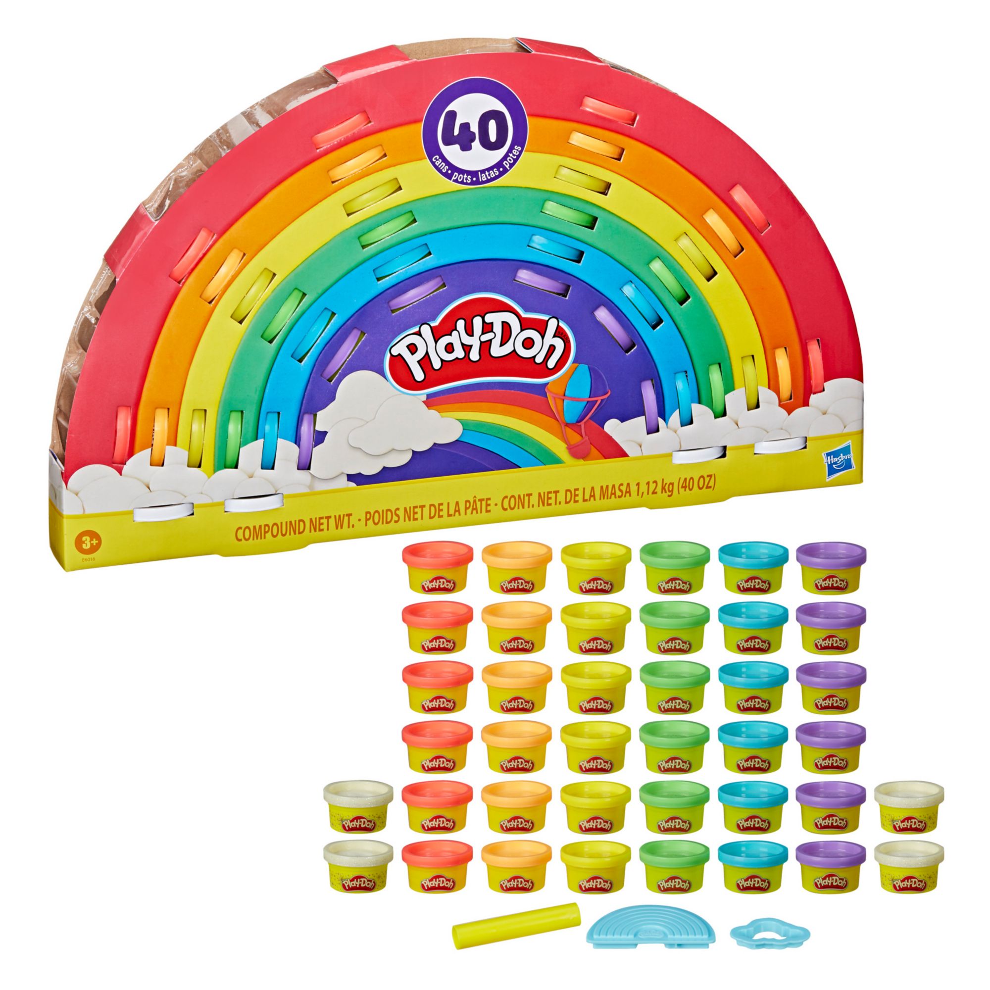 Rock the rainbow with the Ultimate Rainbow 40 pk. of fun-size Play-Doh cans. This set of small Play-Doh containers comes in an epic rainbow package that makes an eye-popping gift idea for kids ages three and up. These one lb. cans come in seven different colors including four cans of Play-Doh Sparkle compound to add a hint of glitter. Make your own rainbows again and again with the three tools including a rainbow stamper, cloud-shape cutter, and roller. Hasbro, Play-Doh, and all related properties are trademarks of Hasbro. 2022 Hasbro. All rights reserved.