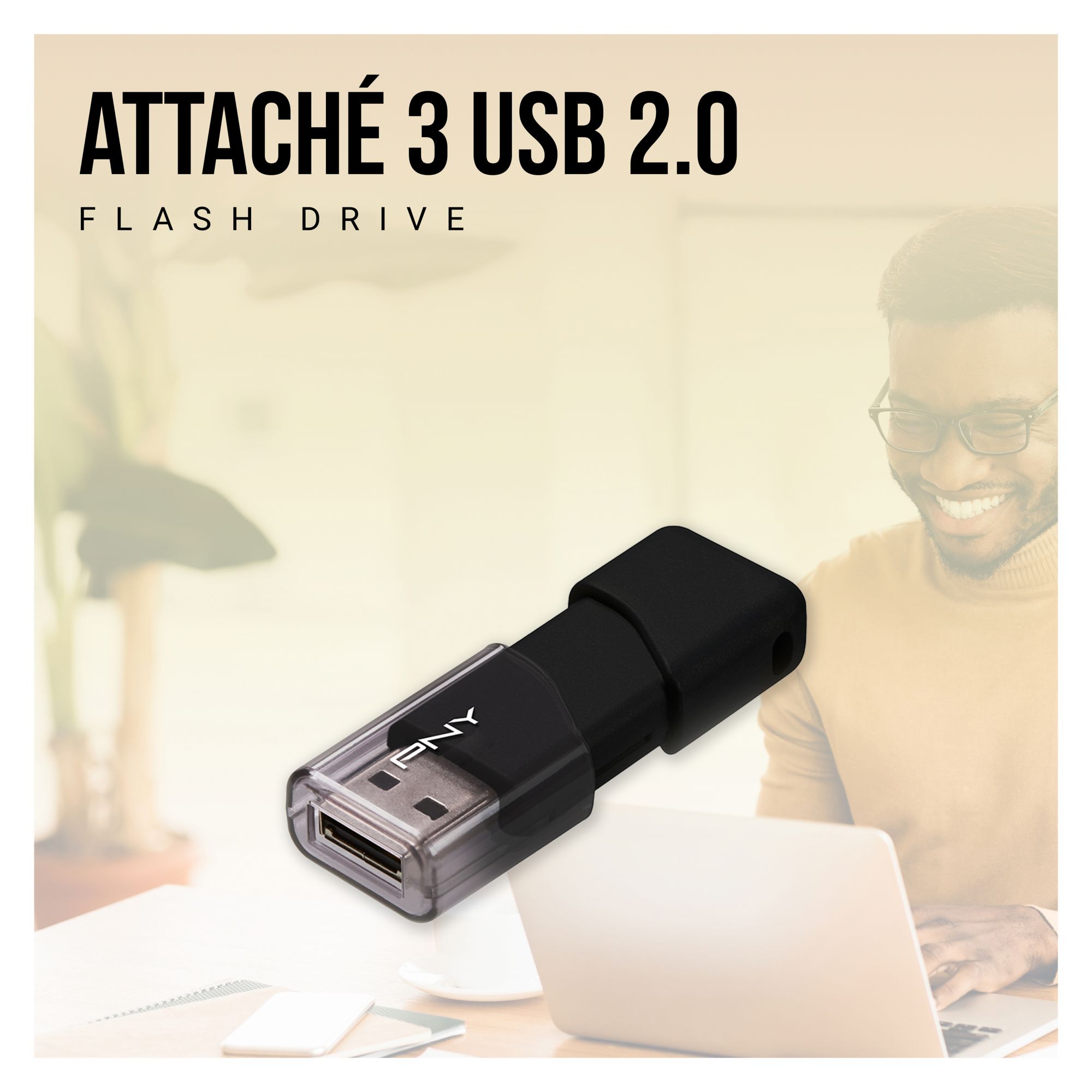 The PNY Attaché 3 USB 2.0 flash drive is the essential solution for storing and sharing digital content for work and school. Durable and lightweight, it delivers the perfect combination of storage and convenience. The sliding collar and cap-less design protect your important content when not in use, and the included key loop easily attaches to key chains, so important files are never out of reach. The Attaché 3 USB 2.0 flash drive is compatible with USB 2.0 equipped pc and Mac laptop and desktop computers and compatible with USB 3.0 host devices at standard USB 2.0 speeds.