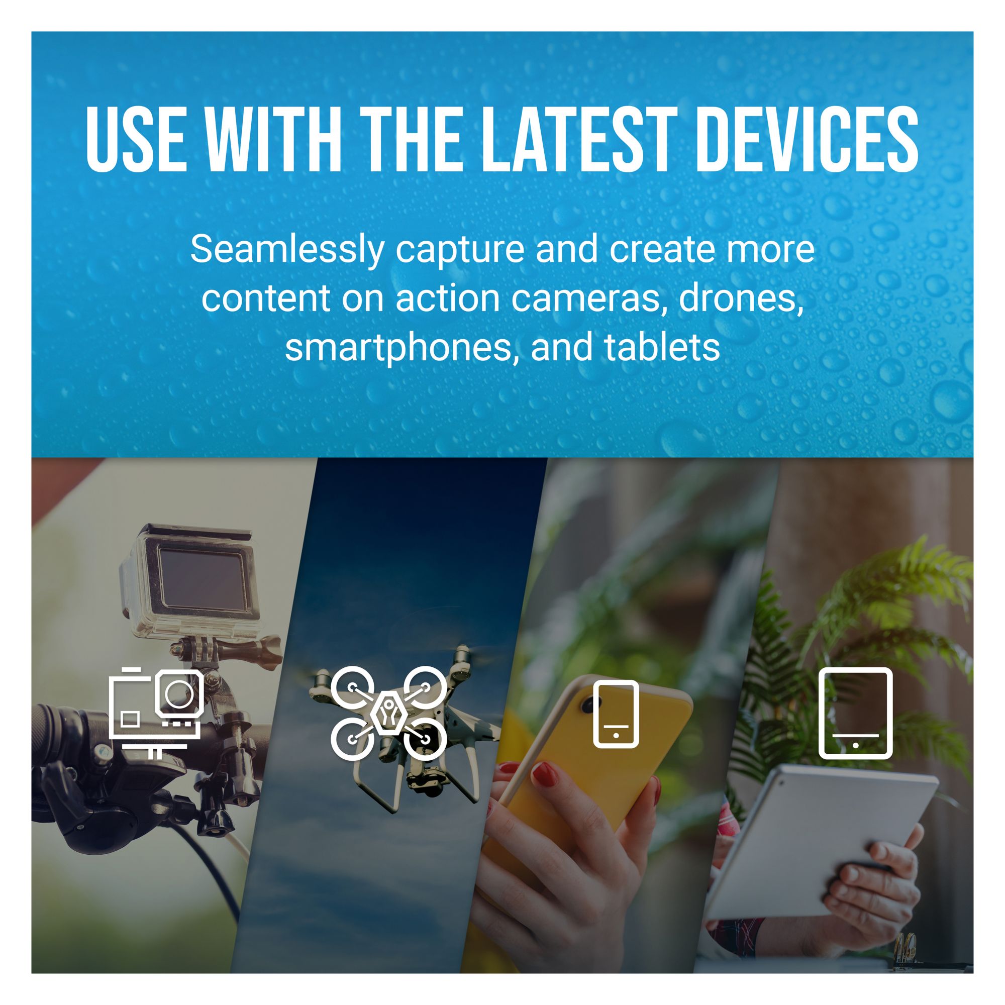 Record and transfer videos, photos, music, files, and more from microSD-enabled host devices such as Android smartphones and tablets, action and surveillance cameras, drones, computers, and more