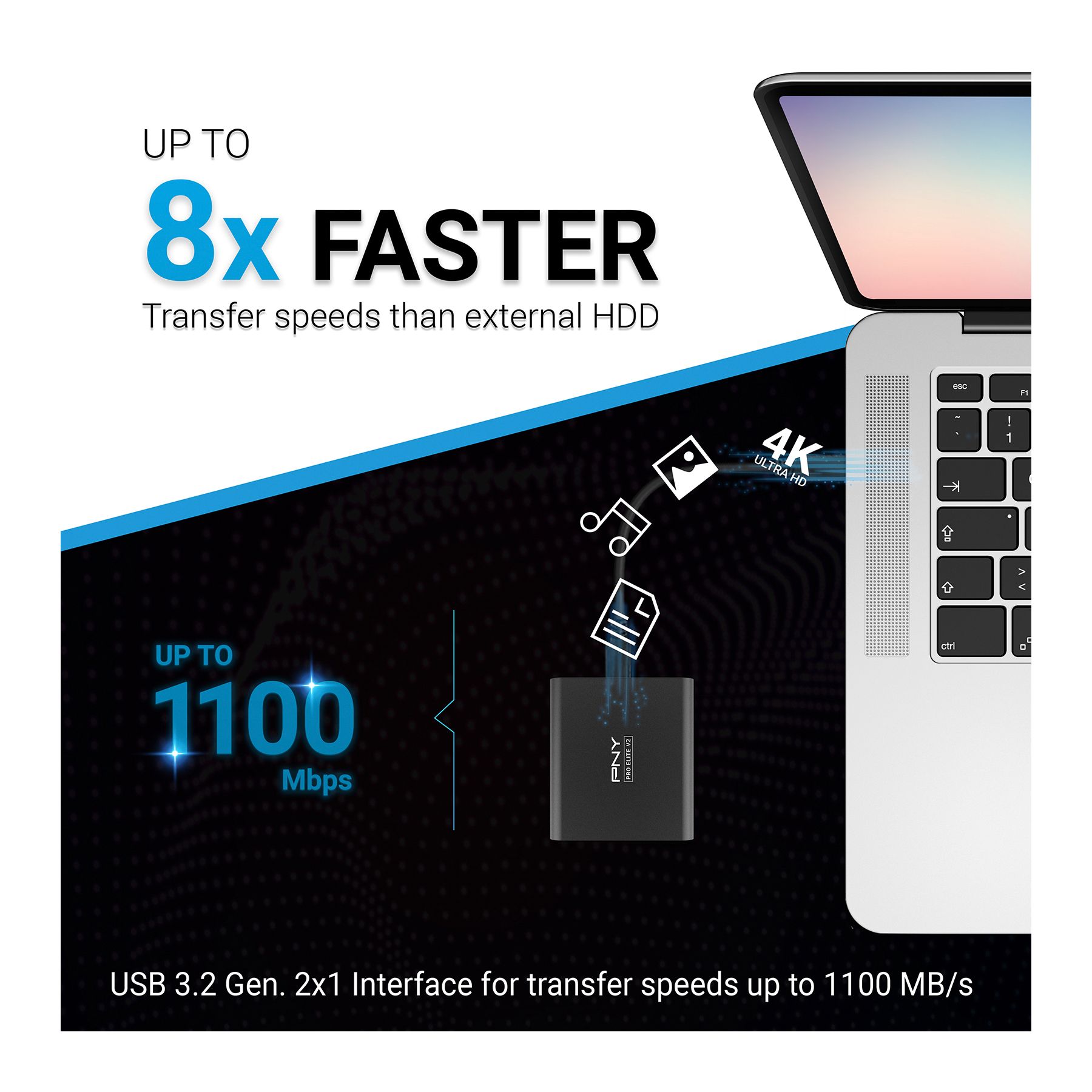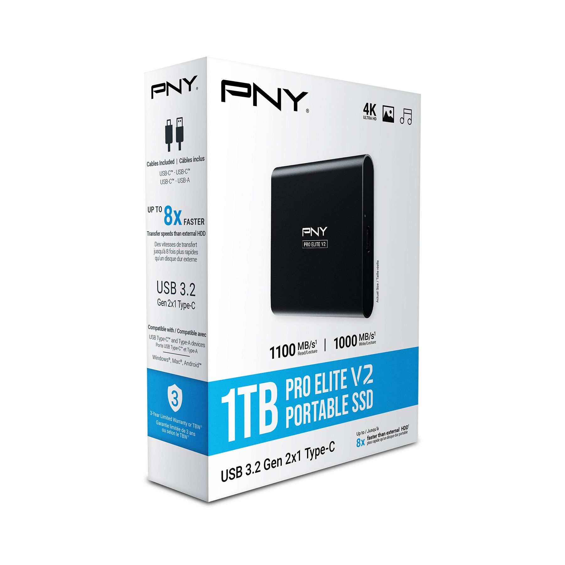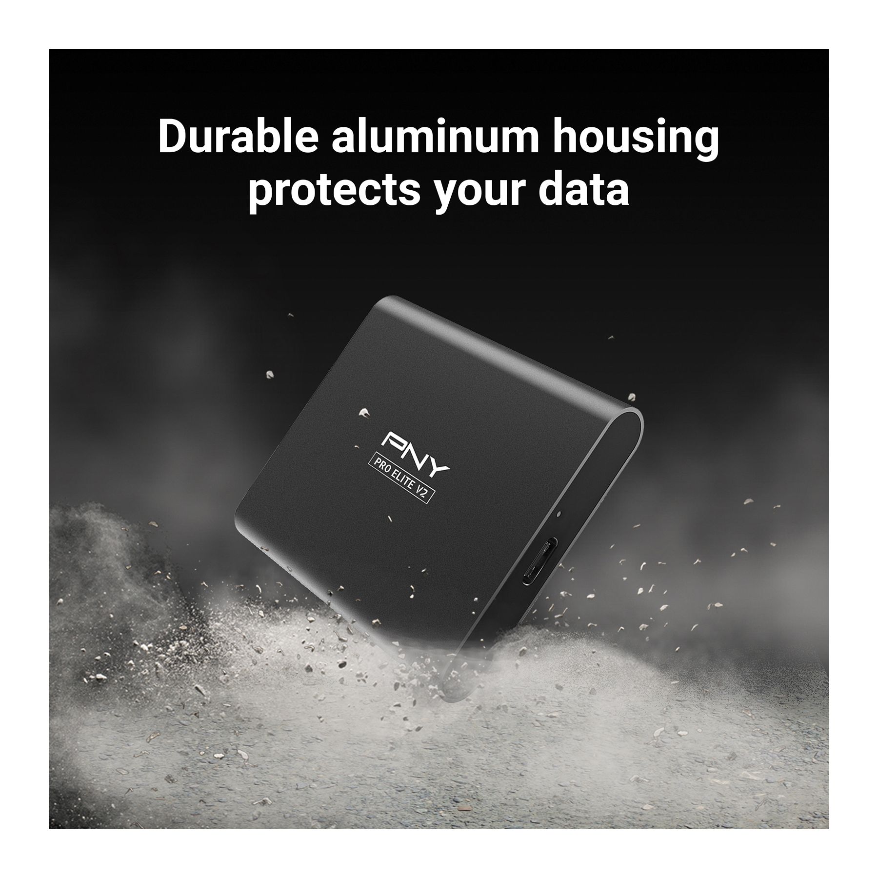 The PNY Pro Elite V2 USB 3.2 Gen 2x1 Type-C Portable SSD is the next generation in mobile storage. Available in capacities of 500GB and 1TB, with read and write speeds up to 1,100MB/s and 1,000MB/s respectively. The Pro Elite V2 USB 3.2 Gen 2x1 Type-C Portable SSD boasts not only increased capacity but also exceptional performance. It’s designed to be a mobile storage solution superior to previous generations of USB-A portable SSDs and traditional USB 3.0 flash drives, allowing for even faster transfer and storage of files on the go. Easily back up data with included Acronis True Image Data Protection Software anywhere you go and enjoy the reliable aluminum housing and sleek design.