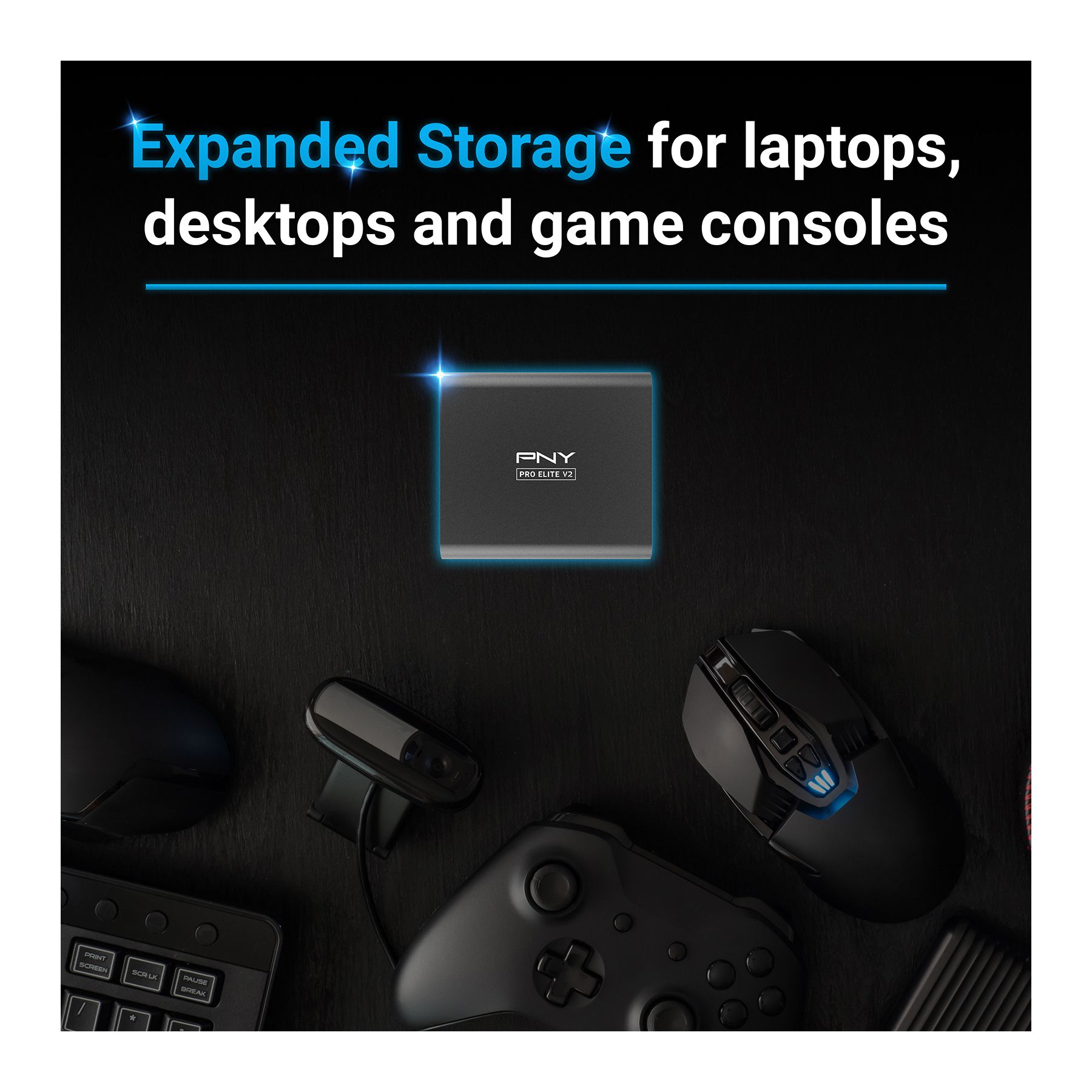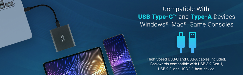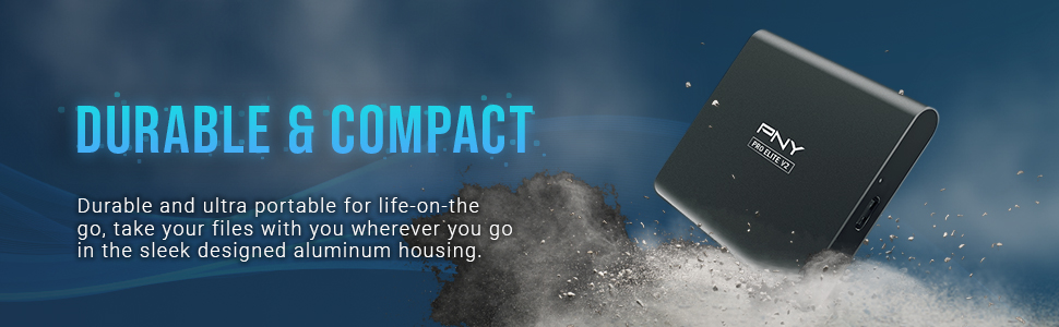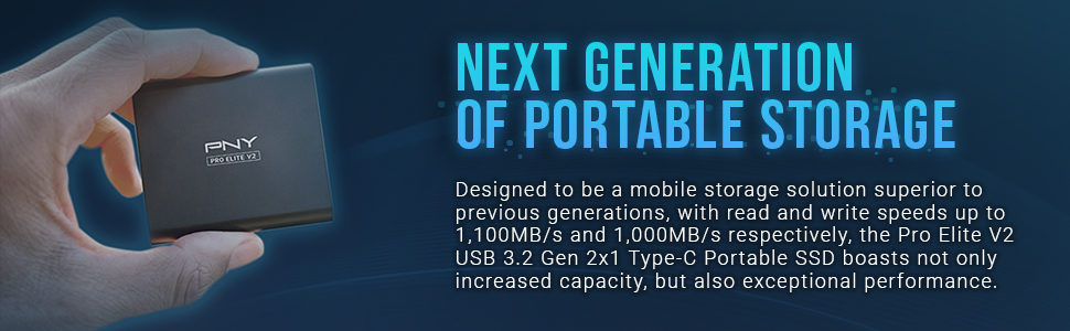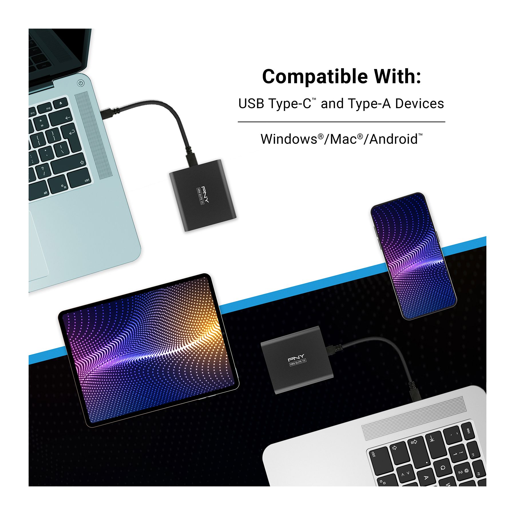 The PNY Pro Elite V2 USB 3.2 Gen 2x1 Type-C Portable SSD is the next generation in mobile storage. Available in capacities of 500GB and 1TB, with read and write speeds up to 1,100MB/s and 1,000MB/s respectively. The Pro Elite V2 USB 3.2 Gen 2x1 Type-C Portable SSD boasts not only increased capacity but also exceptional performance. It’s designed to be a mobile storage solution superior to previous generations of USB-A portable SSDs and traditional USB 3.0 flash drives, allowing for even faster transfer and storage of files on the go. Easily back up data with included Acronis True Image Data Protection Software anywhere you go and enjoy the reliable aluminum housing and sleek design.