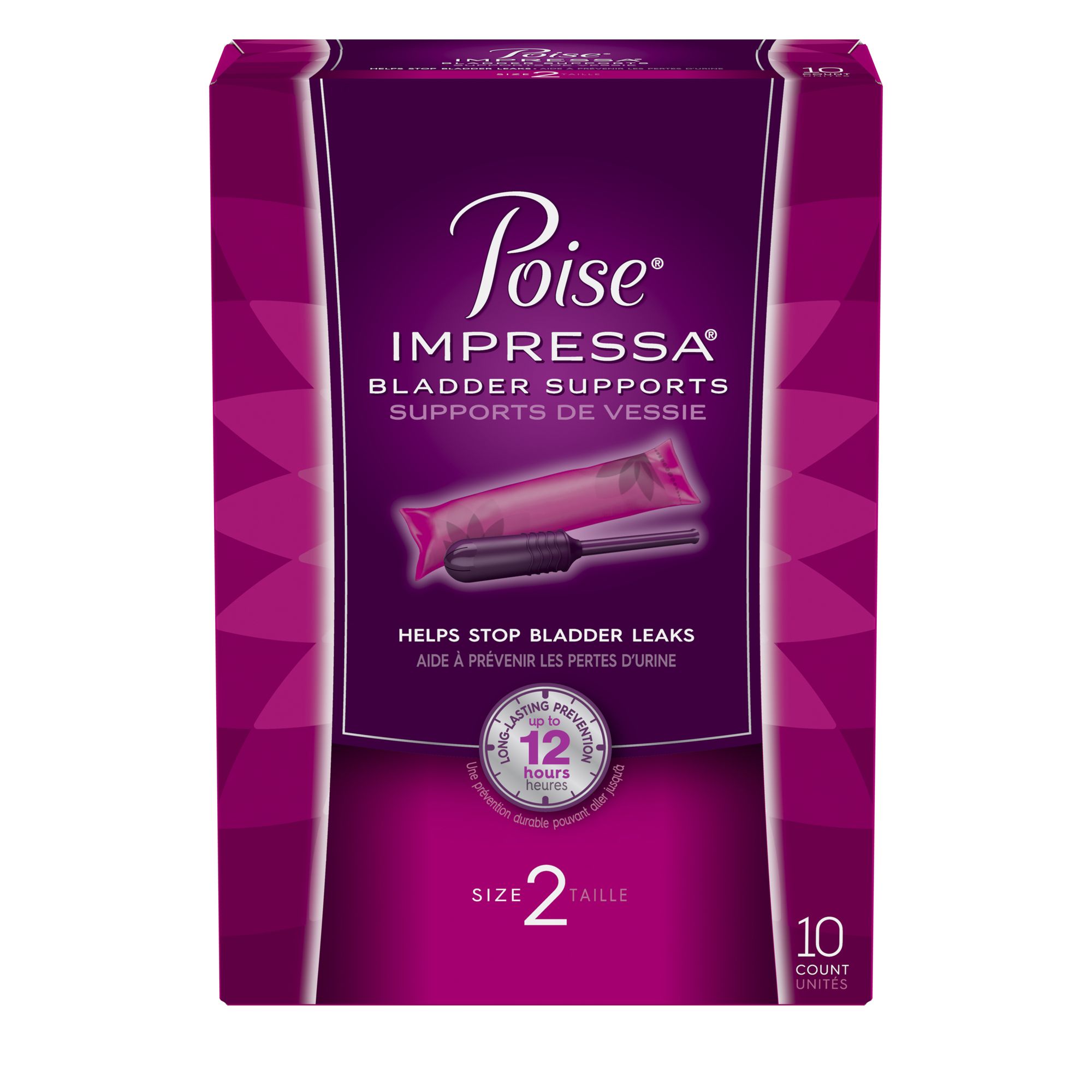 Poise Impressa Bladder Supports are a revolutionary incontinence product worn internally to help stop bladder leaks before they happen. Designed for women with urinary incontinence who laugh, cough, sneeze, run or swim, known as Stress Urinary Incontinence, Impressa Bladder Supports are for you. Safe, effective and easy-to-use, Impressa comes in three different sizes to fit each woman’s unique internal shape. Poise Impressa is the first over-the-counter pessary device approved by the FDA and it is gynecologist-tested. The Impressa Bladder Support is inserted like a tampon to gently lift and support the urethra to help stop bladder leakage, while allowing you to use the bathroom as usual. Poise Impressa can be worn for up to 12 hours within a 24-hour period. Help stop your incontinence and bladder leaks with Impressa Bladder Supports. Poise Impressa Bladder Supports are FSA-eligible.