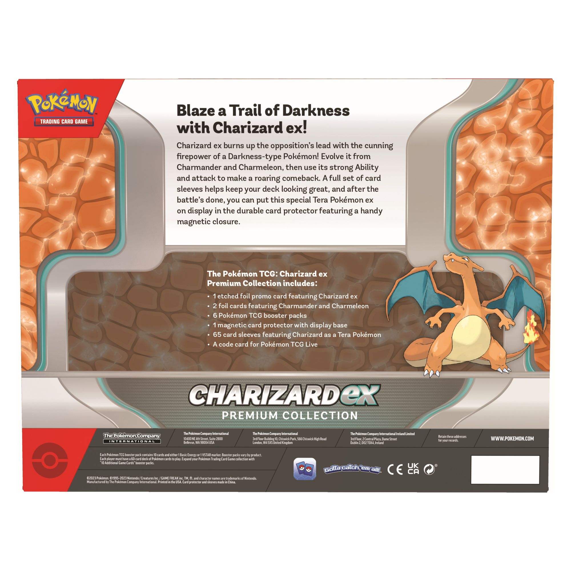 Includes etched foil promo card featuring Charizard ex, two foil cards featuring Charmander and Charmeleon, six Pokémon TCG booster packs, magnetic card protector with display base, 65 card sleeves featuring Charizard as a Tera Pokémon