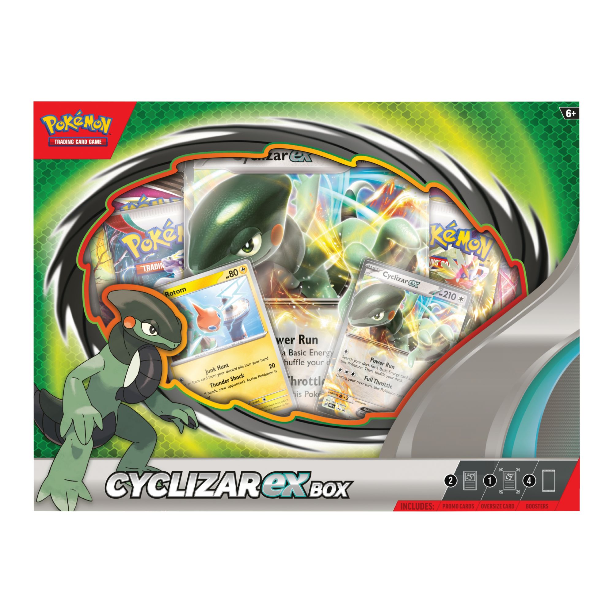 Coast into your next Pokémon TCG match with the support of Cyclizar ex. The helpful Mount Pokémon is ready to roll onto the battlefield with its crafty Power Run attack. With it, you can do damage and search your deck for a Basic Energy to attach to Cyclizar ex. When you're ready to bring it home, use Full Throttle and slide into big damage. In the Pokémon TCG: Cyclizar ex Box, you'll also find a helpful foil card featuring Rotom and four booster packs to add to your collection.