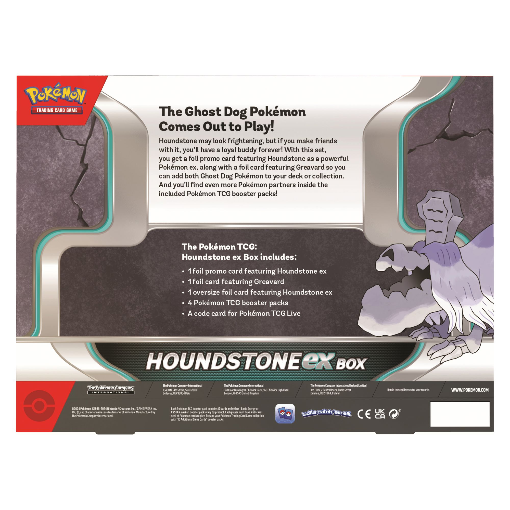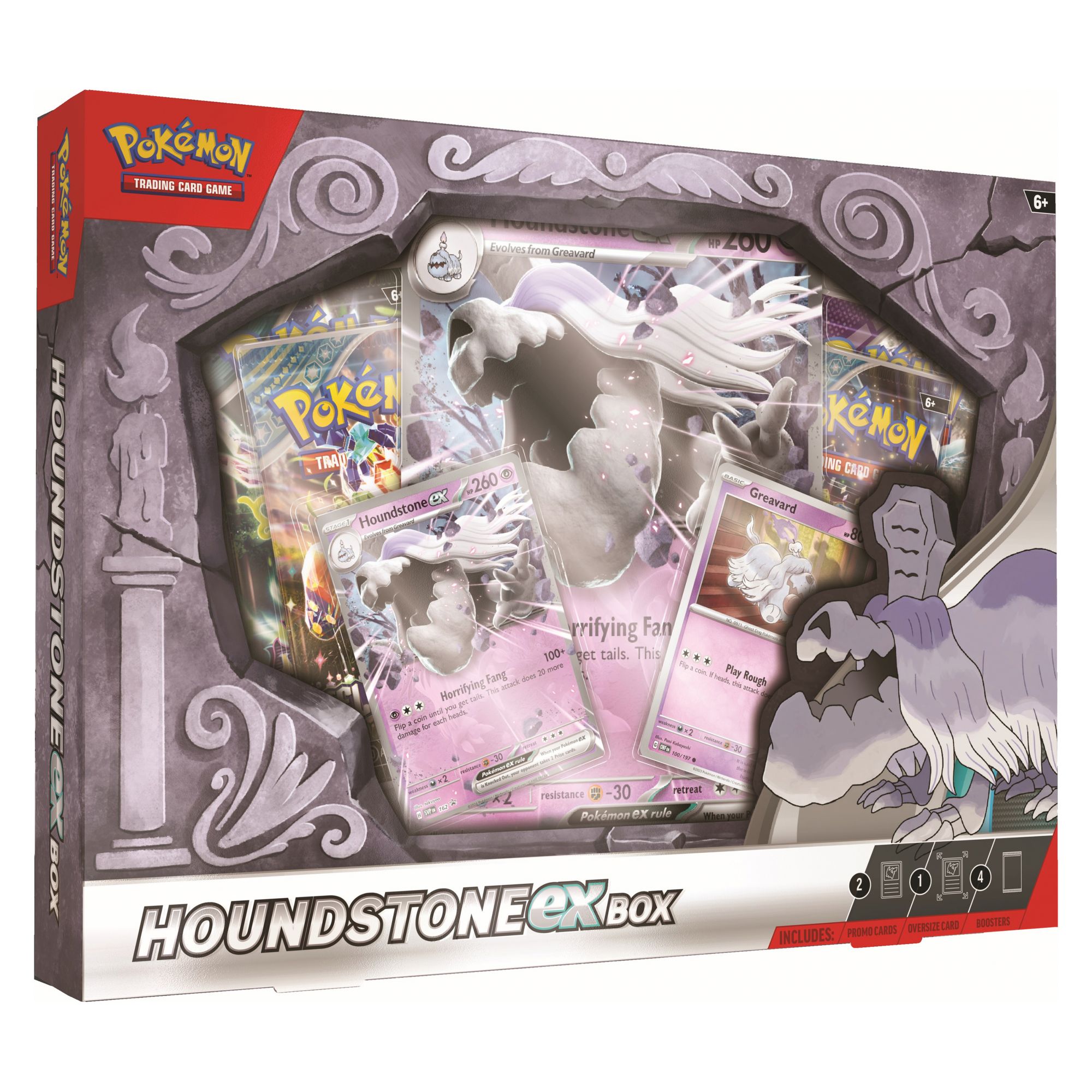 Includes Four Pokemon TCG booster packs, one foil promo card featuring Houndstone Ex, one foil card featuring Greavard, one oversized foil card featuring Houndstone Ex, and one code card for Pokemon TCG live