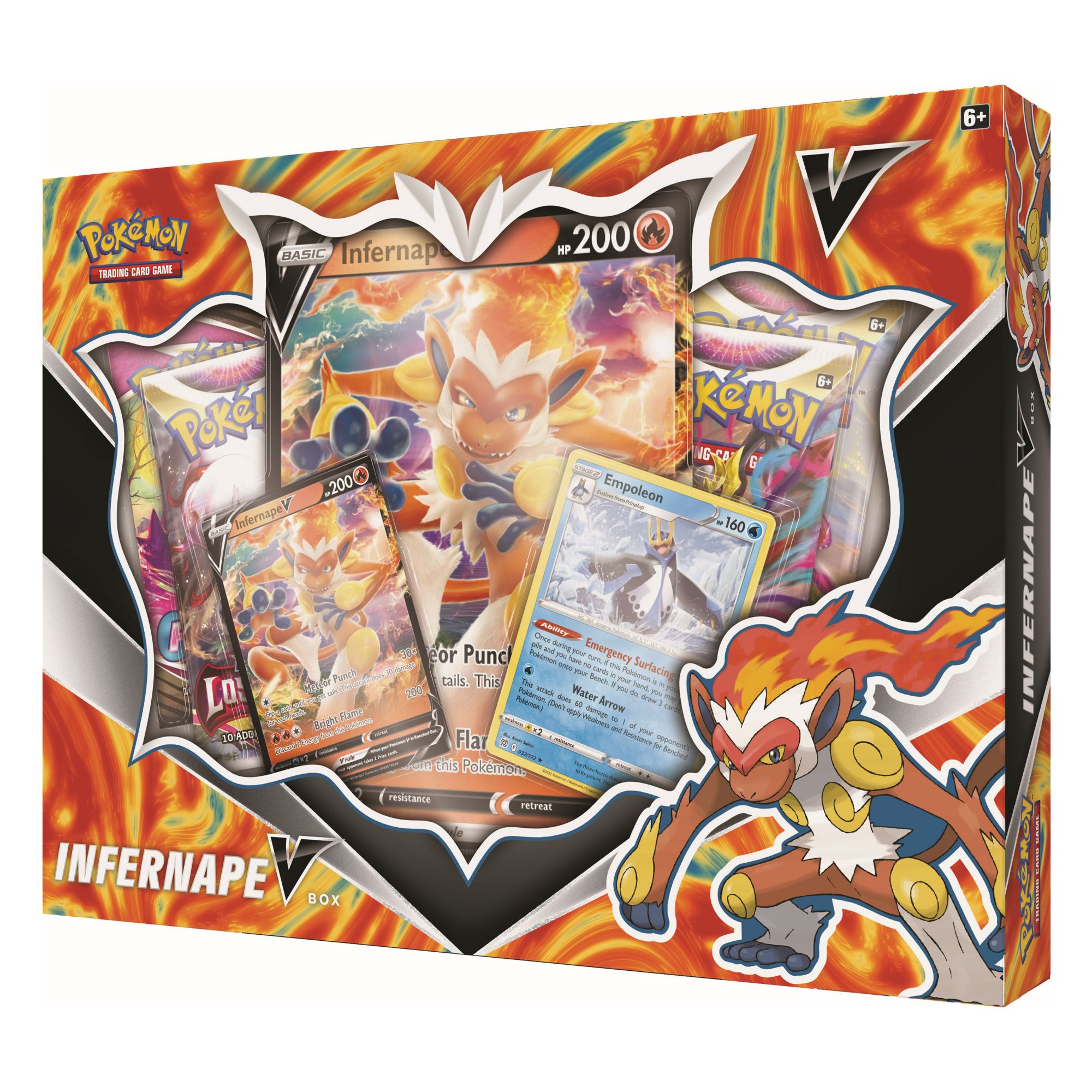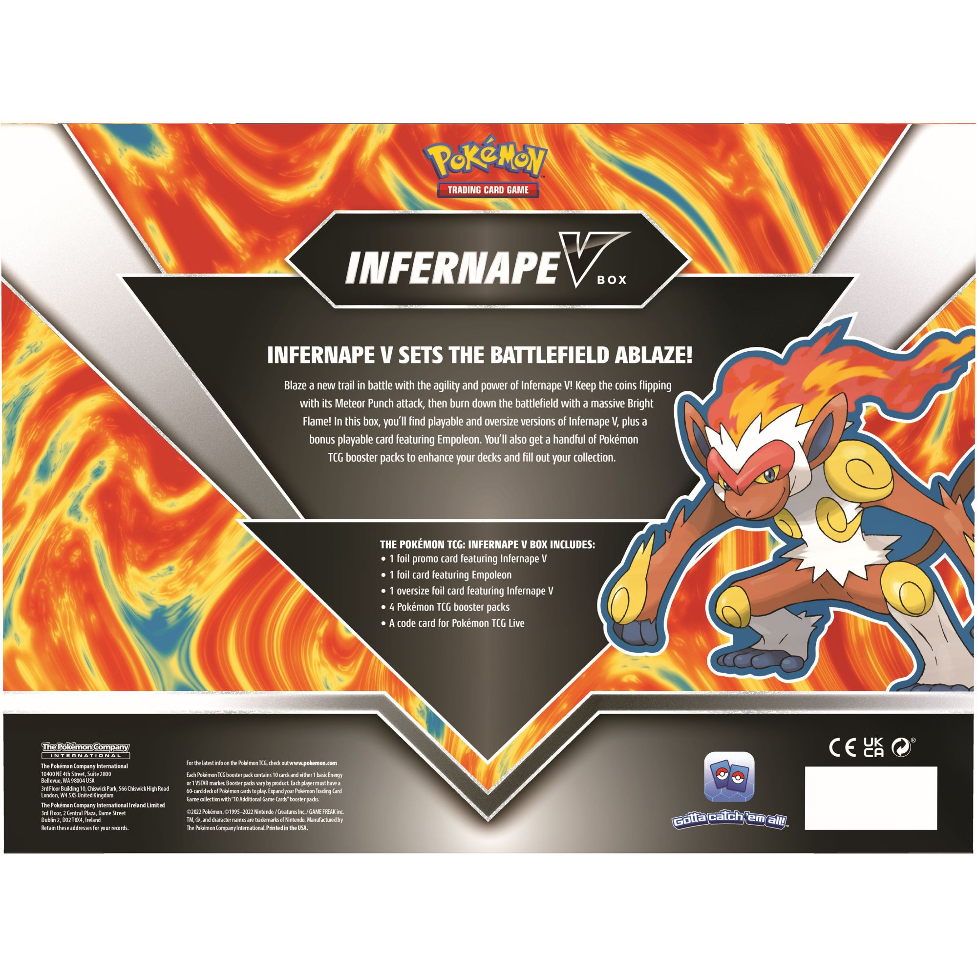 Infernape V Sets the Battlefield Ablaze. Blaze a new trail in battle with the agility and power of Infernape V. Keep the coins flipping with its Meteor Punch attack, then burn down the battlefield with a massive Bright Flame. In this box, you’ll find playable and oversize versions of Infernape V, plus a bonus playable card featuring Empoleon. You’ll also get a handful of Pokémon TCG booster packs to enhance your decks and fill out your collection.