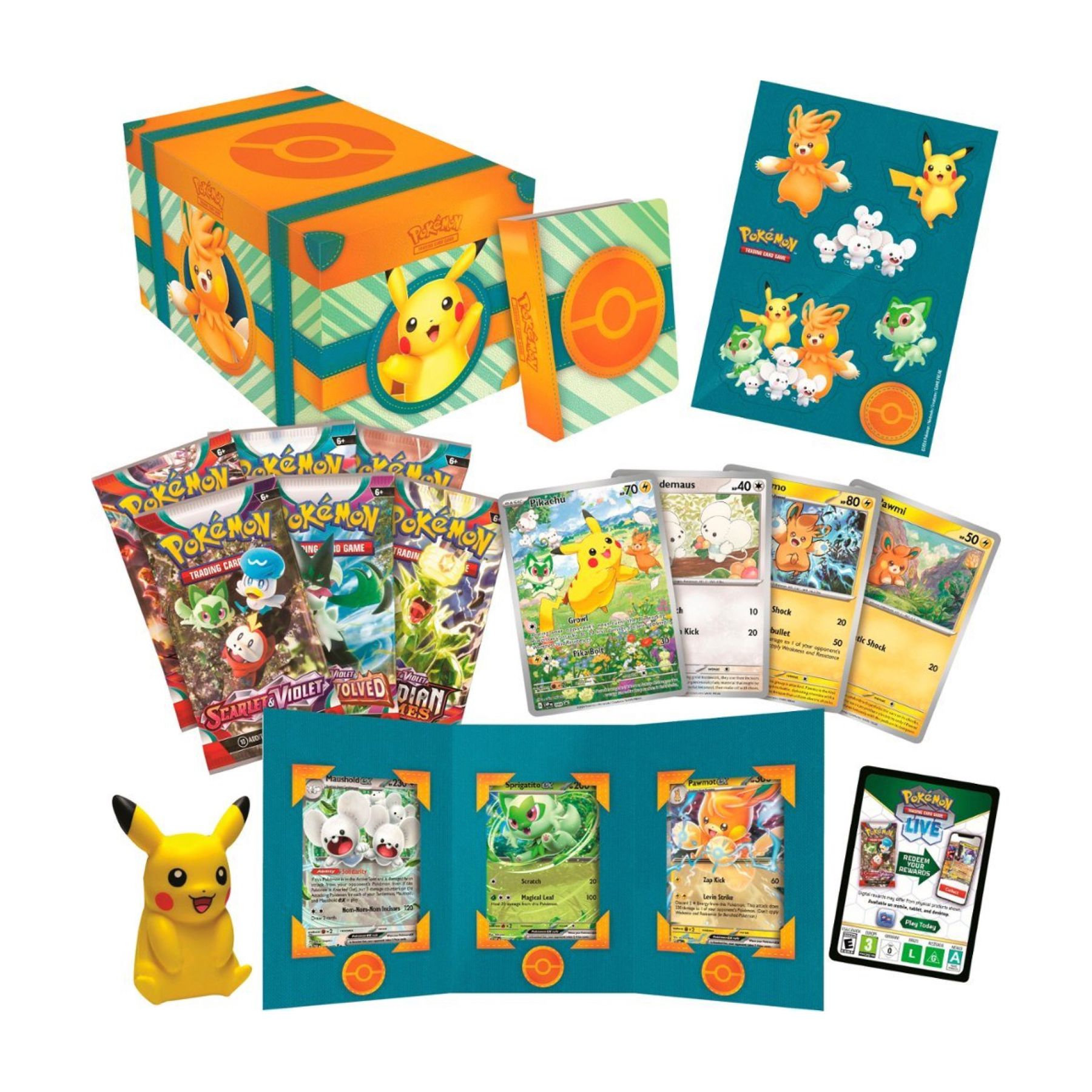 Includes six Pokemon TCG Boosters, seven foil cards, tech sticker sheet, mini portfolio, squishy toy Pikachu, code card for Pokemon TCG live