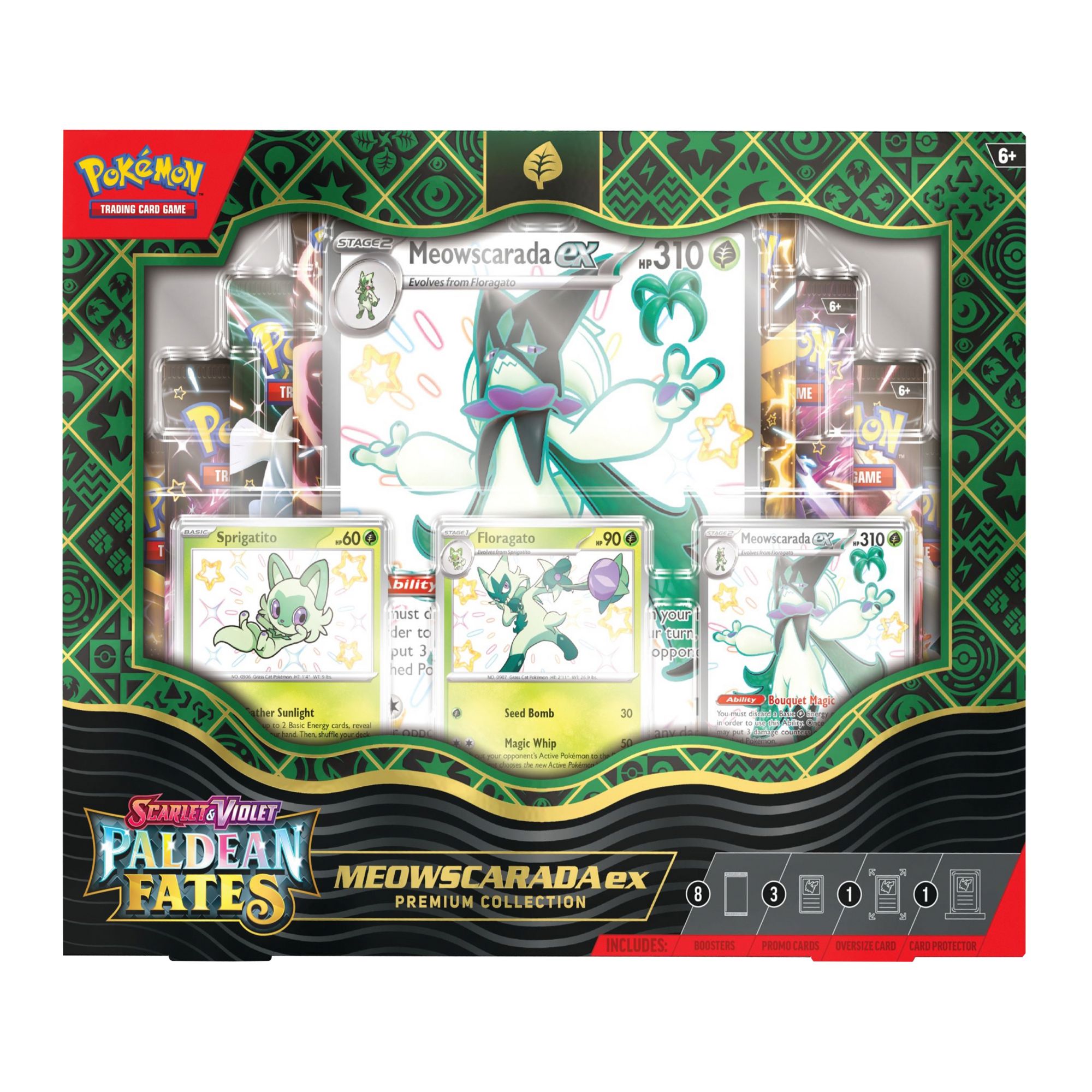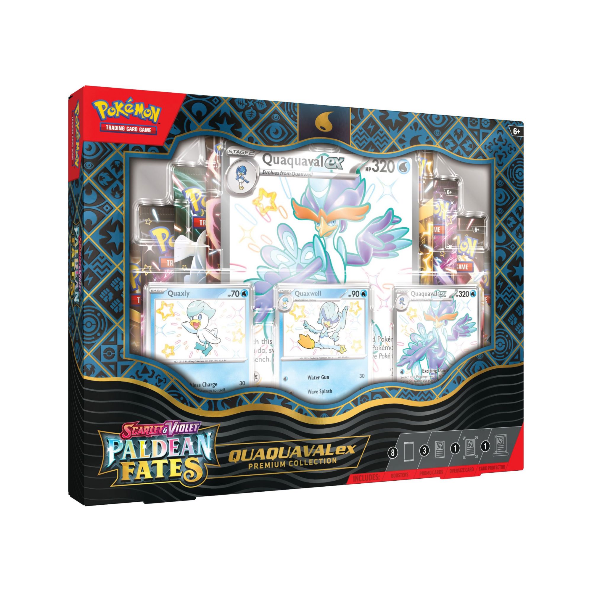 Includes right Pokémon TCG: Scarlet and Violet - Paldean Fates booster packs, three etched foil promo cards, oversized foil card, magnetic three-card protector, code card for TCG live