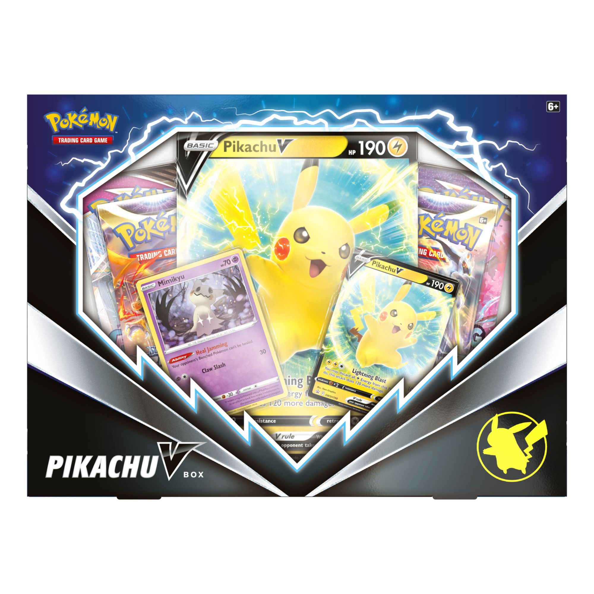 The Frontline V Box is here. Have a Lightning Blast with Pikachu V. Full of electrifying spirit, Pikachu V enters the battlefield with the tenacity to take on even the mightiest of Pokémon. This determined Pokémon V is ready to join your deck as a playable foil promo card, and you’ll find more fun cards in a trio of Pokémon TCG booster packs. The Pokémon TCG: Pikachu V Box includes: 1 foil promo card featuring Pikachu V, 1 foil card featuring Mimikyu, 1 foil oversize card featuring Pikachu V, 4 Pokémon TCG booster packs (Boosters Packs subject to change from box to box), A code card for Pokémon TCG Live. Live in Clubs near you March 25, 2022! Each Pokemon TCG booster pack contains 10 cards and either 1 basic Energy or 1 VSTAR marker. Booster packs vary by product. Each player must have a 60-card deck of Pokemon cards to play. Expand your Pokemon Trading Card Game collection with "10 Additional Game Cards" booster packs