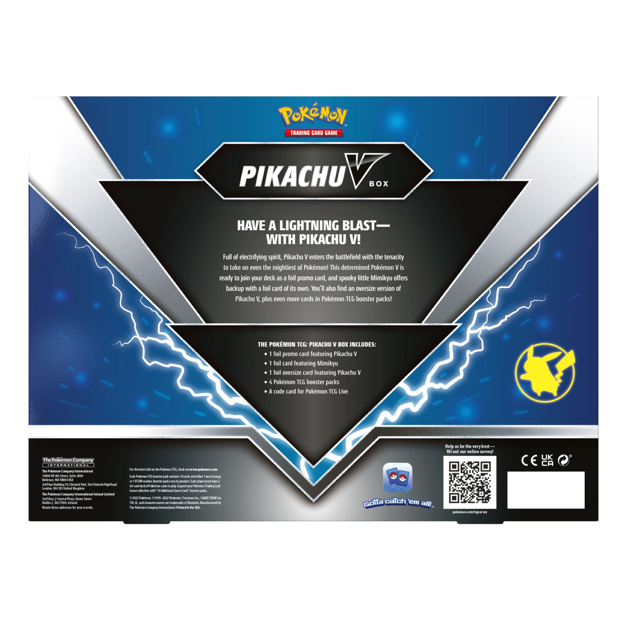 Four Pokémon TCG booster packs (Boosters Packs subject to change from box to box) One foil promo card featuring Pikachu V One foil card featuring Mimikyu One foil oversize card featuring Pikachu V A code card for Pokémon TCG Live Includes one foil promo card featuring Pikachu V, one foil card featuring Mimikyu, one foil oversize card featuring Pikachu V, four Pokémon TCG booster packs (Boosters Packs subject to change from box to box), a code card for Pokémon TCG Live