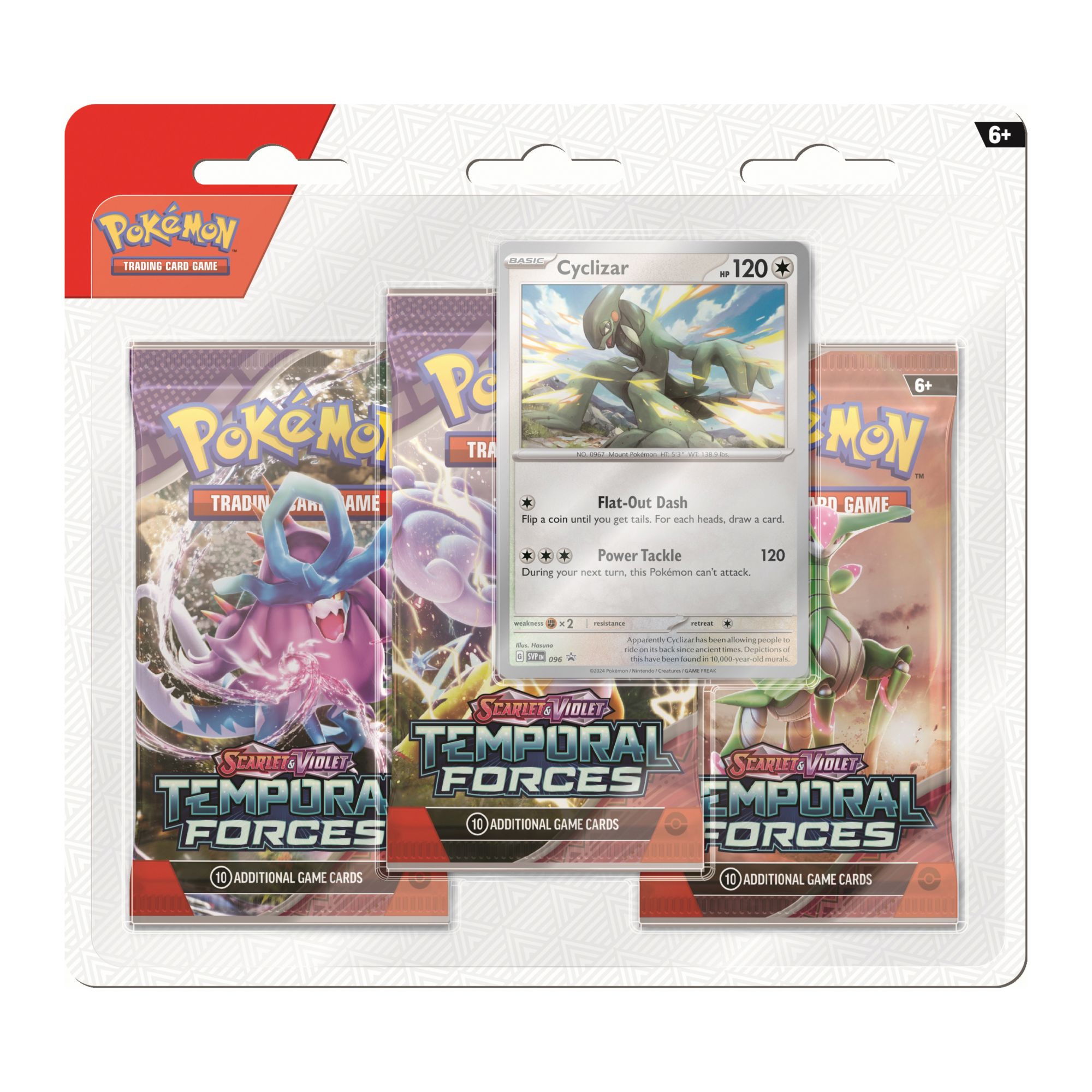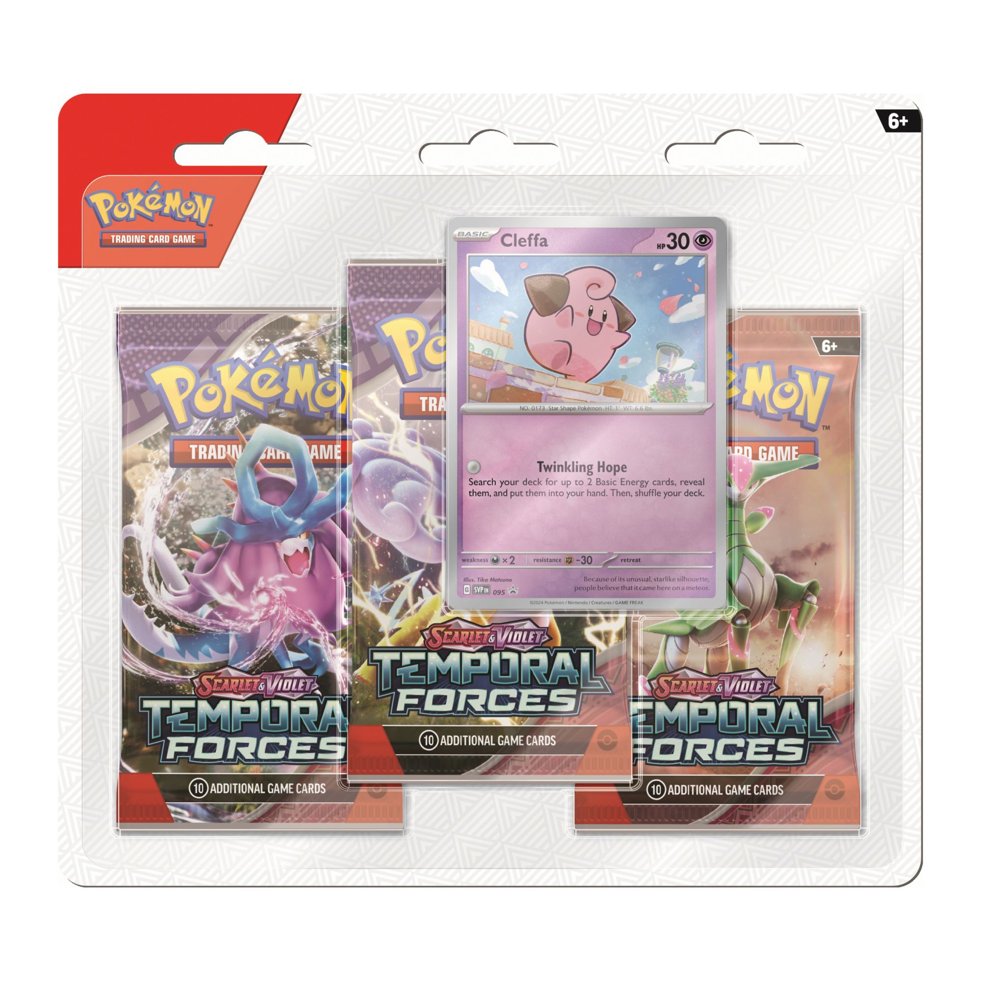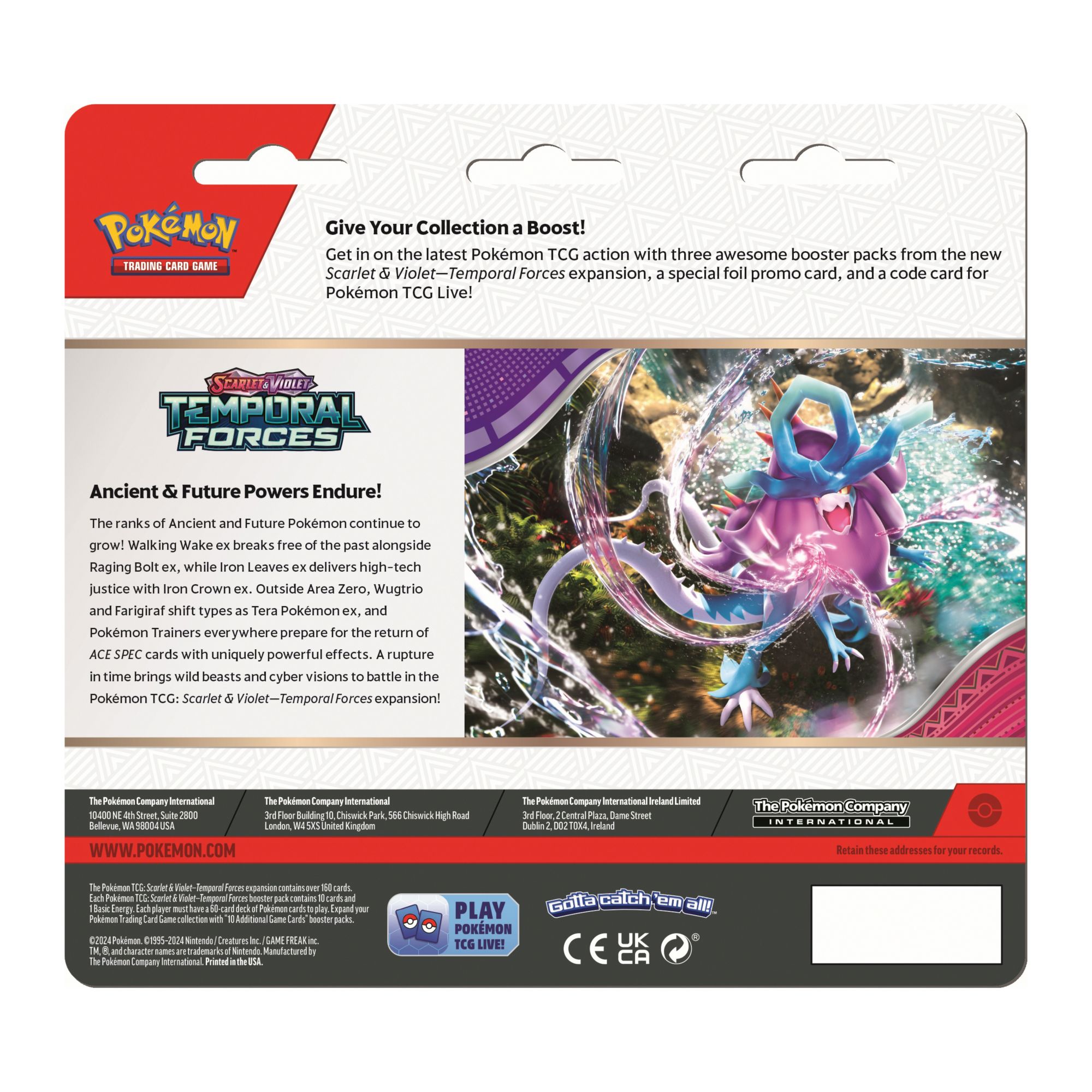 The ranks of Ancient and Future Pokémon continue to grow. Walking Wake ex breaks free of the past alongside Raging Bolt ex, while Iron Leaves ex delivers high-tech justice with Iron Crown ex. Outside Area Zero, Wugtrio and Farigiraf shift types as Tera Pokémon ex, and Pokémon Trainers everywhere prepare for the return of ACE SPEC cards with uniquely powerful effects. A rupture in time brings wild beasts and cyber visions to battle in the Scarlet and Violet - Temporal Forces expansion.
