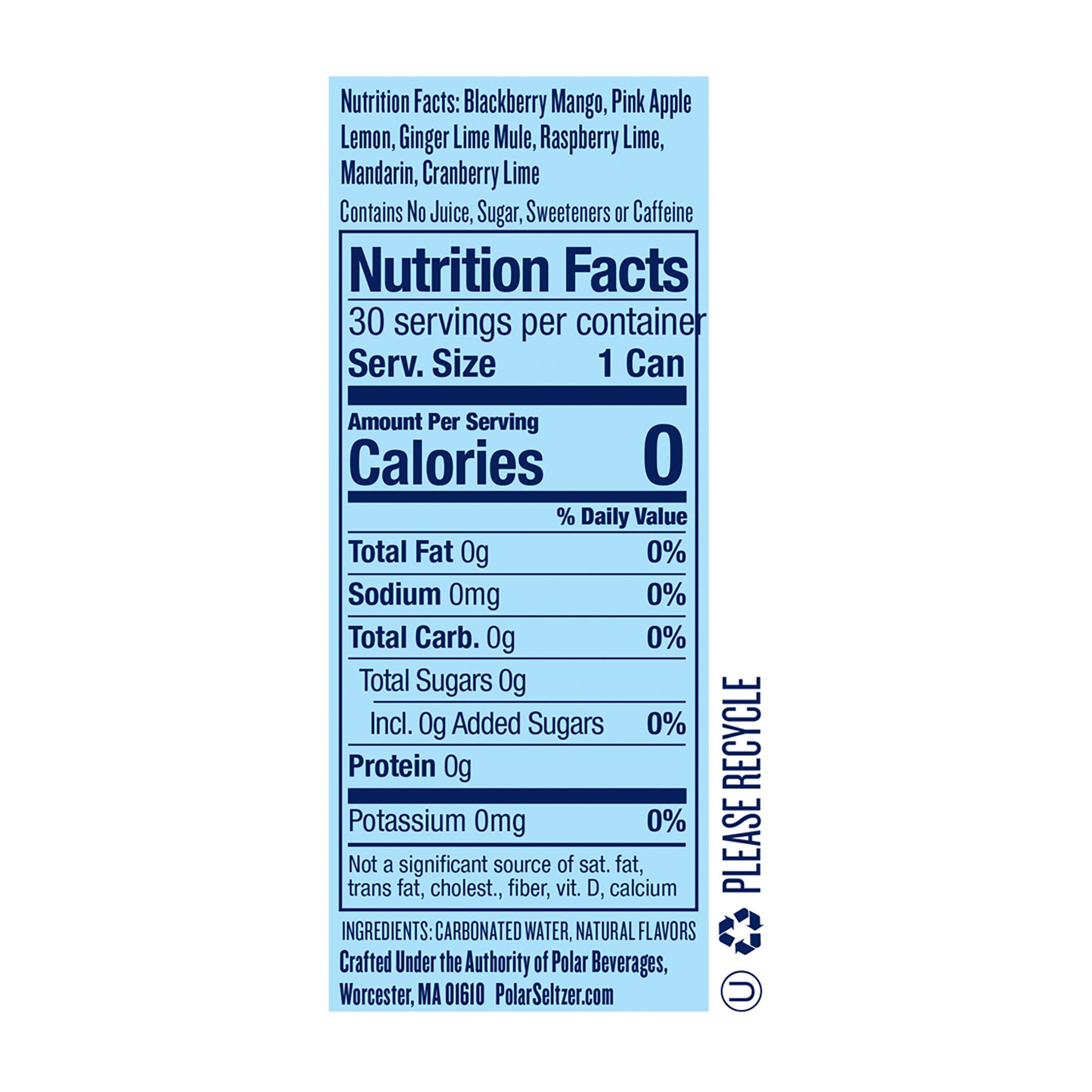 Polar Seltzer has been crafted with the same care and attention for over 140 years. In 1882 Polar Seltzer was made with three ingredients; locally sourced water, zillions of tiny bubbles to tingle your taste buds, and natural fruit essences for great taste. Today, not much is different, well, except that Polar Seltzer now crafts over 20 different varietals, and no longer delivers by horse and carriage. The family has been crafting Polar Seltzer with these same three ingredients since 1882, the same recipe the great-great-grandfather dubbed the world's best-tasting bubble recipe over 140 years ago. Made with just water, zillions of tiny bubbles, and great taste. Polar Seltzer Stars & Stripes Variety Pack features Blackberry Mango, Pink Apple & Lemon, Ginger Lime Mule, Raspberry Lime, Mandarin, and Cranberry Lime Polar Seltzer. Just Water, Bubbles & Great Taste. No calories, no sodium, no sugar, no sweeteners, no sodium, no carbs, vegan, kosher, gluten-free.