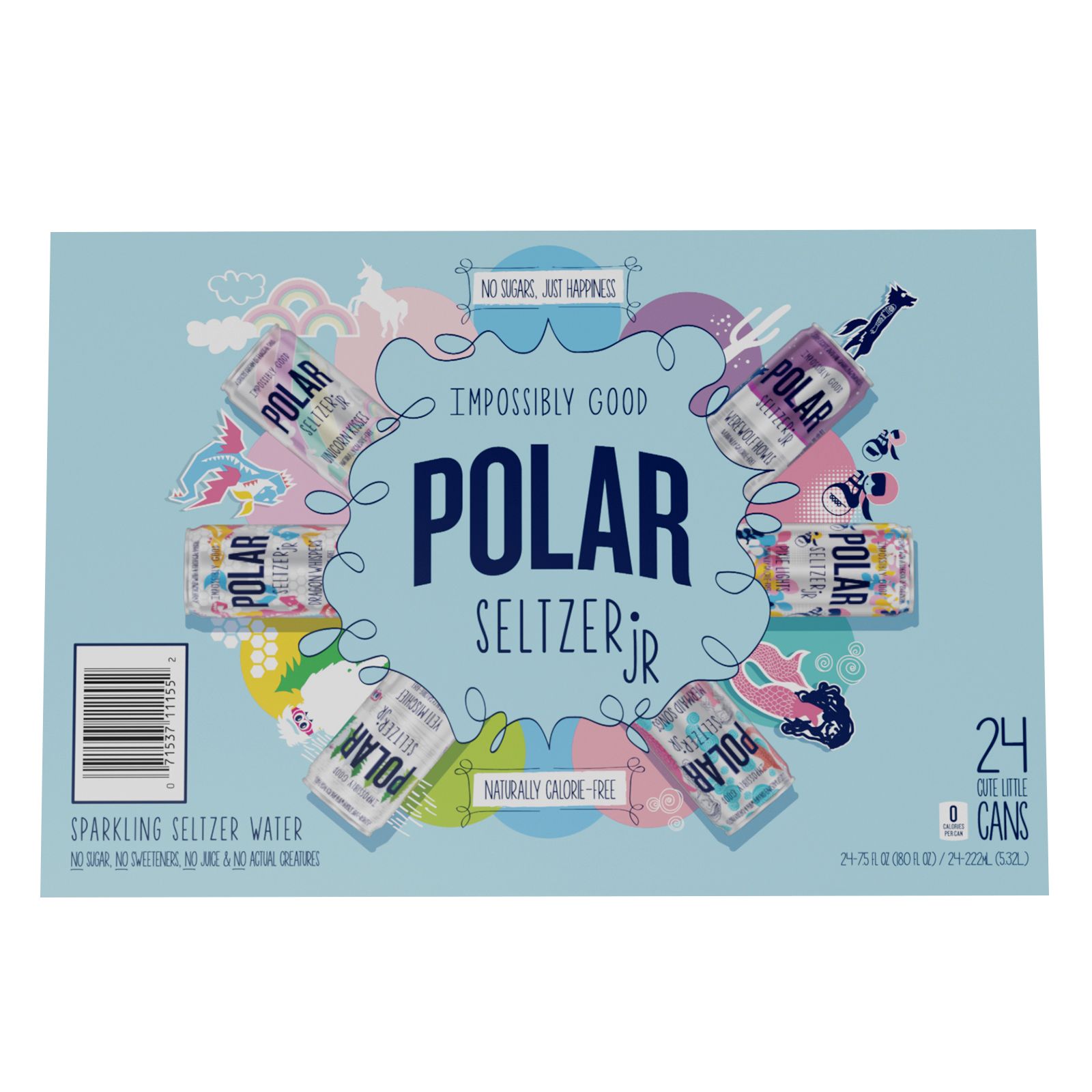 The Polar Seltzer jr Wit & Whimsy variety pack contains twenty-four 8 ounce cans in four of your favorite mythical recipes, Unicorn Kisses, Mermaid Songs, Pixie Lights, and Dragon Whispers. Our Seltzer Jr cans are made to fit in small hands and are 100% natural and calorie-free. These fruity recipes of epic yumminess are made without weirdness (like nuts, sugar, grapefruit or actual creatures).