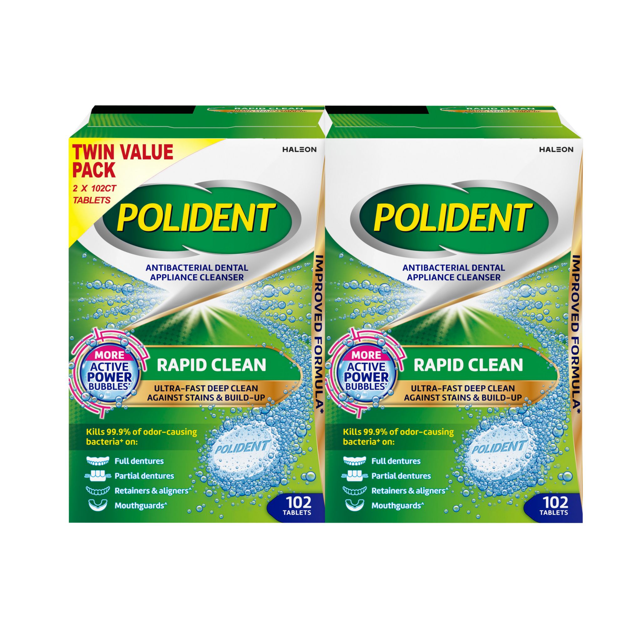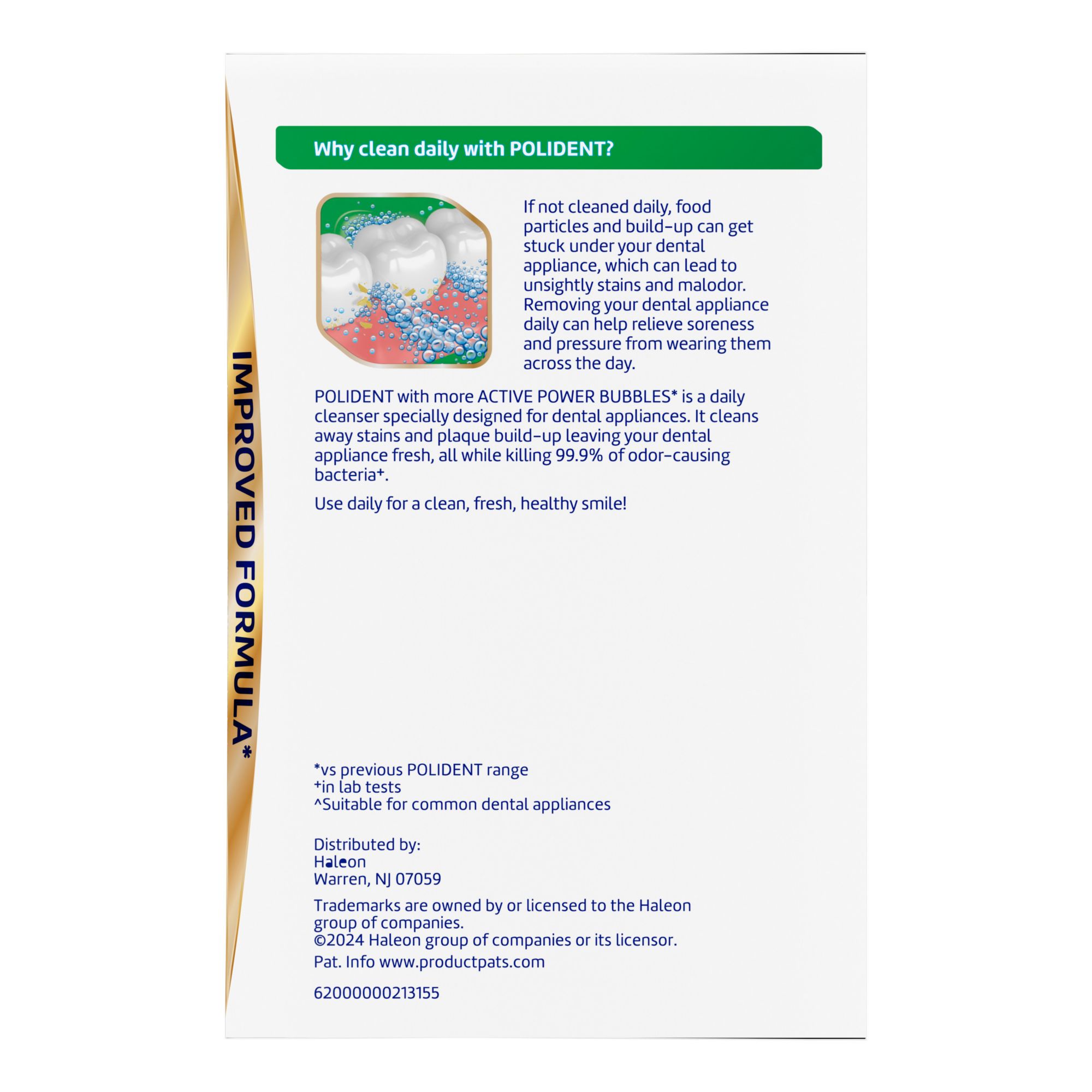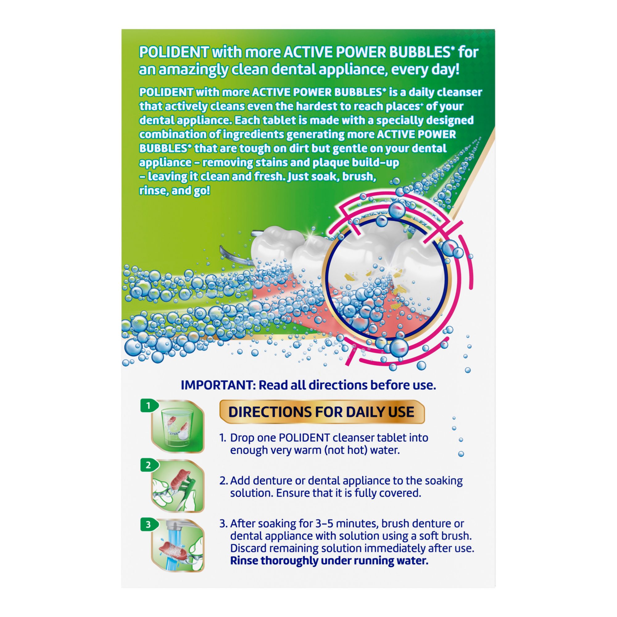 Introducing an improved formula (1) from Polident, the #1 dentist recommended dental appliance cleansing brand, now with more active power bubbles (1) for an amazingly clean dental appliance every day! Polident Rapid Clean Antibacterial Dental Appliance Cleanser kills 99.9% of odor-causing bacteria (2) with a specially designed formula for dental appliances, including full dentures, partial dentures, retainers, aligners, and mouthguards (3). Offering a 360-degree deep clean (4), the active power bubbles in Polident Dental Appliance cleansers actively clean even the hardest to reach places (2) and keep your dental appliance fresher for longer (5). Each tablet is tough on dirt but gentle on your dental appliance - removing stains and plaque build-up (6). Directions for daily use: drop one Polident cleanser tablet into enough very warm (not hot) water. Add denture or dental appliance to the soaking solution. Ensure that it is fully covered. After soaking for 3- 5 minutes, brush denture or dental appliance with solution using a soft brush. Discard remaining solution immediately after use. Rinse thoroughly under running water. Use Polident Rapid Clean Antibacterial Dental Cleanser Tablets daily for the best clean and a fresh, healthy smile. (1) Vs. previous Polident range (2) In laboratory tests (3) Suitable for common dental appliances (4) When used as directed (5) Vs. no tablet (6) when used daily instead of weekly.