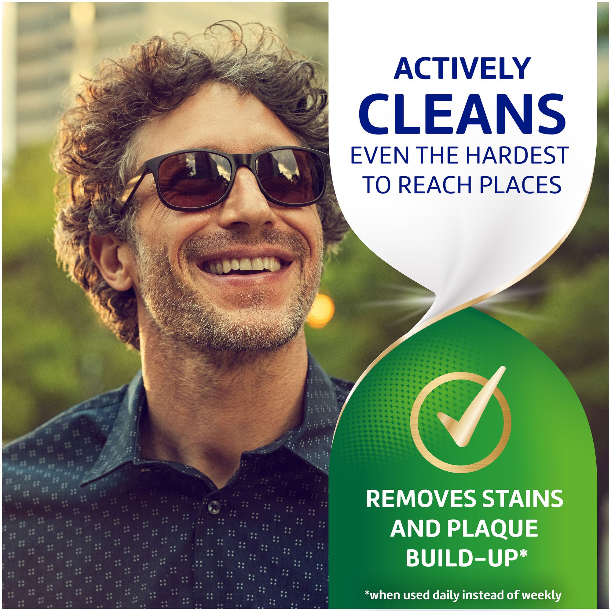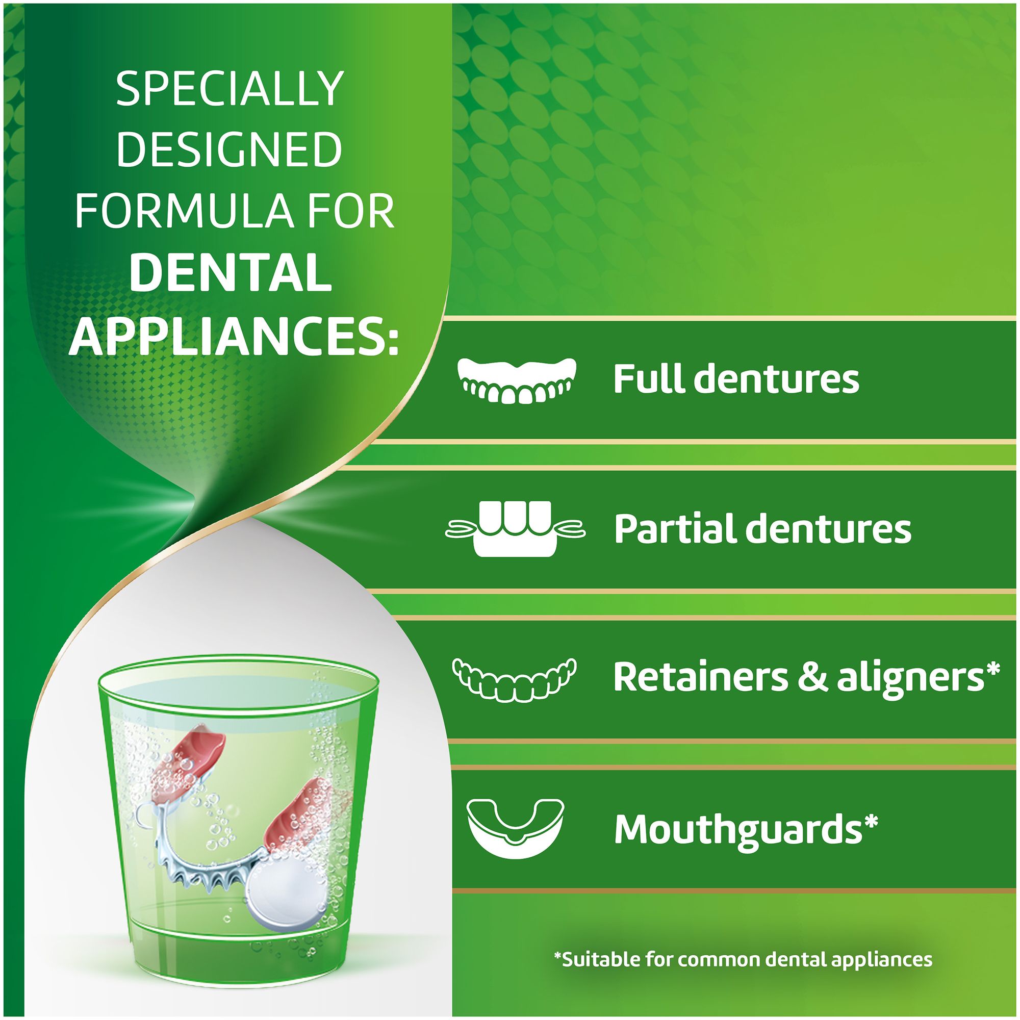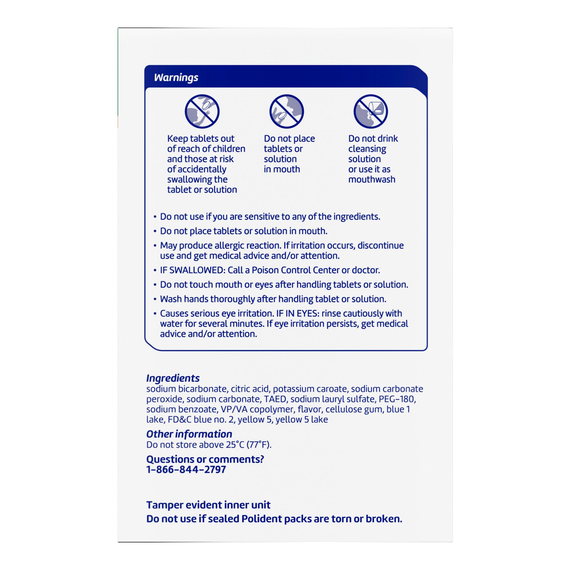 Introducing an improved formula (1) from Polident, the #1 dentist recommended dental appliance cleansing brand, now with more active power bubbles (1) for an amazingly clean dental appliance every day! Polident Rapid Clean Antibacterial Dental Appliance Cleanser kills 99.9% of odor-causing bacteria (2) with a specially designed formula for dental appliances, including full dentures, partial dentures, retainers, aligners, and mouthguards (3). Offering a 360-degree deep clean (4), the active power bubbles in Polident Dental Appliance cleansers actively clean even the hardest to reach places (2) and keep your dental appliance fresher for longer (5). Each tablet is tough on dirt but gentle on your dental appliance - removing stains and plaque build-up (6). Directions for daily use: drop one Polident cleanser tablet into enough very warm (not hot) water. Add denture or dental appliance to the soaking solution. Ensure that it is fully covered. After soaking for 3- 5 minutes, brush denture or dental appliance with solution using a soft brush. Discard remaining solution immediately after use. Rinse thoroughly under running water. Use Polident Rapid Clean Antibacterial Dental Cleanser Tablets daily for the best clean and a fresh, healthy smile. (1) Vs. previous Polident range (2) In laboratory tests (3) Suitable for common dental appliances (4) When used as directed (5) Vs. no tablet (6) when used daily instead of weekly.