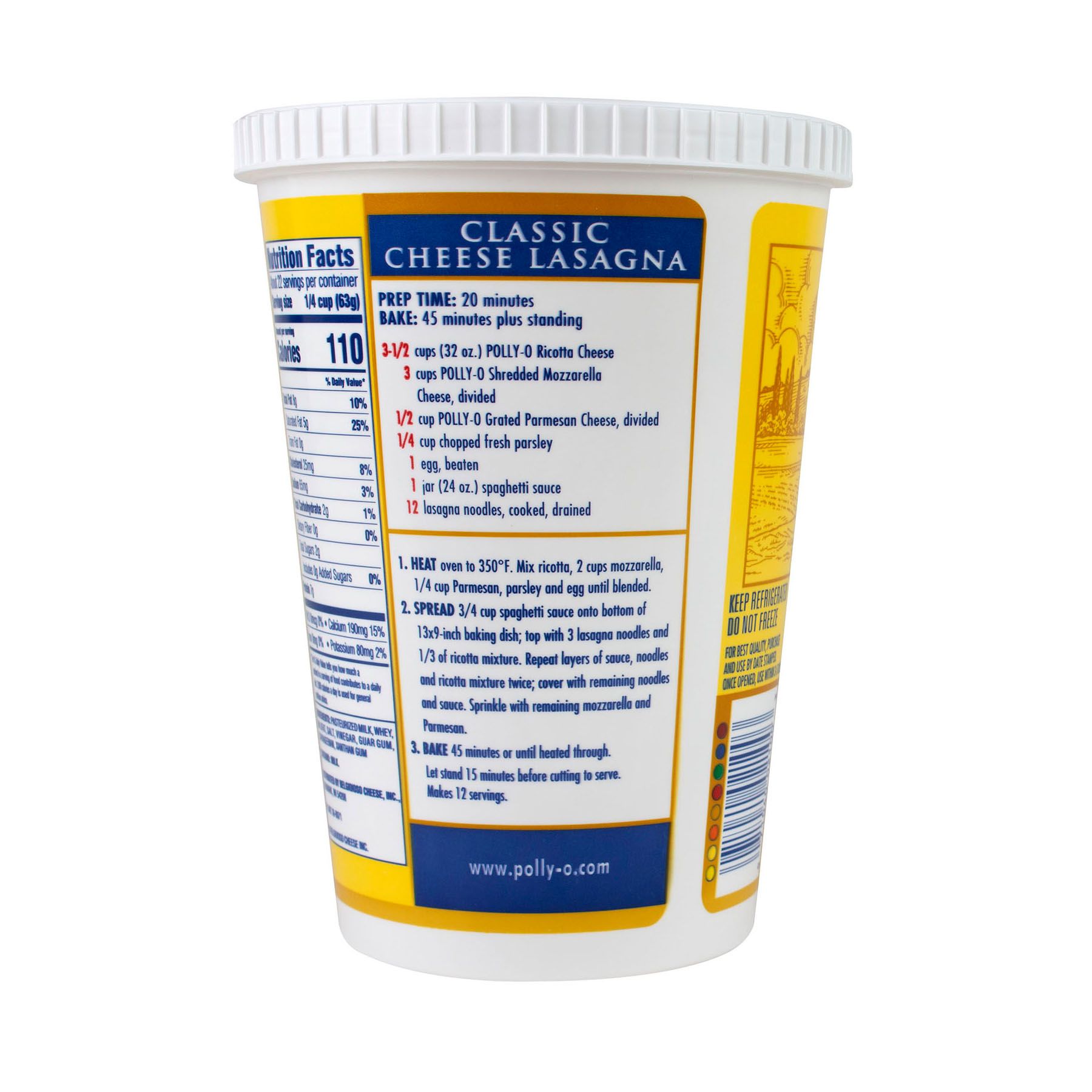 Value size of classic Polly-O Ricotta Delicately seasoned with salt for great taste Use Polly-O Ricotta in all your favorite Italian recipes Good Source of Calcium Prepared with supreme quality pasteurized milk