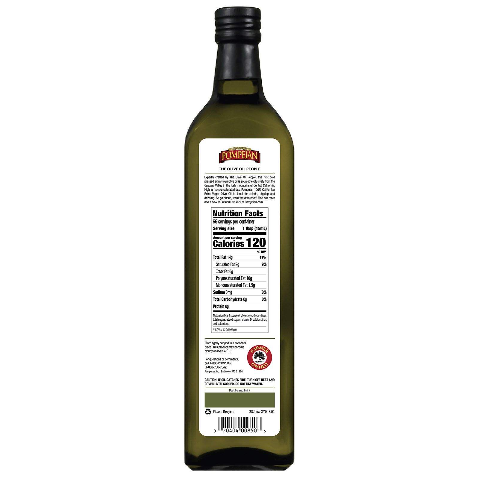 100% sourced from California - Pompeian California EVOO is a good source of vitamin E, omega 3's and 6's A healthy substitute for vegetable oil, corn oil, and butter Shelf life 540 days at manufacture Theme extra virgin olive oil Naturally gluten-free and non-allergenic Olive oil can help protect against heart disease and lower cholesterol and blood pressure EVOO contains polyphenols, antioxidants that can fight inflammation, a leading cause of cancer, and may also prevent or delay the onset of Alzheimer's disease EVOO: the ultimate skin solution - as nature's first skin moisturizer, EVOO penetrates the skin deeply. Try adding EVOO to your lotion for extra moisture Plus, since EVOO absorbs deeply into the skin and provides a cleansing effect, you can use it as a natural makeup remover Give your hair a little TLC by mixing EVOO with your favorite essential oils for an at-home deep conditioning treatment Reduce stress by making your oil candle, using EVOO and essential oils. Light it up and rela Quality UDSA monitored and non GMO project verified Includes one bottle of 100% California Extra virgin olive oil