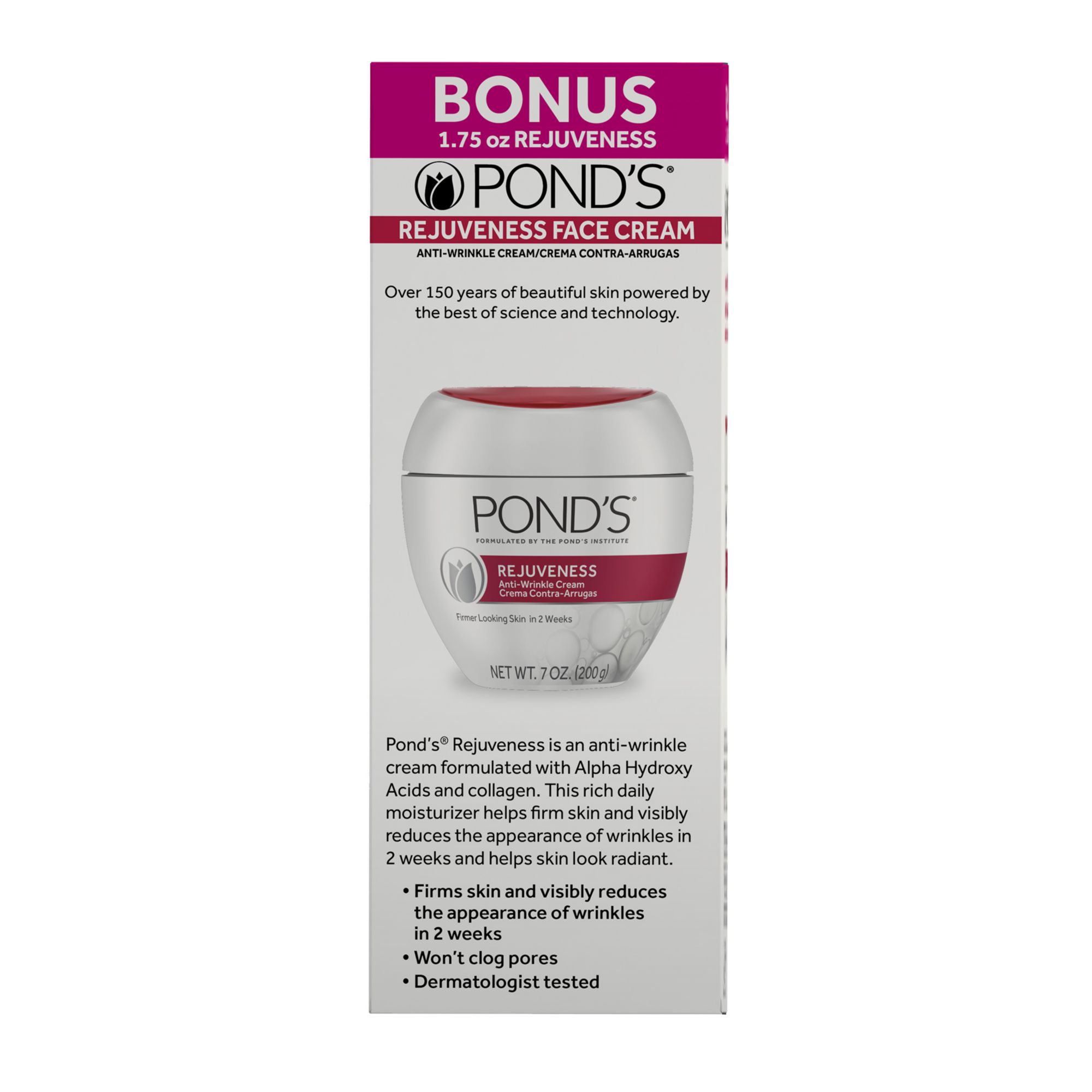 Dermatologist tested Hypoallergenic, won't clog pores Anti-Aging cream suitable for daily use Includes (2) 7 oz. jars of Ponds Rejuveness + 1.75 oz. Bonus of Ponds RejuvenessAnti-Wrinkle Cream