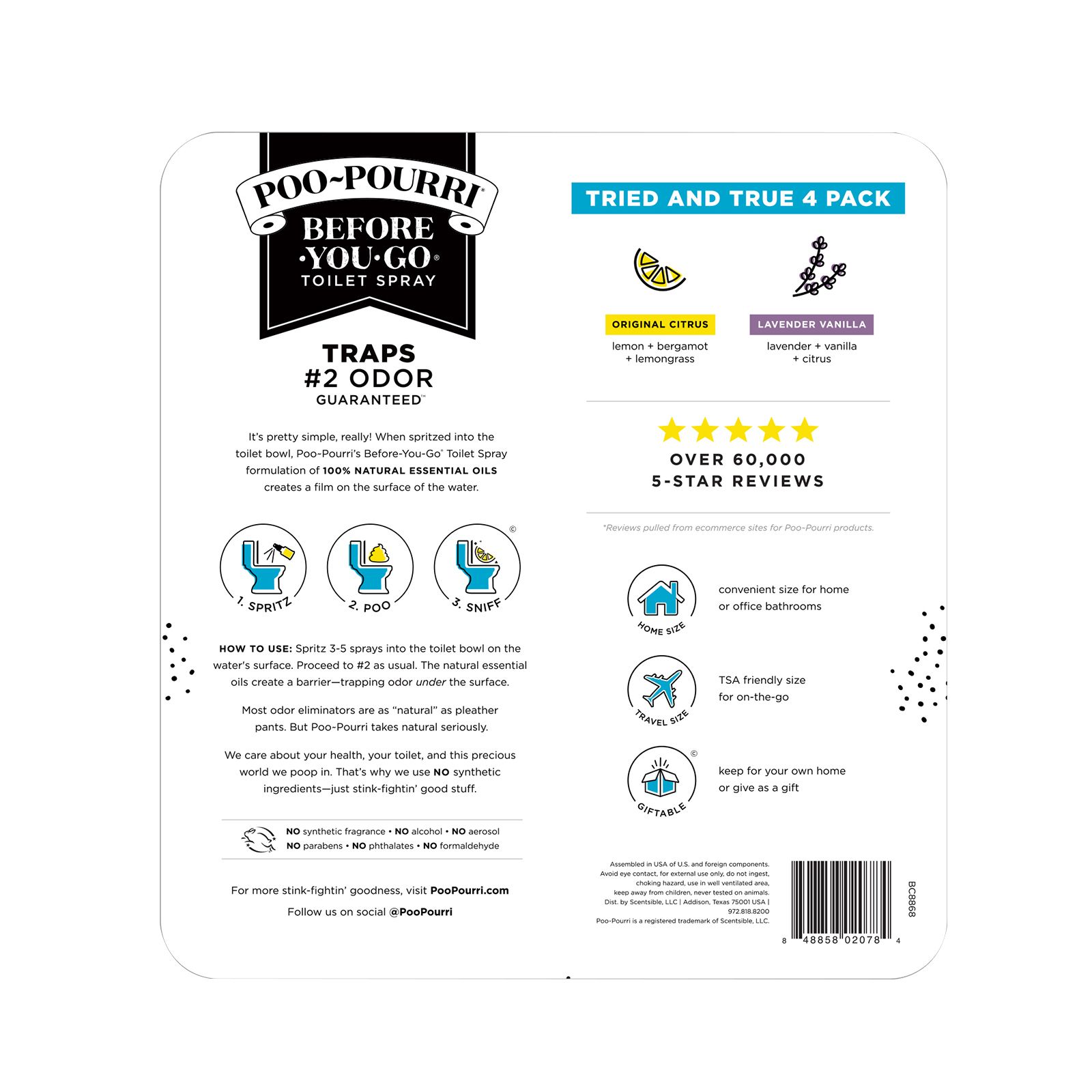 Spritz the Bowl Before You Go and No One Else Will Ever Know! To own the throne: Spritz 3-5 sprays into the toilet bowl on the water’s surface. Proceed to use the throne as usual. The natural essential oils create a barrier trapping odor under the surface, before it begins! It’s only natural. Most odor eliminators are as “natural” as pleather pants - but not Poo~Pourri. When we say natural, we actually mean it. Made with a blend of NATURAL ESSENTIAL OILS and other top secret ingredients, our revolutionary Before-You-Go Toilet Spray makes going #2 easy-breezy without making you sneezy. Contains no harsh chemicals, no parabens, no phthalates, no aerosols, and no formaldehyde—ALL stink-fightin' good stuff!