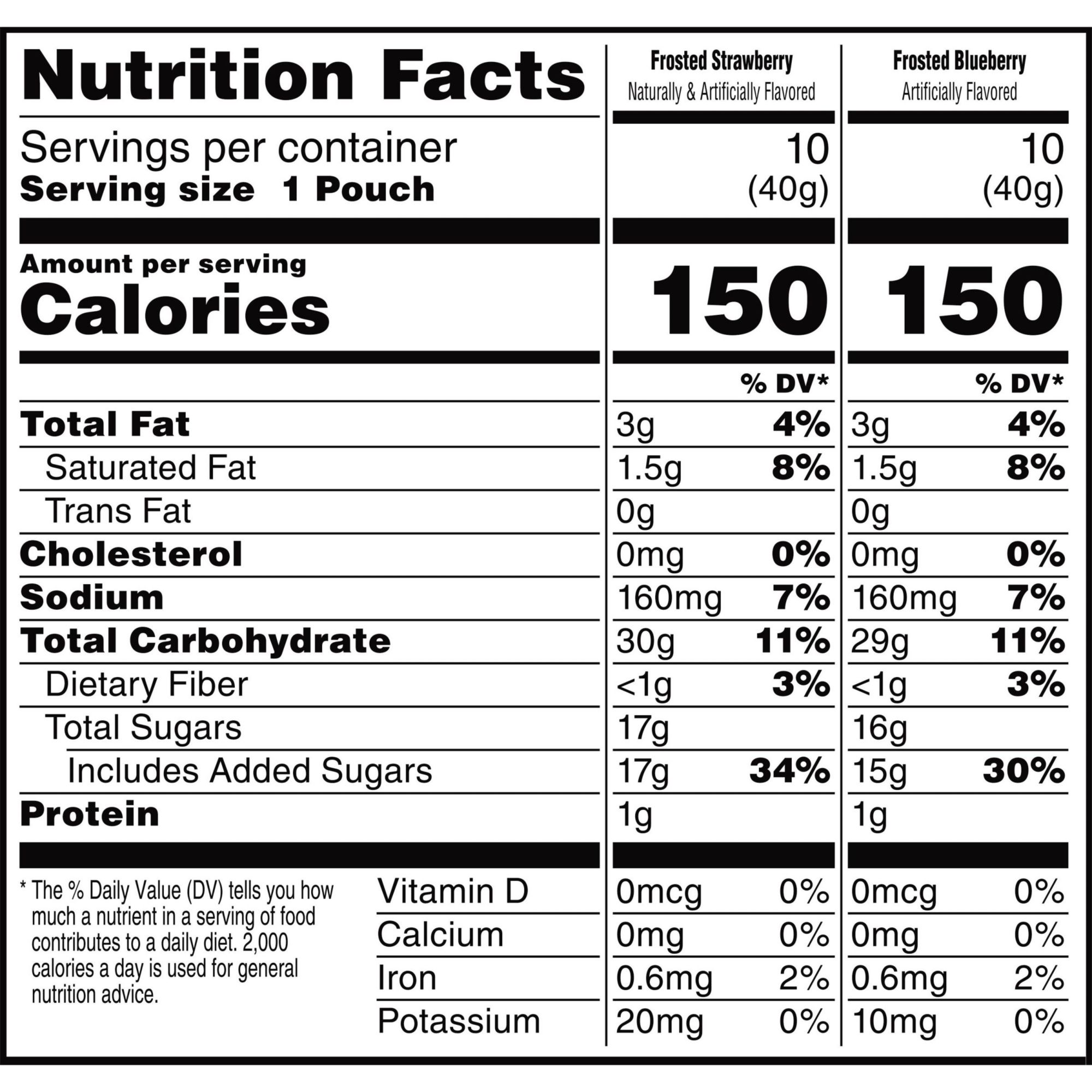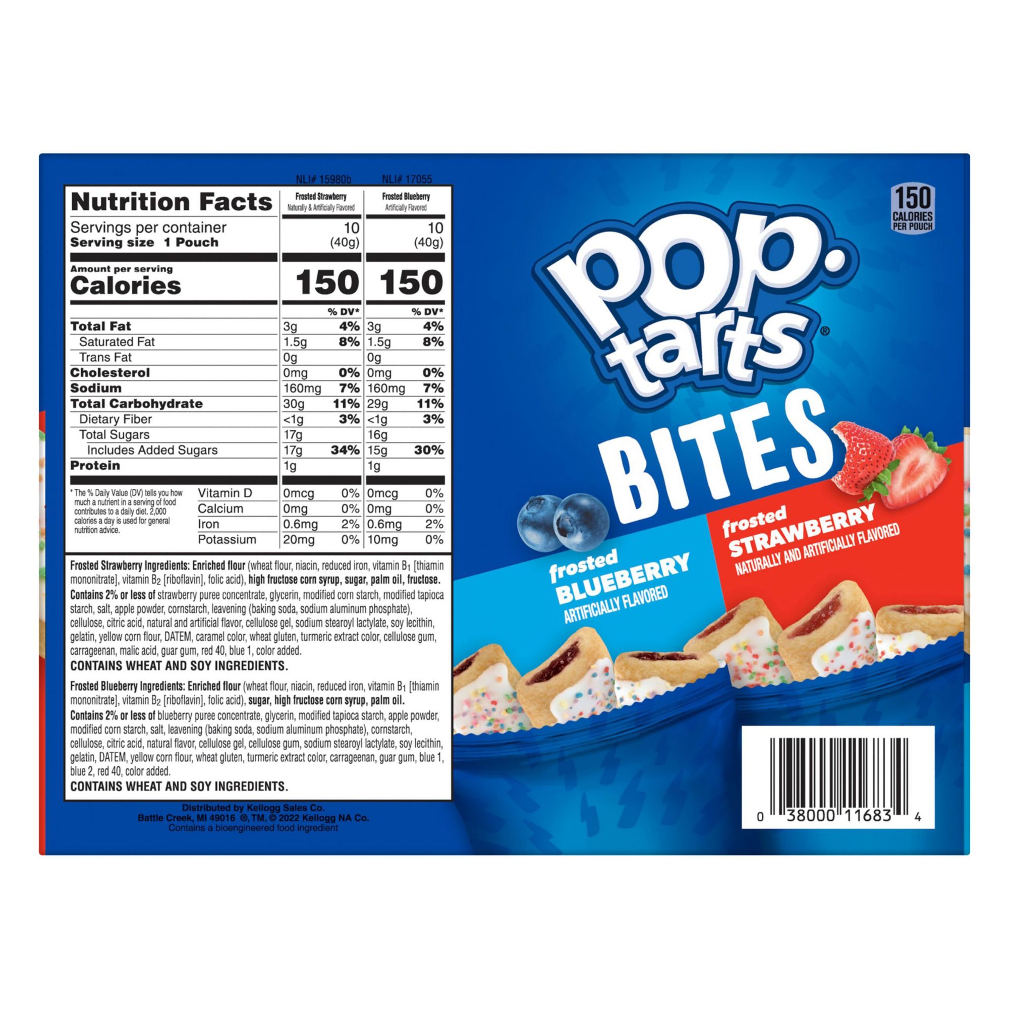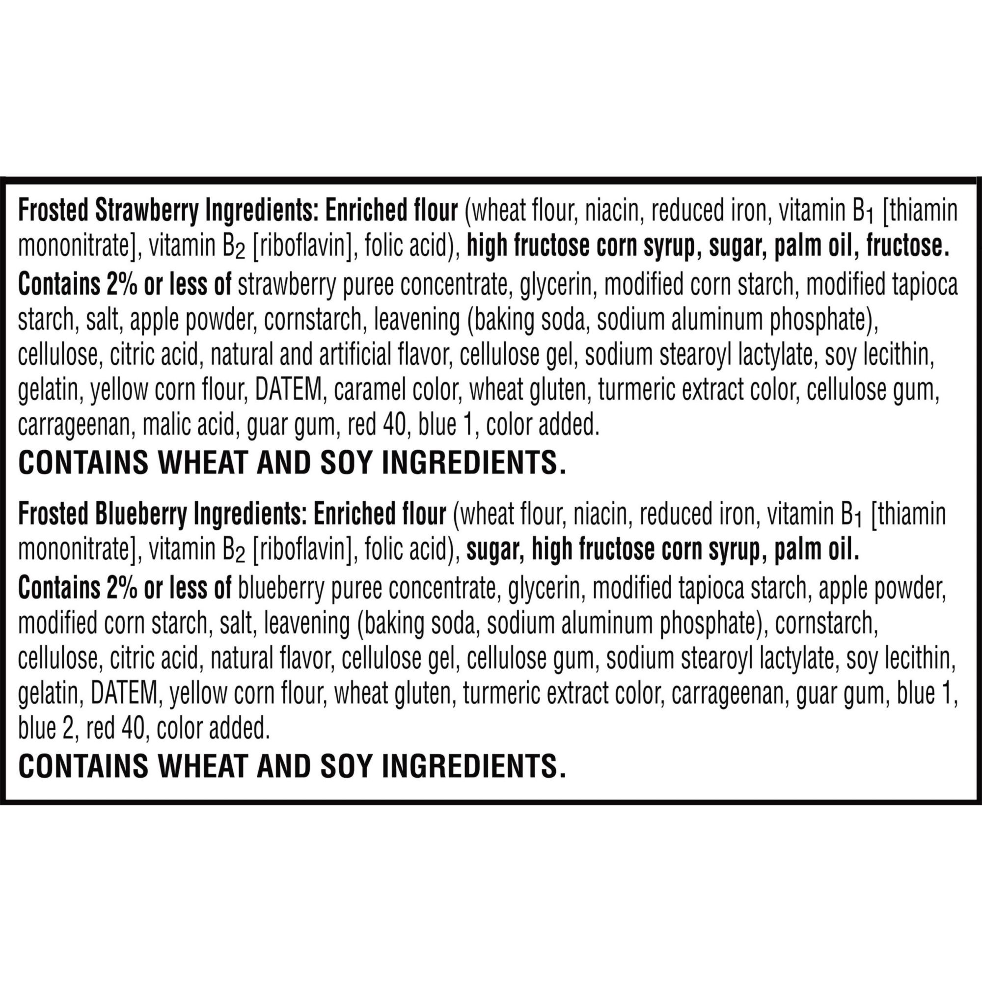 Ingredients: Frosted Blueberry: Enriched Flour (Wheat Flour, Niacin, Reduced Iron, Vitamin B1 [Thiamin Mononitrate], Vitamin B2 [Riboflavin], Folic Acid), Sugar, High Fructose Corn Syrup, Palm Oil. Contains 2% Or Less Of Blueberry Puree Concentrate, Glycerin, Modified Tapioca Starch, Apple Powder, Modified Corn Starch, Salt, Leavening (Baking Soda, Sodium Aluminum Phosphate), Cornstarch, Cellulose, Citric Acid, Natural Flavor, Cellulose Gel, Cellulose Gum, Sodium Stearoyl Lactylate, Soy Lecithin, Gelatin, Datem, Yellow Corn Flour, Wheat Gluten, Turmeric Extract Color, Carrageenan, Guar Gum, Blue 1, Blue 2, Red 40, Color Added. Frosted Strawberry: Enriched Flour (Wheat Flour, Niacin, Reduced Iron, Vitamin B1 [Thiamin Mononitrate], Vitamin B2 [Riboflavin], Folic Acid), High Fructose Corn Syrup, Sugar, Palm Oil, Fructose. Contains 2% Or Less Of Strawberry Puree Concentrate, Glycerin, Modified Corn Starch, Modified Tapioca Starch, Salt, Apple Powder, Cornstarch, Leavening (Baking Soda, Sodium Aluminum Phosphate), Cellulose, Citric Acid, Natural And Artificial Flavor, Cellulose Gel, Sodium Stearoyl Lactylate, Soy Lecithin, Gelatin, Yellow Corn Flour, Datem, Caramel Color, Wheat Gluten, Turmeric Extract Color, Cellulose Gum, Carrageenan, Malic Acid, Guar Gum, Red 40, Blue 1, Color Added.