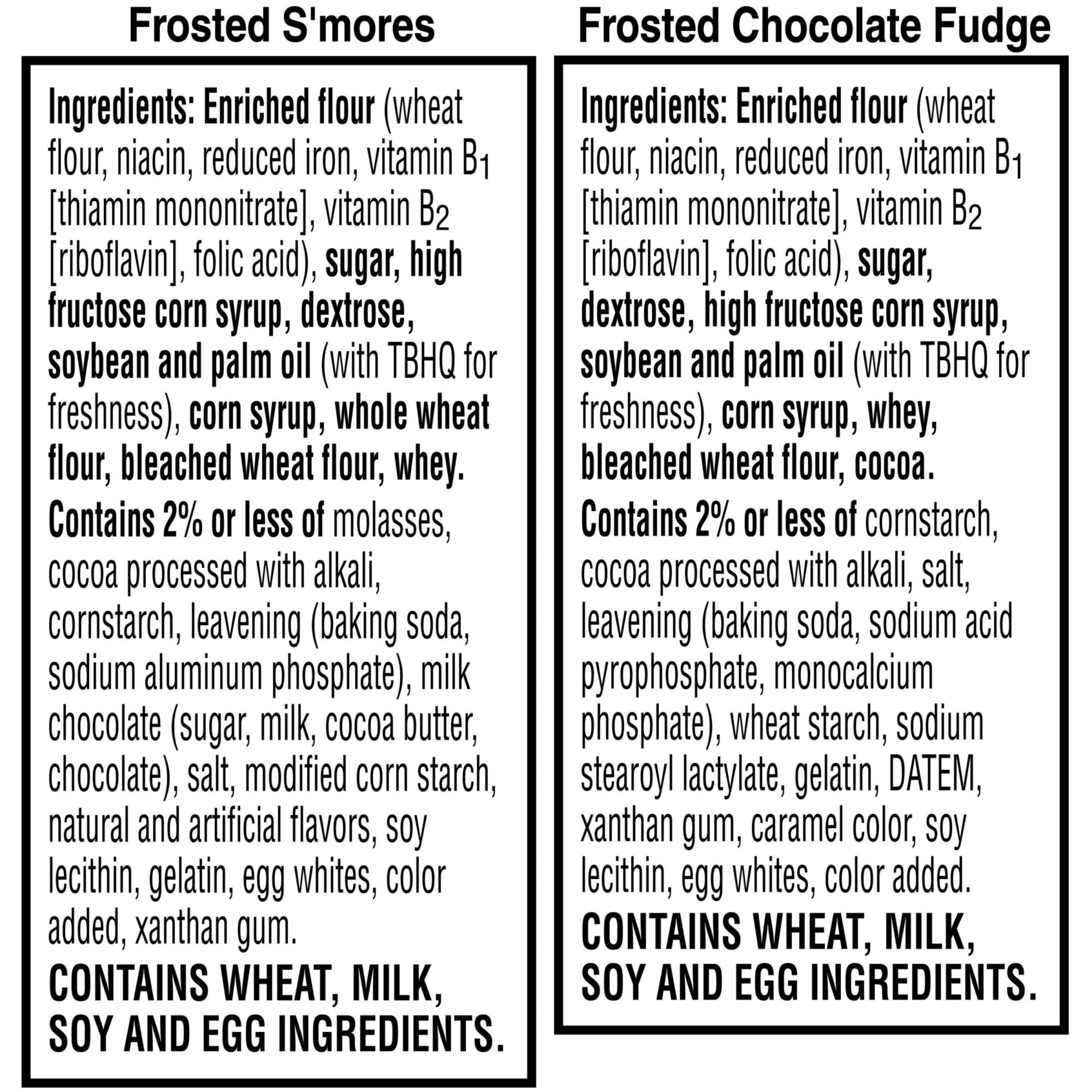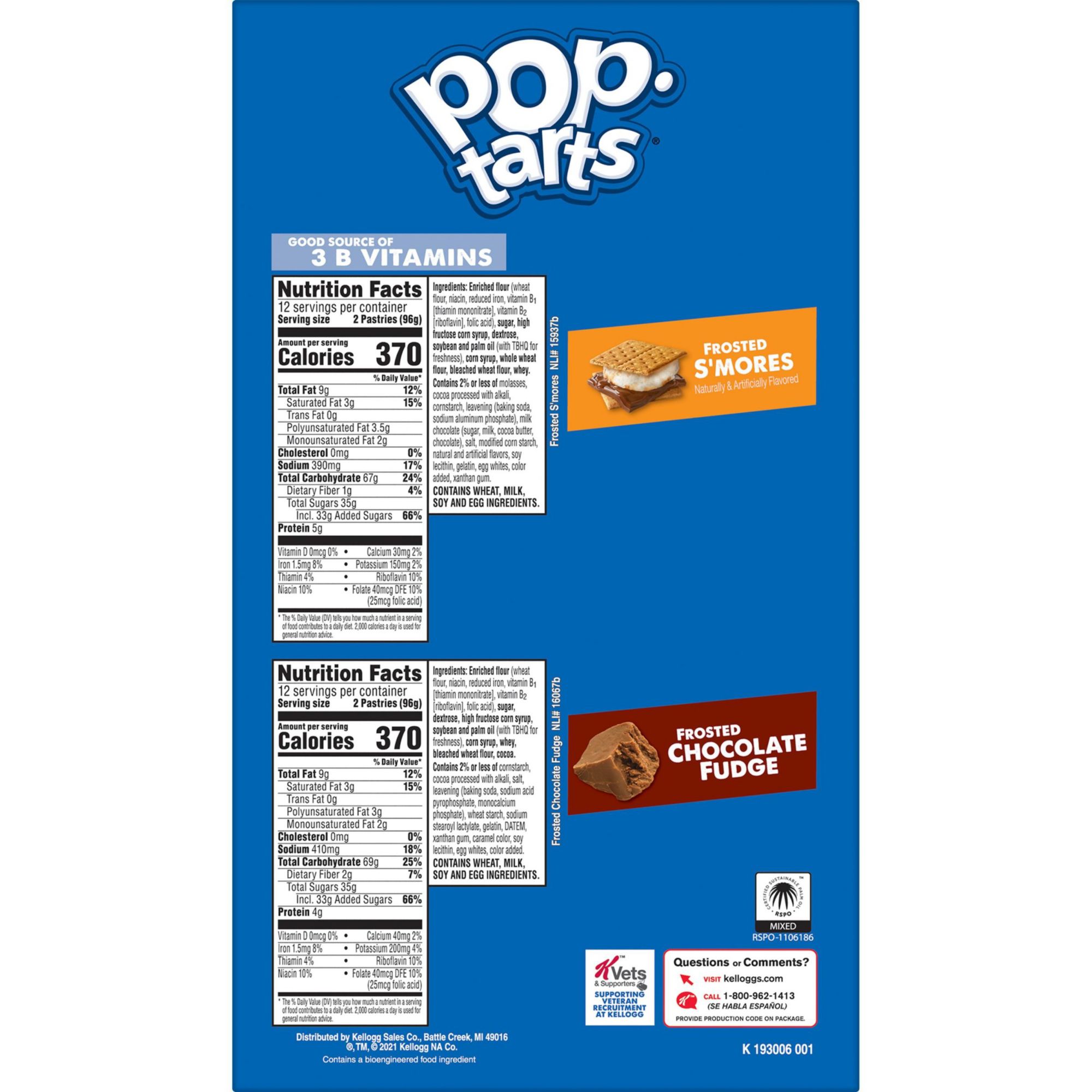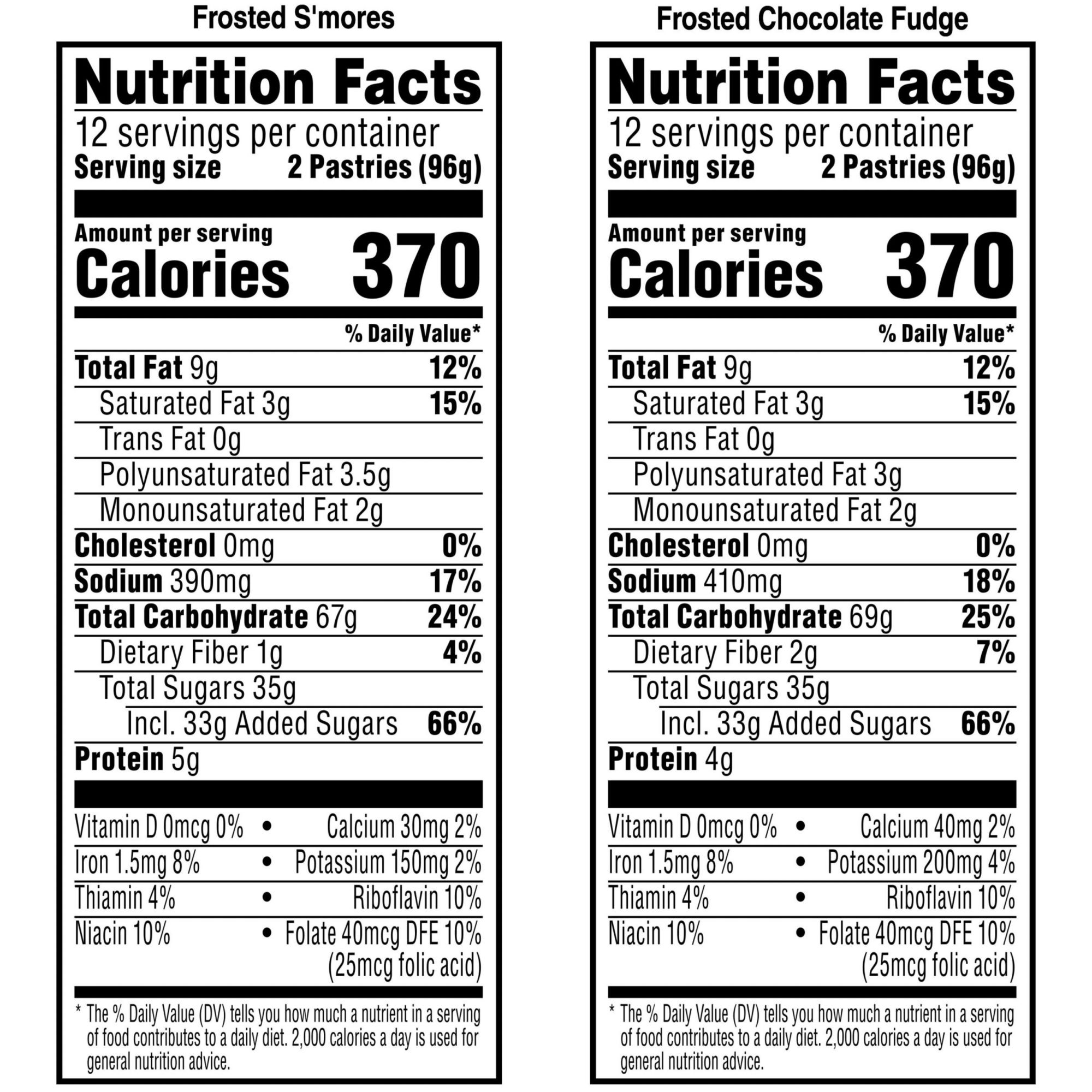 Pop-Tarts Frosted S'mores and Frosted Chocolate Fudge toaster pastries are a delicious treat to look forward to. Jump-start your day with either a sweet, gooey s'mores-flavored filling or decadent blast of gooey, chocolate fudge-flavored center, both encased in a crumbly pastry crust and topped with yummy frosting. A quick and tasty anytime snack for the whole family, Pop-Tarts toaster pastries are an ideal companion for lunchboxes, after-school snacks, and busy, on-the-go moments. Not just for mornings, the versatile deliciousness of Pop-Tarts fits into your lifestyle just about anywhere there's time for a snack. Store them in your desk drawer for a pick-me-up at the office, keep them on hand in your pantry for a sweet after-dinner treat, or even bring some in the car for a satisfying snack on the road. These toaster pastries also make welcome additions to care packages, goodie bags, and gift baskets - a pleasant surprise friends and family will be delighted to unwrap. Just pop them in your toaster for a crisp, warm crust, heat them in the microwave, or enjoy them straight out of the foil with a glass of ice-cold milk.