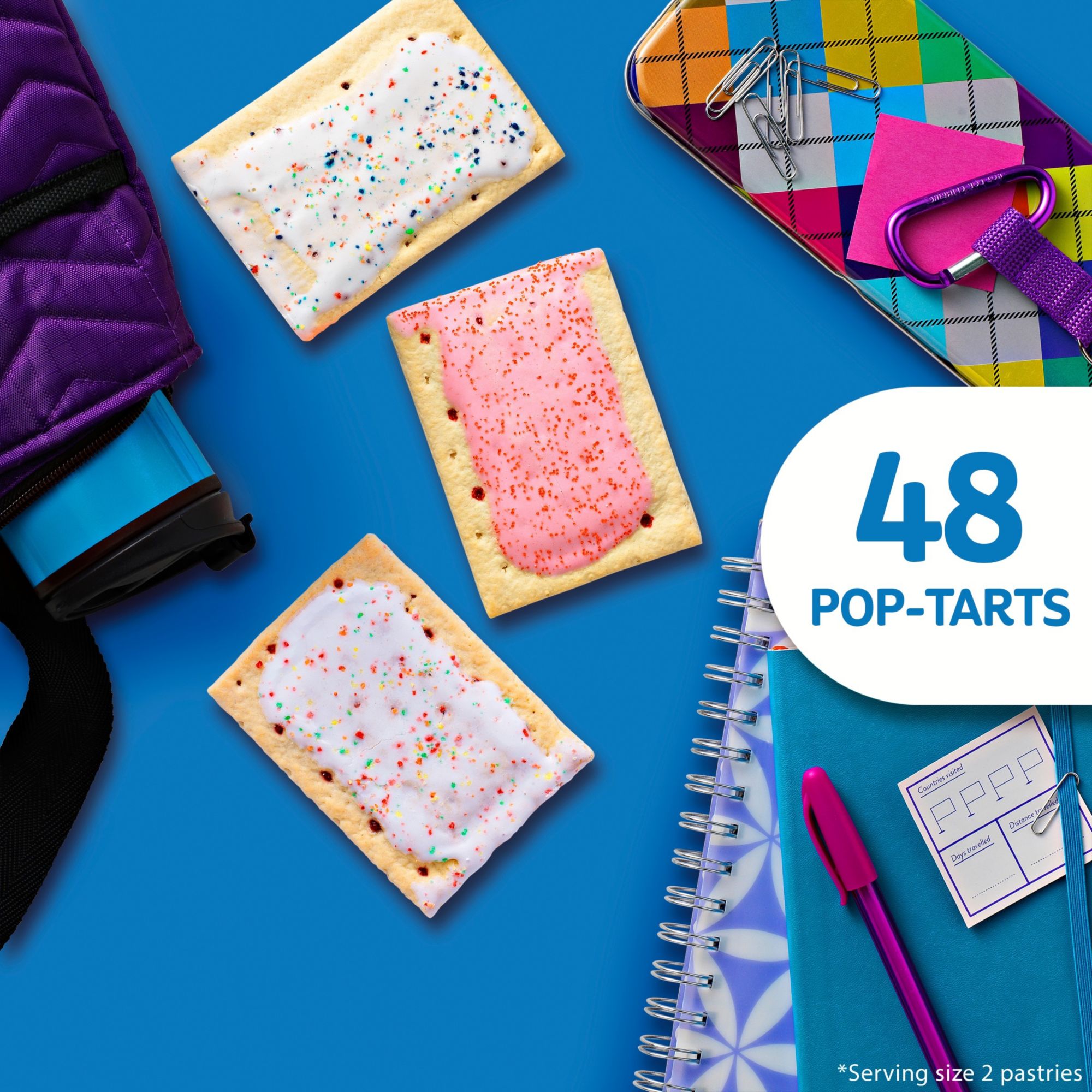 Includes 24 packages total, two pastries per package; 24 strawberry, 12 cherry, 12 blueberry