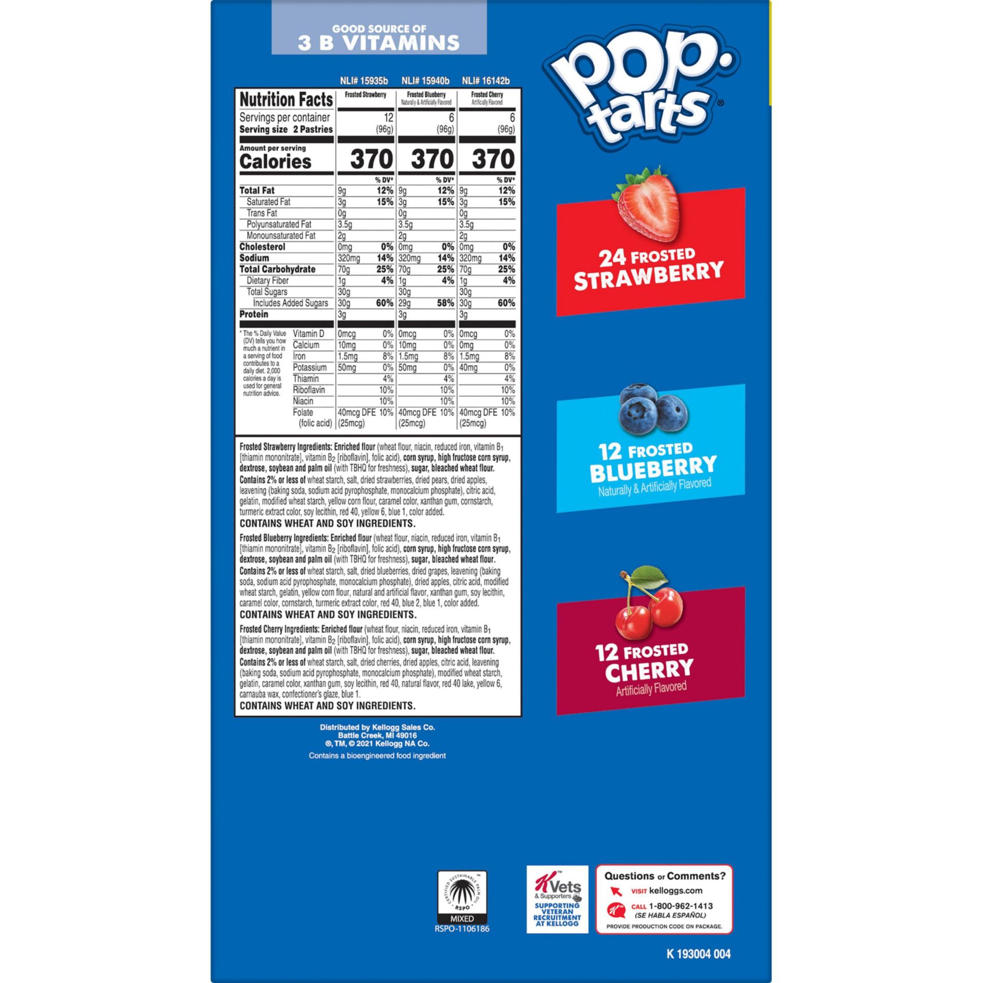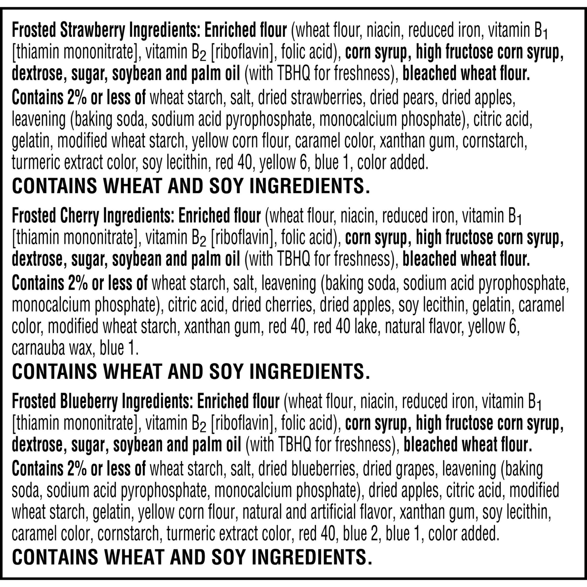 Ingredients:Strawberry: Enriched Flour (Wheat Flour, Niacin, Reduced Iron, Vitamin B1 [Thiamin Mononitrate], Vitamin B2 [Riboflavin], Folic Acid), Corn Syrup, High Fructose Corn Syrup, Dextrose, Soybean And Palm Oil (With Tbhq For Freshness), Sugar, Cracker Meal, Contains Two Percent Or Less Of Wheat Starch, Salt, Dried Strawberries, Dried Pears, Dried Apples, Leavening (Baking Soda, Sodium Acid Pyrophosphate, Monocalcium Phosphate), Citric Acid, Milled Corn, Gelatin, Soybean Oil, Modified Corn Starch, Caramel Color, Soy Lecithin, Xanthan Gum, Modified Wheat Starch, Vitamin A Palmitate, Red 40, Niacinamide, Reduced Iron, Color Added, Turmeric Extract, Vitamin B6 (Pyridoxine Hydrochloride), Yellow 6, Vitamin B2 (Riboflavin), Vitamin B1 (Thiamin Hydrochloride), Blue 1 Blueberry: Enriched Flour (Wheat Flour, Niacin, Reduced Iron, Vitamin B1 [Thiamin Mononitrate], Vitamin B2 [Riboflavin], Folic Acid), Corn Syrup, High Fructose Corn Syrup, Dextrose, Soybean And Palm Oil (With Tbhq For Freshness), Sugar, Cracker Meal, Contains Two Percent Or Less Of Wheat Starch, Salt, Dried Blueberries, Dried Grapes, Dried Apples, Leavening (Baking Soda, Sodium Acid Pyrophosphate, Monocalcium Phosphate), Citric Acid, Milled Corn, Gelatin, Soybean Oil, Modified Corn Starch, Modified Wheat Starch, Soy Lecithin, Xanthan Gum, Caramel Color, Red 40, Vitamin A Palmitate, Niacinamide, Reduced Iron, Natural And Artificial Flavor, Blue 2, Blue 1, Vitamin B6 (Pyridoxine Hydrochloride), Color Added, Turmeric Extract, Vitamin B2 (Riboflavin), Vitamin B1 (Thiamin Hydrochloride) Cherry: Enriched Flour (Wheat Flour, Niacin, Reduced Iron, Vitamin B1 [Thiamin Mononitrate], Vitamin B2 [Riboflavin], Folic Acid), Corn Syrup, High Fructose Corn Syrup, Dextrose, Soybean And Palm Oil (With Tbhq For Freshness), Sugar, Cracker Meal, Contains Two Percent Or Less Of Wheat Starch, Salt, Dried Cherries, Dried Apples, Leavening (Baking Soda, Sodium Acid Pyrophosphate, Monocalcium Phosphate), Citric Acid, Gelatin, Caramel Color, Modified Wheat Starch A Palmitate, Red 40, Niacinamide, Reduced Iron, Natural Flavor, Red 40 Lake, Vitamin B6 (Pyridoxine Hydrochloride), Yellow 6, Carnauba Wax, Vitamin B2 (Riboflavin), Vitamin B1 (Thiamin Hydrochloride), Confectioners Glaze, Blue 1