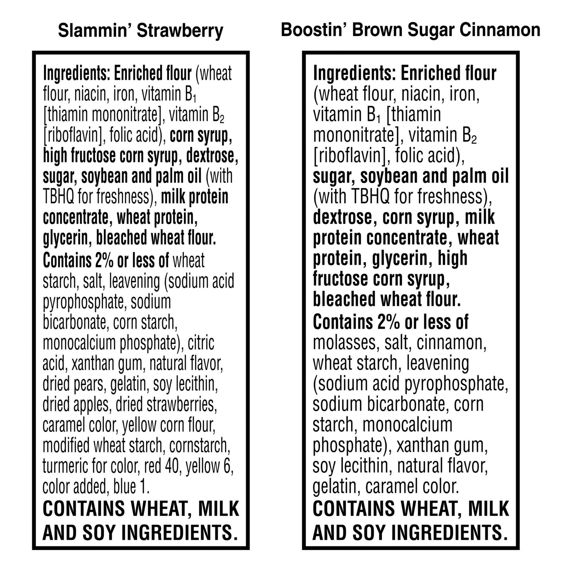 Ingredients: Enriched Flour (Wheat Flour, Niacin, Iron, Vitamin B1 [Thiamin Mononitrate], Vitamin B2 [Riboflavin], Folic Acid), Sugar, Soybean And Palm Oil (With Tbhq For Freshness), Dextrose, Corn Syrup, Milk Protein Concentrate, Wheat Protein, Glycerin, High Fructose Corn Syrup, Bleached Wheat Flour. Contains 2% Or Less Of Molasses, Salt, Cinnamon, Wheat Starch, Leavening (Sodium Acid Pyrophosphate, Sodium Bicarbonate, Corn Starch, Monocalcium Phosphate), Xanthan Gum, Soy Lecithin, Natural Flavor, Gelatin, Caramel Color. Ingredients: Enriched Flour (Wheat Flour, Niacin, Iron, Vitamin B1 [Thiamin Mononitrate], Vitamin B2 [Riboflavin], Folic Acid), Corn Syrup, High Fructose Corn Syrup, Dextrose, Sugar, Soybean And Palm Oil (With Tbhq For Freshness), Milk Protein Concentrate, Wheat Protein, Glycerin, Bleached Wheat Flour. Contains 2% Or Less Of Wheat Starch, Salt, Leavening (Sodium Acid Pyrophosphate, Sodium Bicarbonate, Corn Starch, Monocalcium Phosphate), Citric Acid, Xanthan Gum, Natural Flavor, Dried Pears, Gelatin, Soy Lecithin, Dried Apples, Dried Strawberries, Caramel Color, Yellow Corn Flour, Modified Wheat Starch, Cornstarch, Turmeric For Color, Red 40, Yellow 6, Color Added, Blue 1.