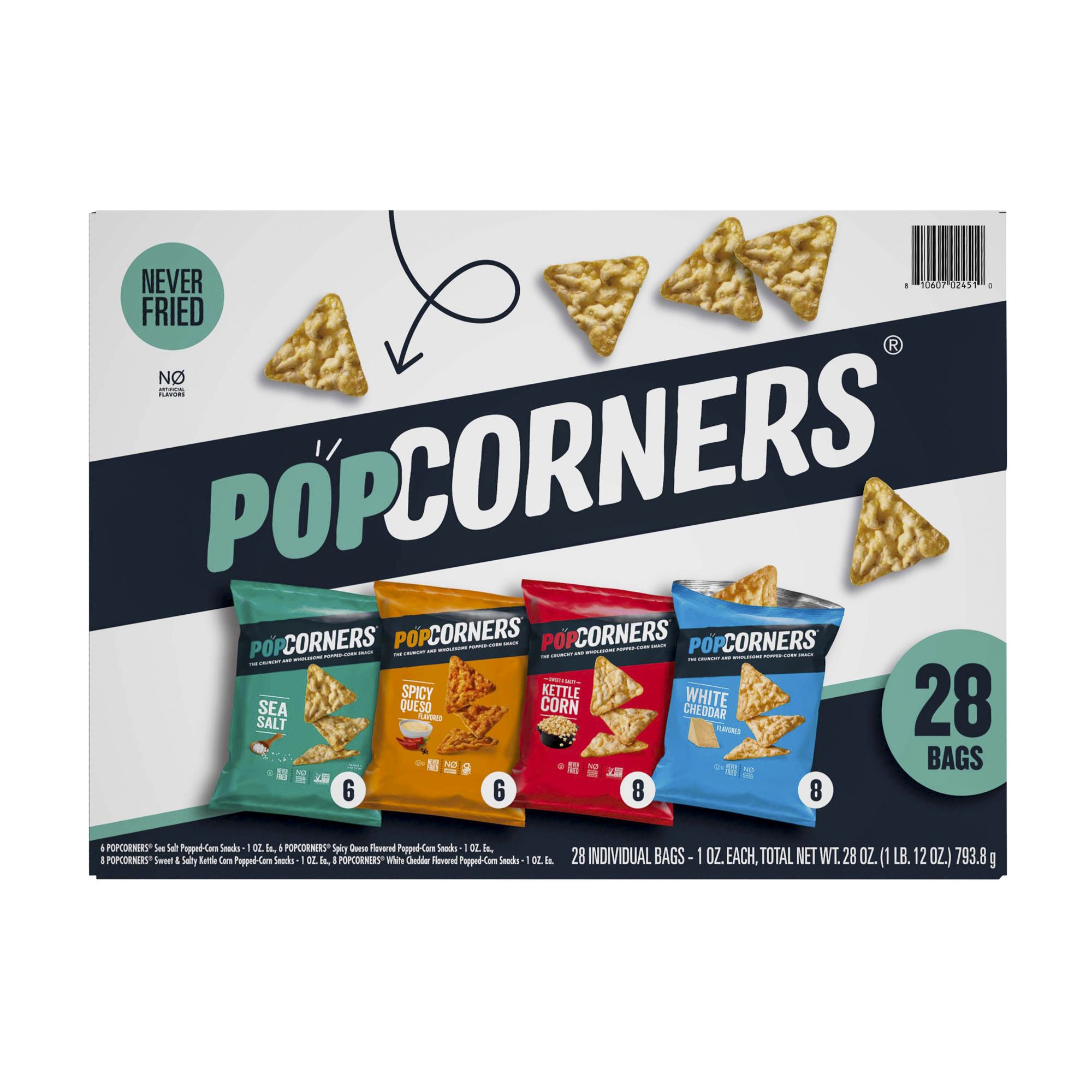 28 bag variety pack featuring Spicy Queso flavor, Sea Salt flavor, White Cheddar flavor, and Sweet and Salty Kettle Corn flavor The crunchy and wholesome popped-corn snack Snacks made with non-GMO project verified corn Never fried No nuts Gluten free Includes 28 one oz. bags of PopCorners snacks - six bags of spricy queso flavor, six bags of sea salt flavor, eight bags of white cheddar flavor, and eight bags of sweet and salty kettle corn