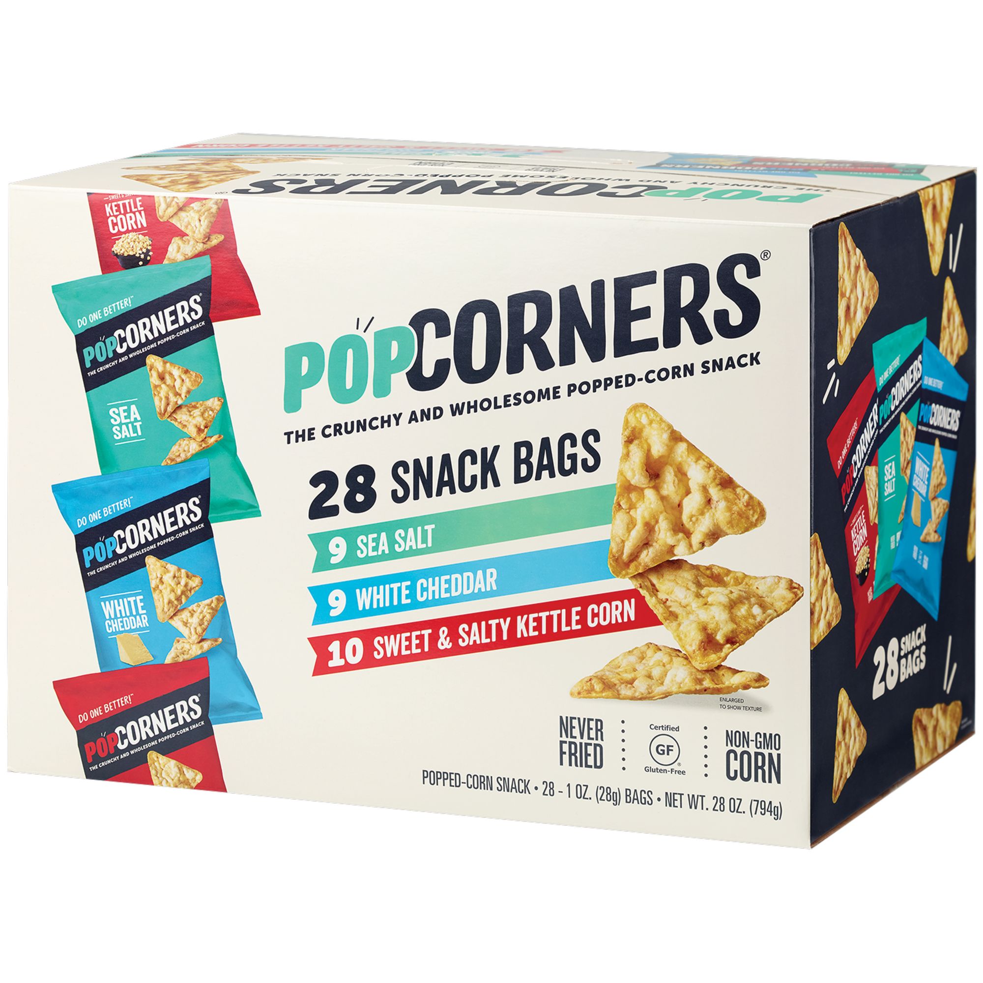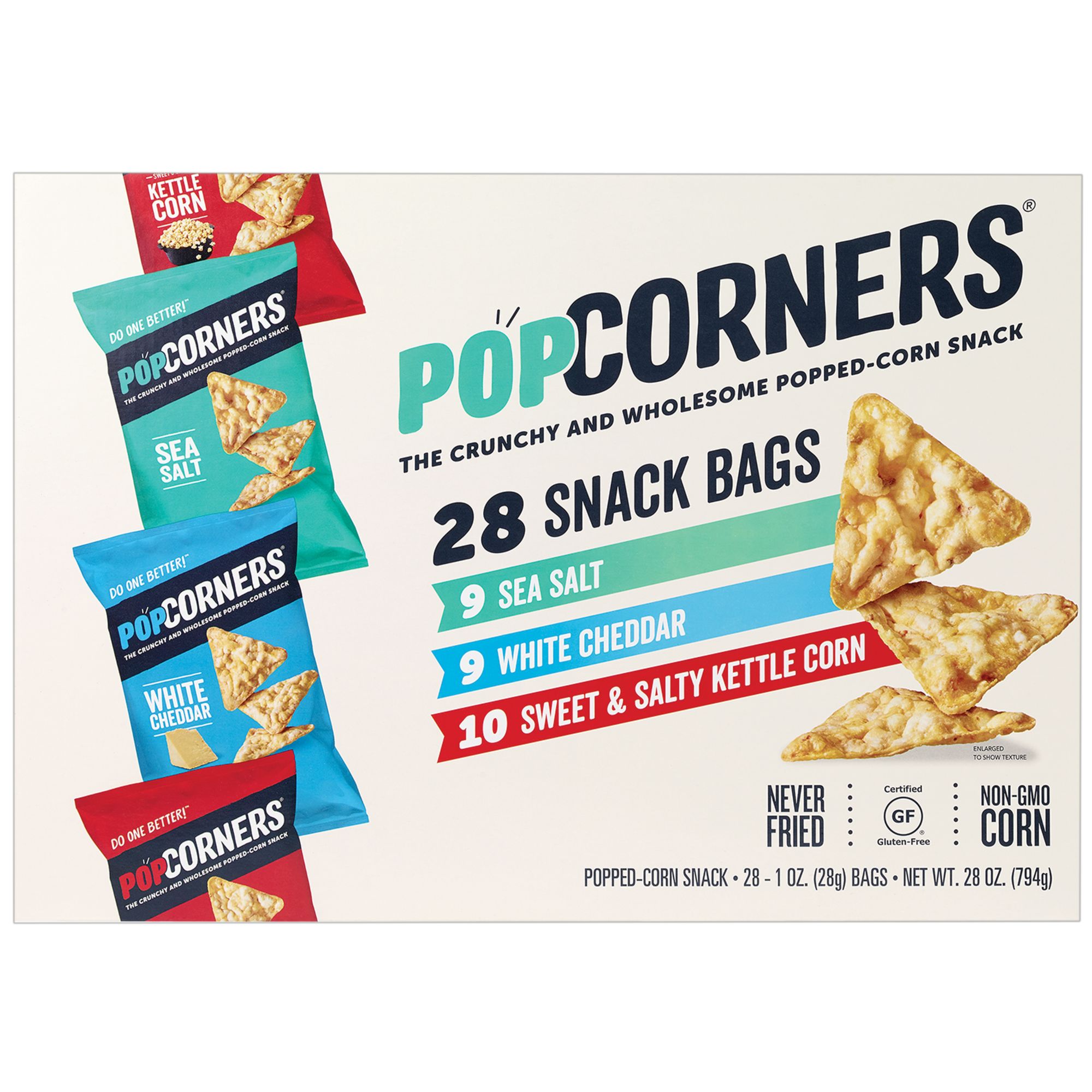 28 bag variety pack featuring sea salt flavor, white cheddar flavor, and sweet and salty kettle corn flavor The crunchy and wholesome popped-corn snack Snacks made with non-GMO project verified corn Never fried No nuts Gluten free Includes 28 one oz. bags of PopCorners snacks - nine bags of sea salt flavor, nine bags of white cheddar flavor, and 10 bags of sweet and salty kettle corn