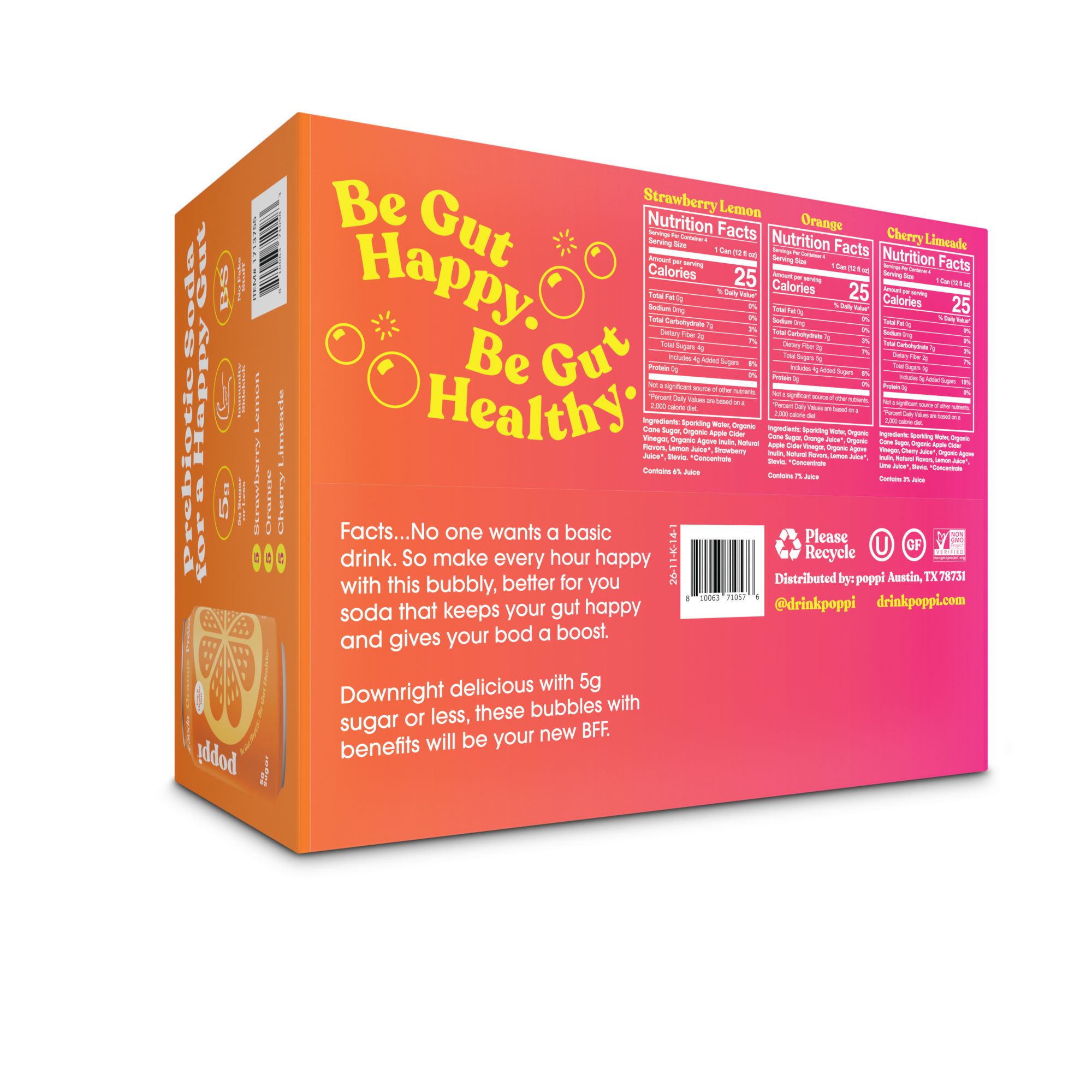 An instant iconic and zesty variety of flavors with refreshing burst and taste. With only 3g of sugar, 25 calories and no fake stuff, soda is back. Founded by husband-and-wife duo Stephen and Allison and based in Austin, TX, Poppi combines fruit juice, apple cider vinegar, and inulin prebiotics for a deliciously refreshing, full-of-flavor soda with benefits.